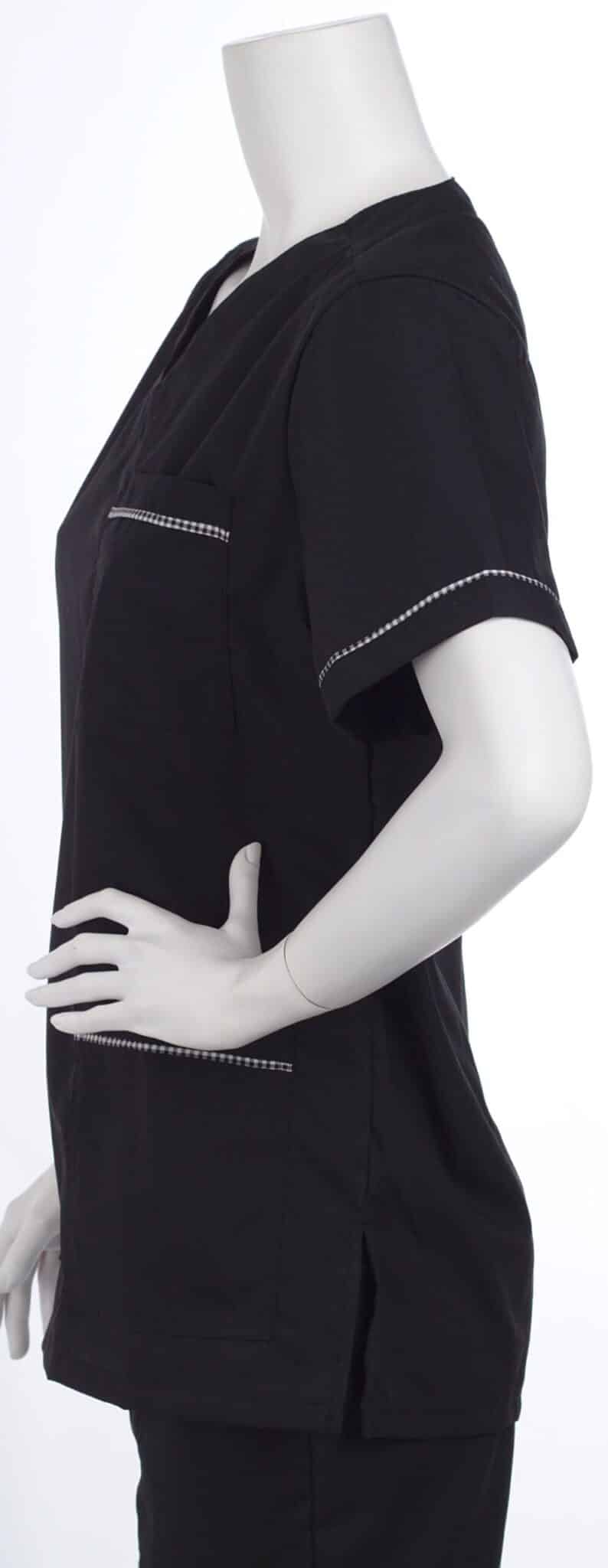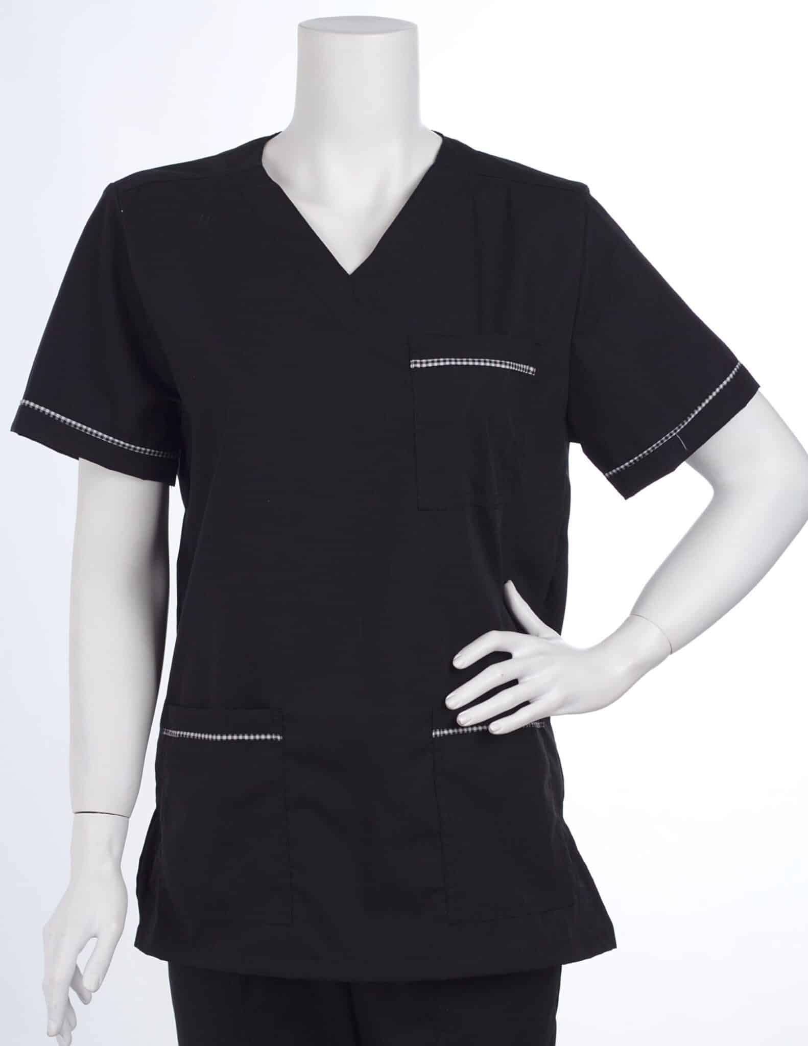 Туника с права унисекс кройка, черна с кант пепит. Стилна, удобна и практична. Туниката е с къс ръкав и остро V образно деколте. Моделът е свободен и много удобен, пасва както на мъже, така и на дами. Туника унисекс черна е много подходяща като работна униформа за медицински работници, персонал в козметични студия, работници в кухня, камериерки и още много други. Материята е лека и изключително практична. Изсъхва бързо след пране и се глади много лесно. Туниката може да бъде комбинирана с панталон унисекс пепит.