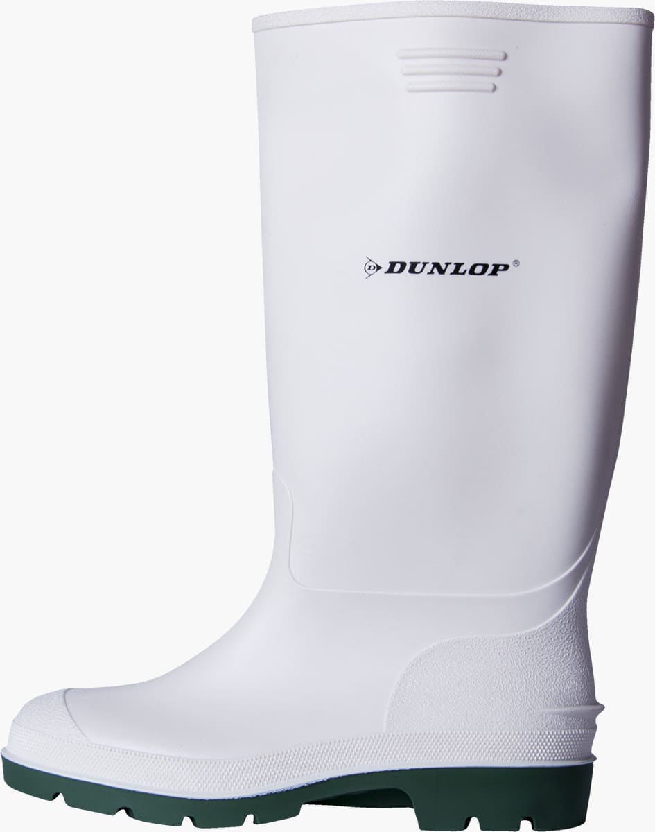Работни ботуши ПВЦ 38 см – бели Dunlop. Подплатени са с бяло трико. Моделът е изработен без стелка и има зелено ПВЦ ходило. Саята е водоотблъскваща, предпазва от замърсяване и минимални механични рискове. Разгледайте и другото ни предложение за работни ботуши Dunlop в зелен цвят.