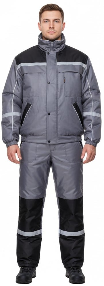 Ватиран костюм Колинс – сив, е перфектен за работа на открито или в неотопляеми помещения. Предпазва от вятър и студ.