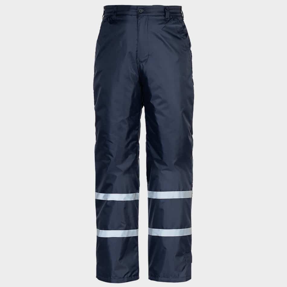 Ватиран работен панталон модел Колинс в тъмносин цвят със светлоотрзителни елементи. Този модел е отличен за част от зимната ви работна униформа. Изработен е от промазка в тъмносин цвят и има светлоотразителни елементи в долната част на крачолите. Осигурява защита от вятър и пръски вода. Моделът има общо три джоба: два странични джоба и един заден джоб от дясната страна. Закопчава се отпред с цип и има частичен ластик на кръста. Ватиран работен панталон модел Колинс в тъмносин цвят е отличен за работа на открито през зимата. Може да си го поръчате в допълнение към зимен комплект Колинс в тъмносин цвят, за да имате опция за смяна на долнището.