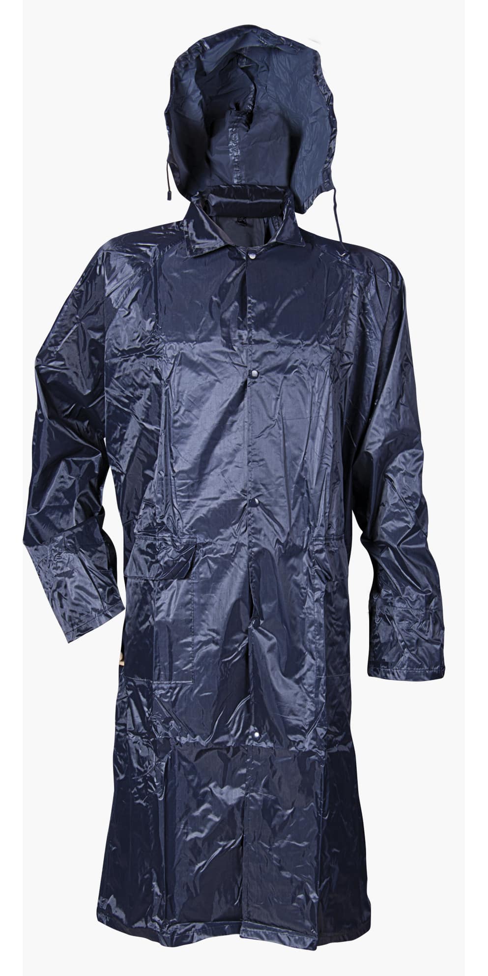 Водозащитно наметало изработено от PVC / полиамид в тъмносиньо. Моделът е дълъг и свободен, има прав силует. Снабден е с качулка с връзки за по-добро уплътняване, а закопчаването е с копчета тик-так. Водозащитното наметало се предлага и в тъмнозелен цвят. Подходящо допълнение е към работна униформа в дъждовните дни. Отлично е и за ежедневна употреба на разходка, или за добавка към екипировката ви за туризъм.