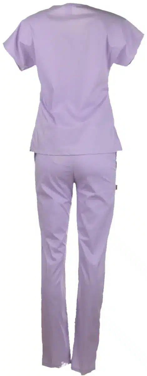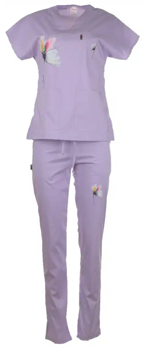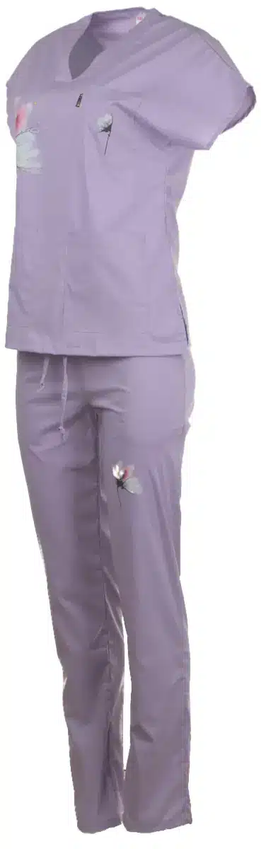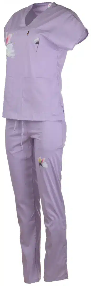 Медицински втален костюм Blossom в нежен лилав цвят. Автор на дизайна за този уникален модел е художничката Пламена Войнова, която изобразява природните мотиви по вдъхновяващ начин. Комплектът съчетава туника и панталон с вталена кройка, изработени от мека и нежна материя за удобство и лекота през работния ден. Красивите изображения са изработени чрез висококачествен дигитален печат от Тики Работно облекло. Комплектът е произведен във фирмения ни шивашки цех. Туниката има остро деколте и общо три джоба, в които може да съхранявате инструменти от първа необходимост. Панталонът подчертава деликатно фигурата ви с вталената си кройка. Изработен е с два италиански джоба, има ластик и връзки на кръста. Осигурете си комфорт съчетан с елегантна визия в медицински втален костюм Blossom в лилав цвят. Може да го поръчате лесно онлайн или да посетите фирмените ни магазини в страната. Този модел изработваме също в розово и в цвят тюркоаз. Имате възможност да поръчате и по отделно туника и панталон Blossom. Може да комбинирате различни цветове на туниката и панталона. За да завършите медицинската си униформа, поръчайте от нас и брандиране с логото на медицинското заведение. Може да персонализираме медицинската ви туника с печат име или длъжността ви, поставени върху джоба.