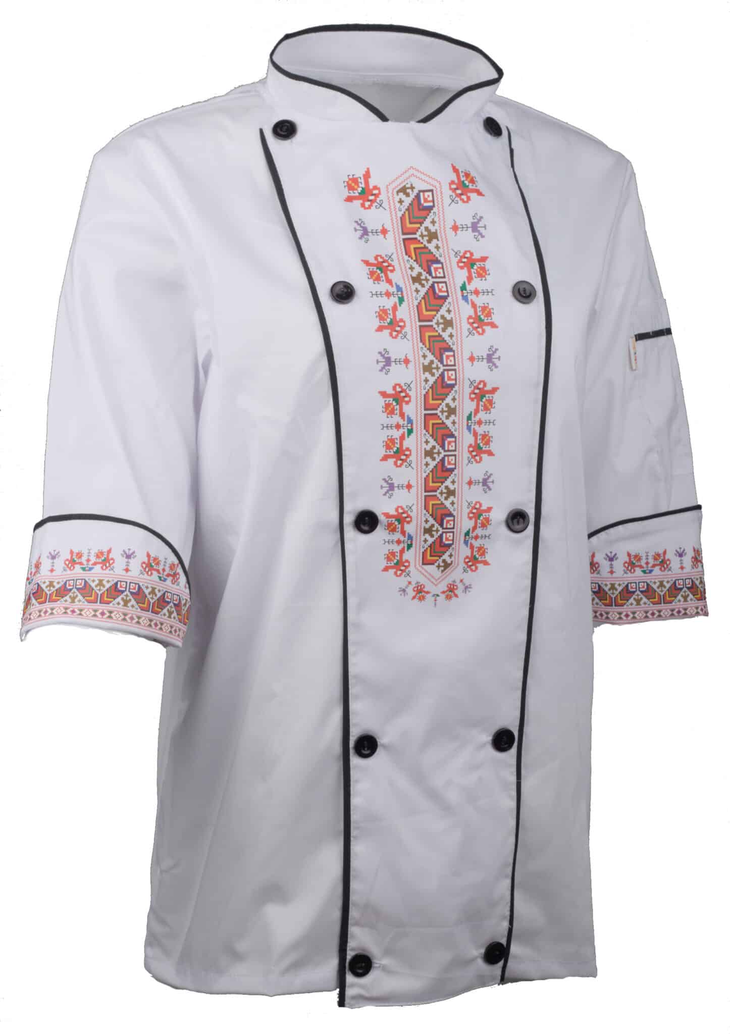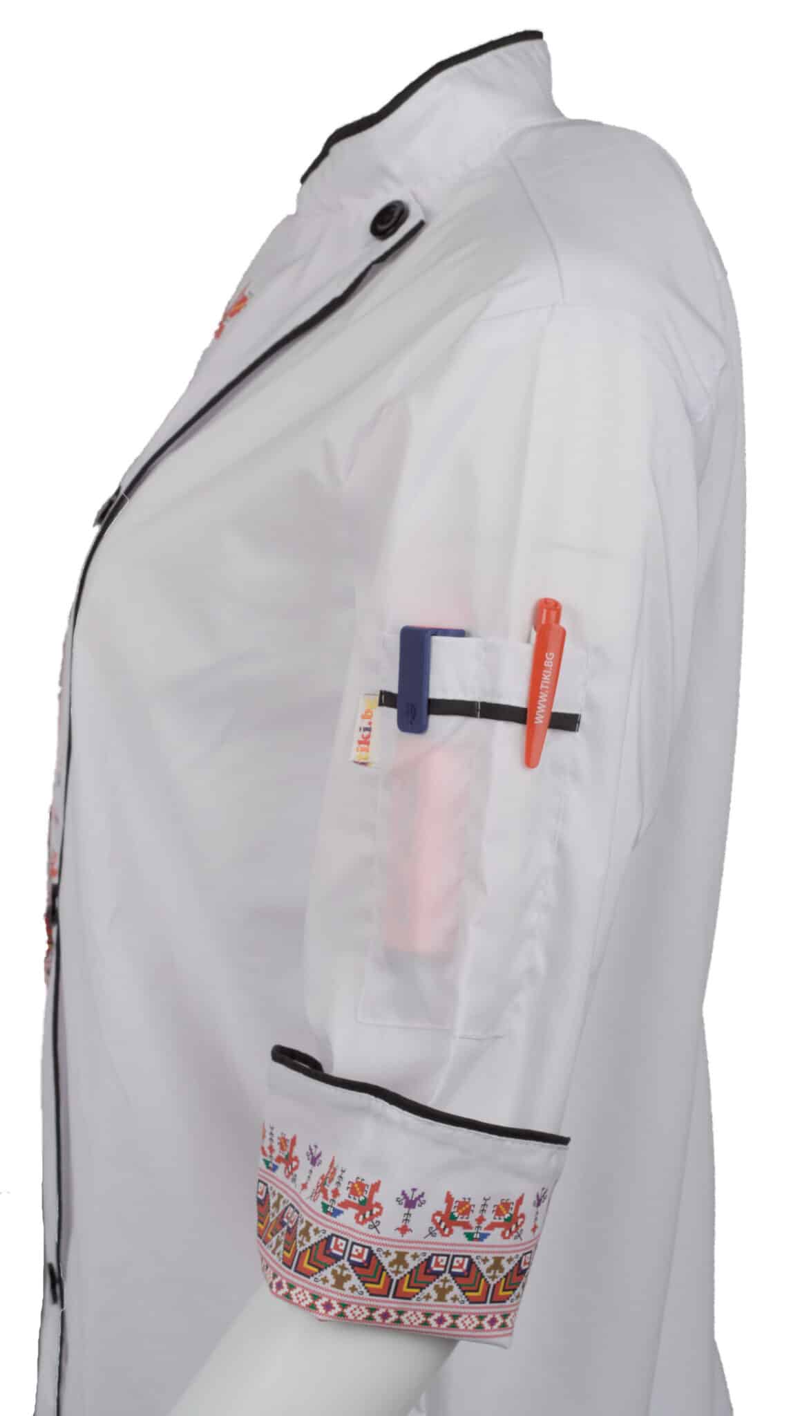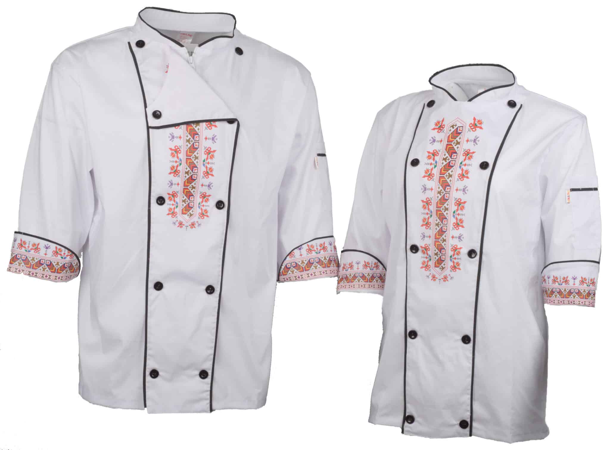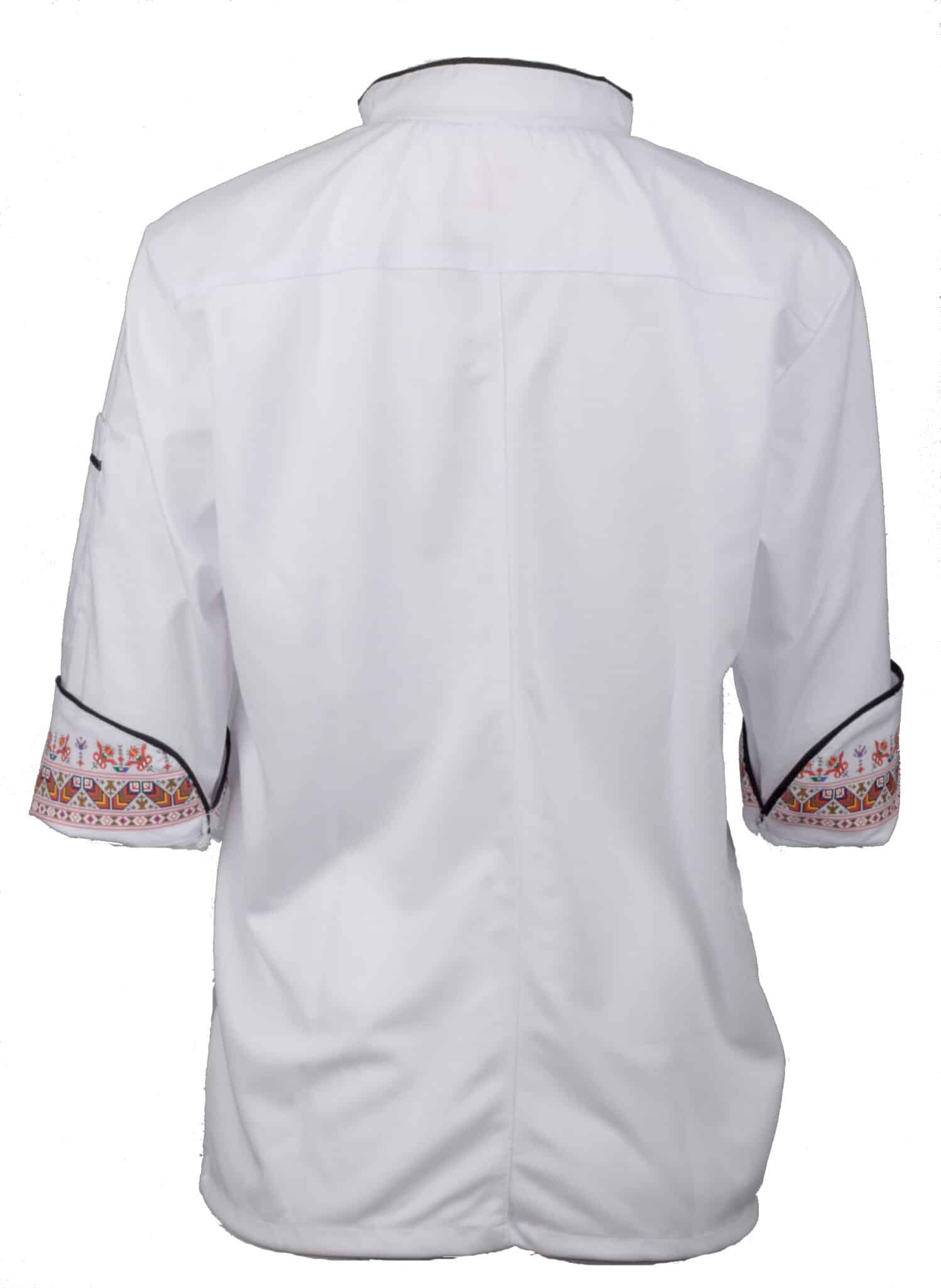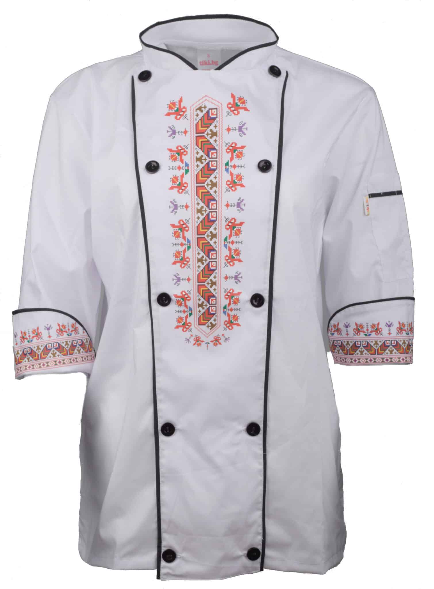 Бяла готварска туника с черен кант и DTF печат шевица. Отпечатакът е разположен върху горната предна част, както и в края на ръкавите. Моделът е с прав силует, изработен от мека и лека материя. Гърба на туниката е изработен от мрежа за повече комфорт по време на работа. Закопчаването е с цип и 2 ред реда копчета отпред. Има добавен джоб за аксесоари на левия ръкав. Готварска туника със шевица – бяла е изключително стилна и отличаваща се. Тази туника е идеалният избор за работно облекло на всеки един готвач, независимо дали е мъж или жена.