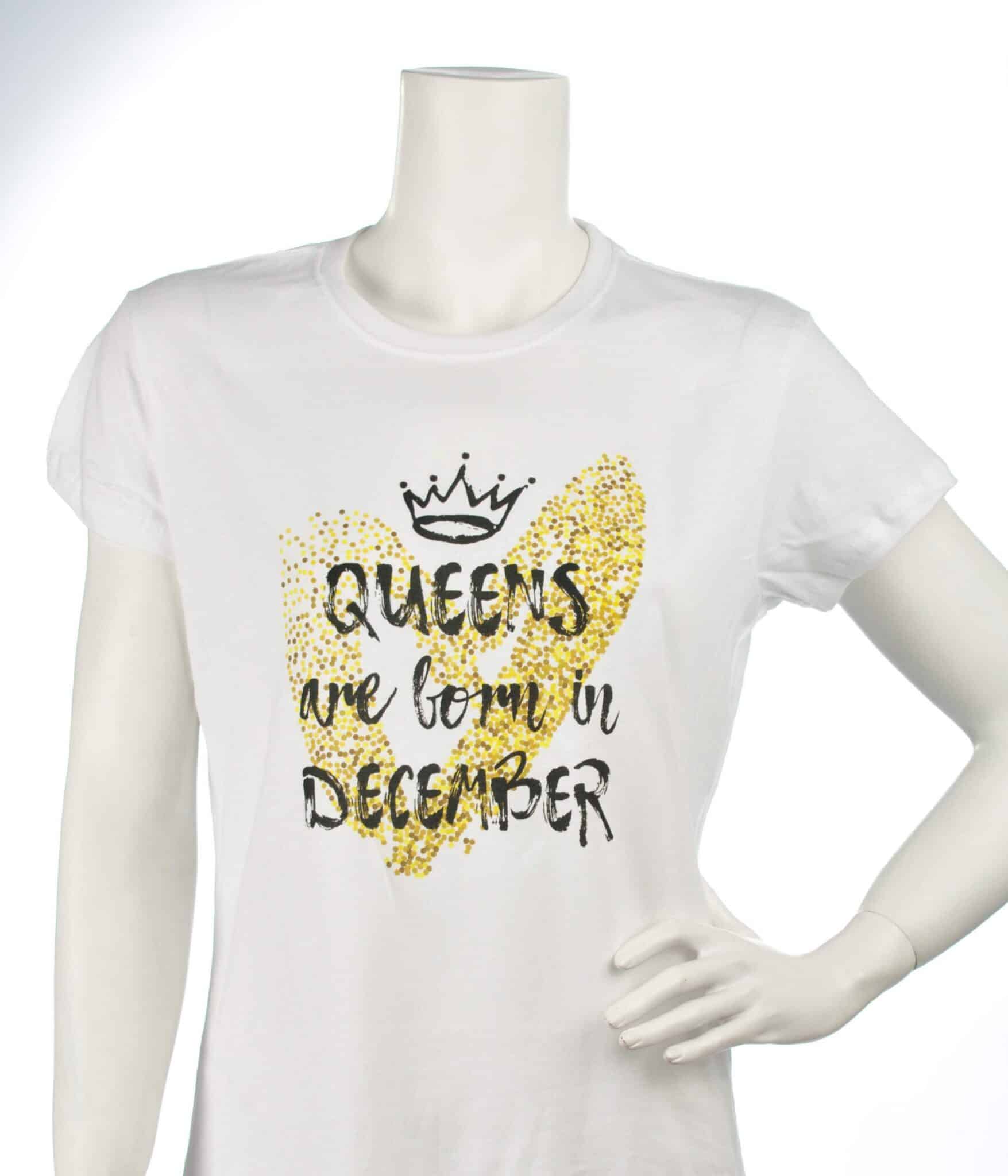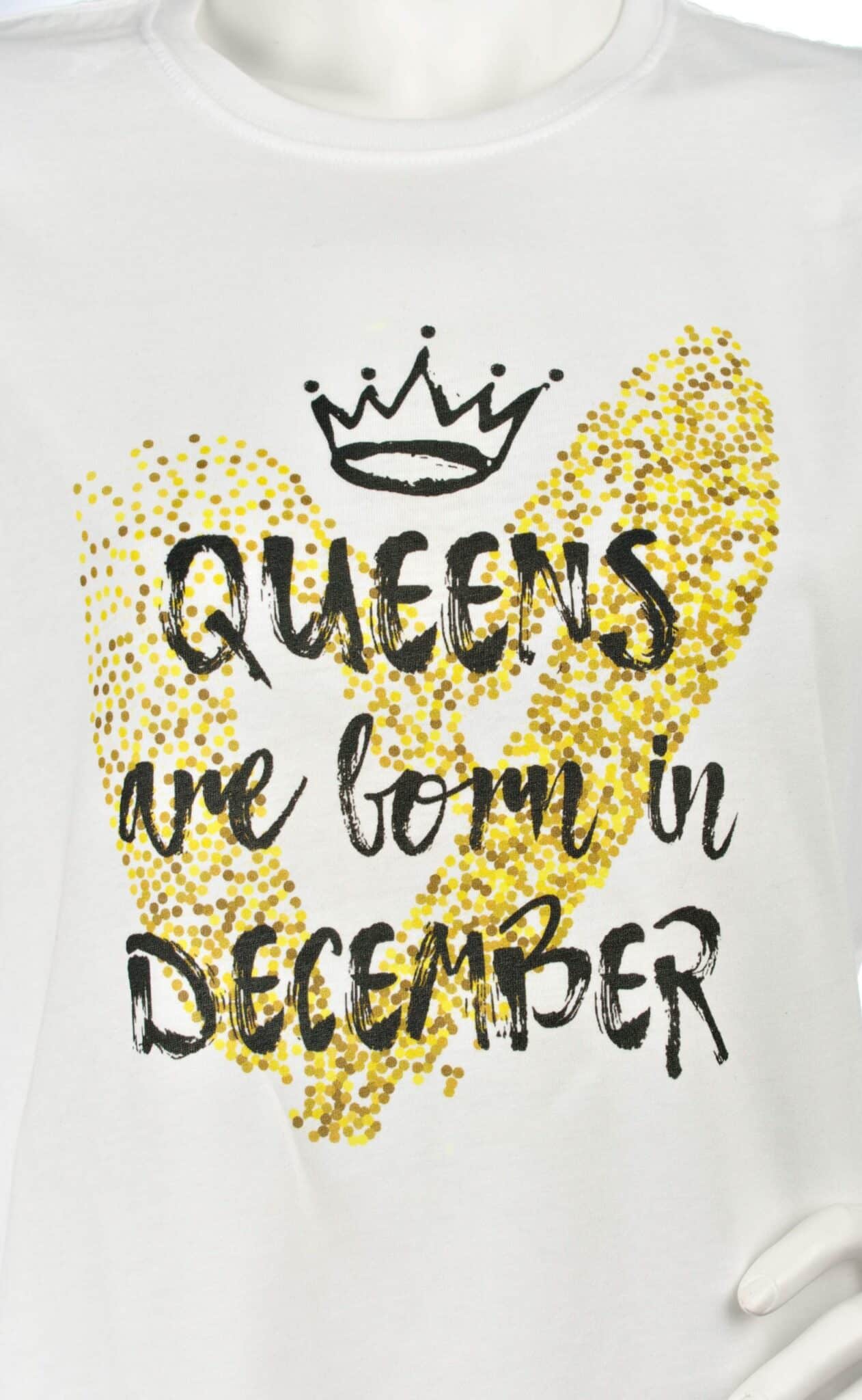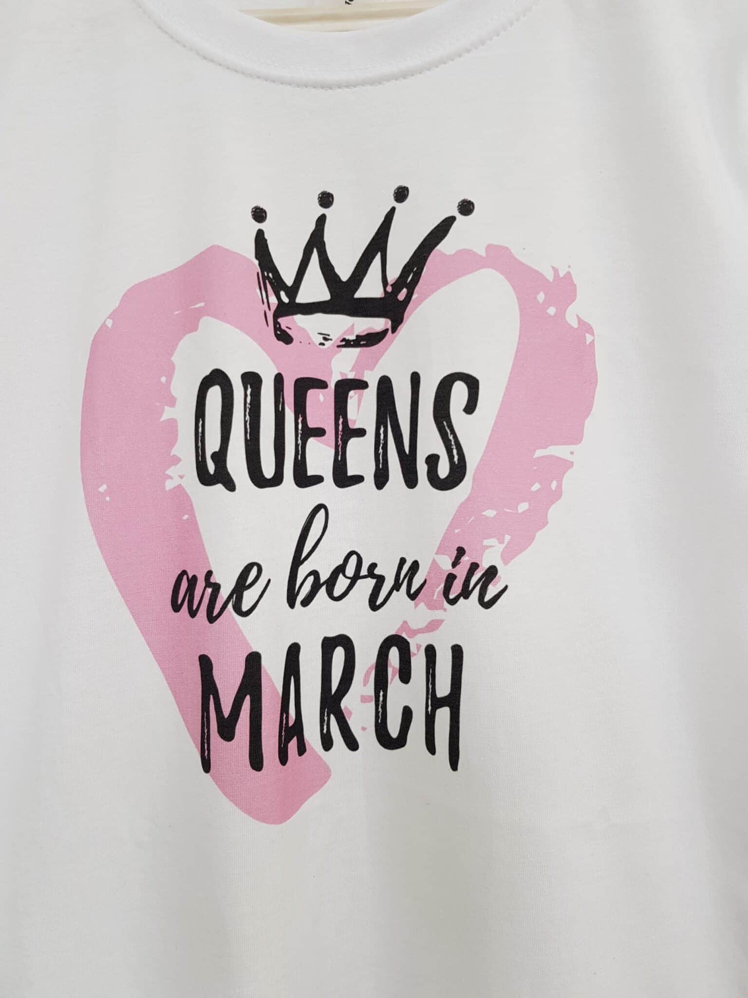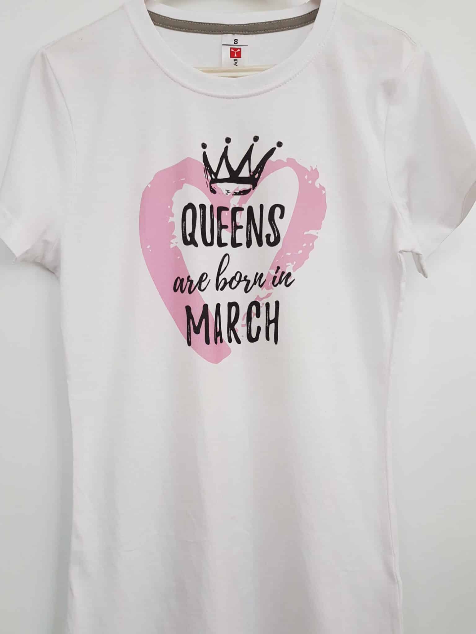 Дамска памучна тениска, бяла на цвят, с цветен печат за рожден ден. Чудесно предложение за подарък на ваша приятелка или колега. Имате възможност да поръчате тениска Queens are born in ……. с различен месец, според месеца в който е родена вашата позната. Можете да избирате между два дизайна – златно с черно или черно с розово. Разгледайте предложенията в галерията ни. Изображението върху тениската е висококачествен дигитален печат. При нас имате възможност да поръчате тениски с печат на ваши снимки. Изпратете ни запитване от тук.