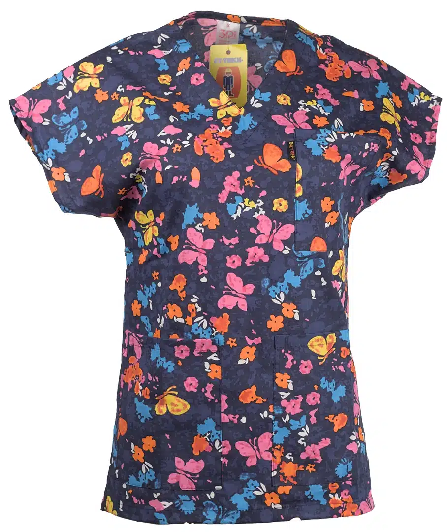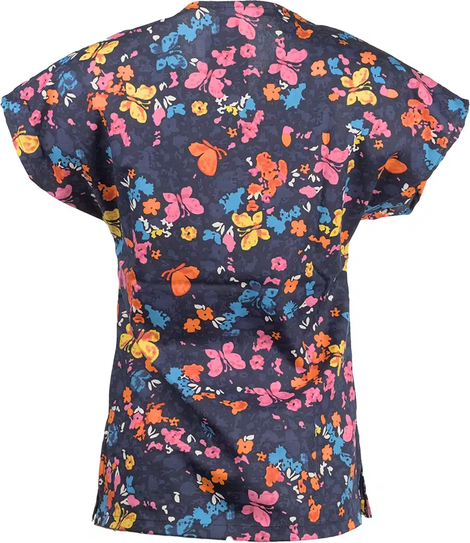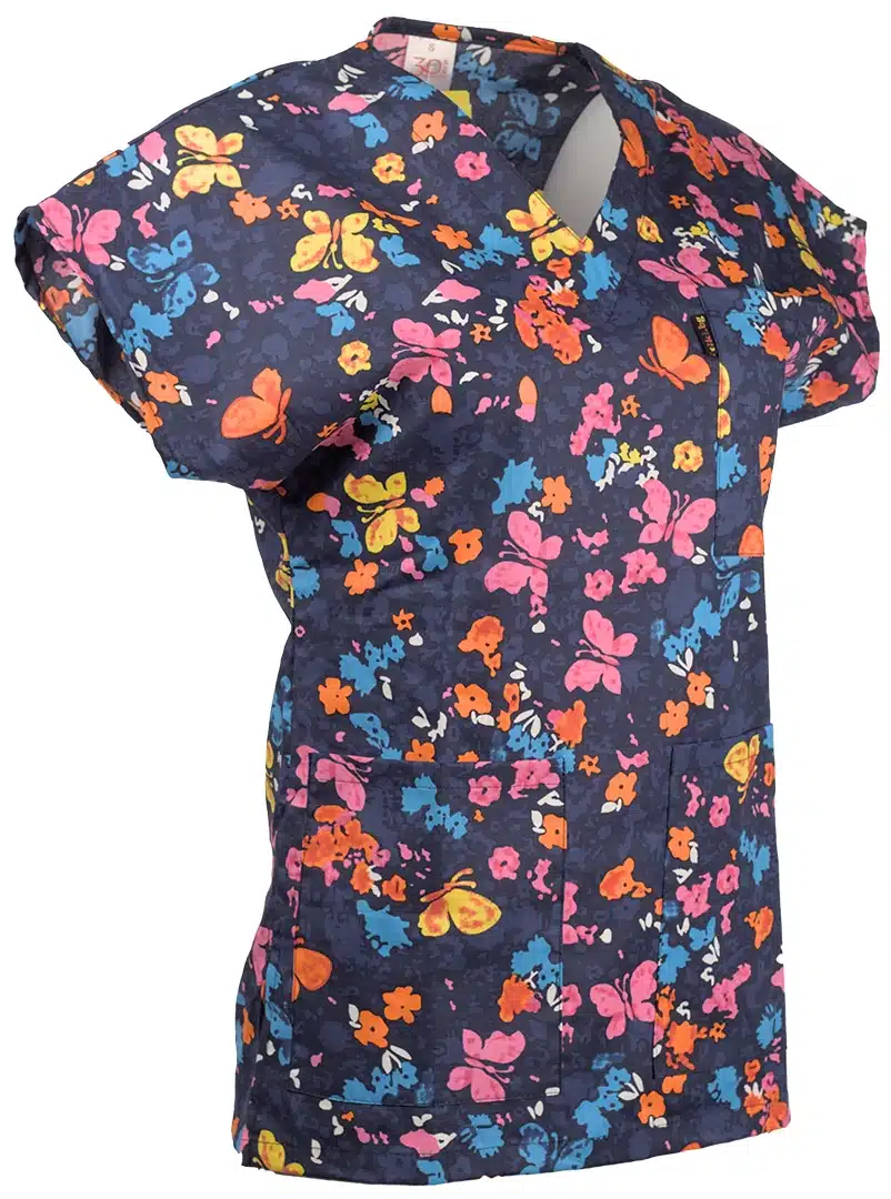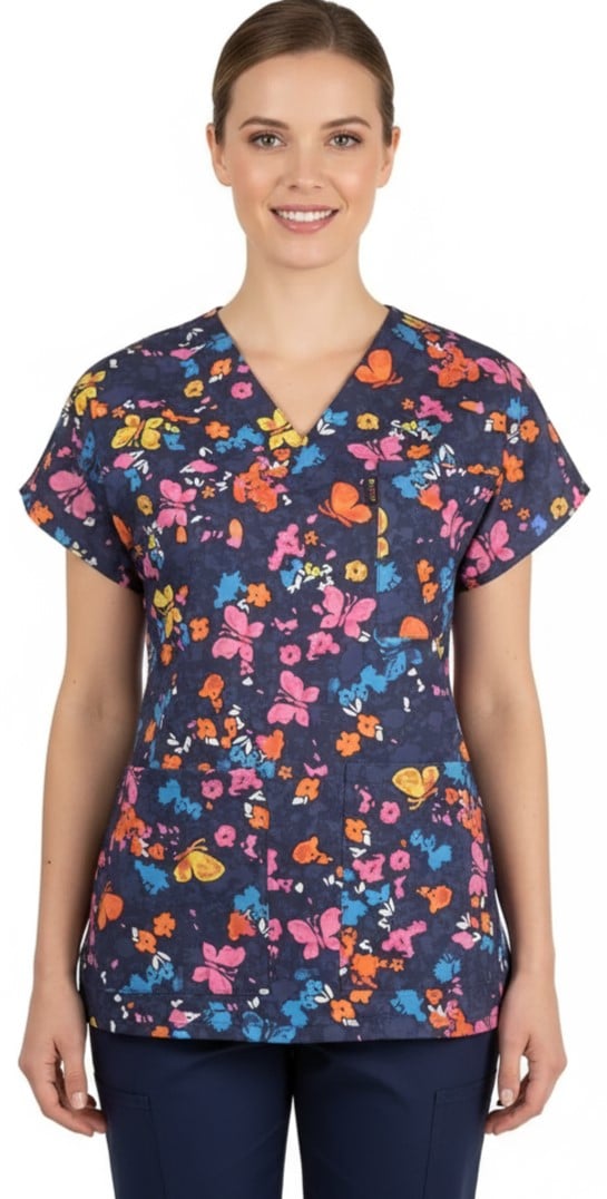 Дамска вталена туника Градина с многоцветна щампа върху тъмносиня основа. Туниката има остро деколте и три джоба. Моделът е с вталена кройка, изработена от изключително приятна на допир материя с високо съдържание на памук – 97 %. Подходяща е за медицински персонал, за дами, работещи в сферата на фармацевтиката, както и за персонал в детски заведения. Дамска вталена туника Градина се поддържа лесно, не се мачка и няма нужда от гладене. Еластичността в материята създава допълнителен комфорт през многочасовия работен ден. Туниката се комбинира отлично с дамските вталени панталони от секцията с медицински облекла. За завършена медицинска униформа може да допълните работната си визия с подходящ модел медицинско сабо.