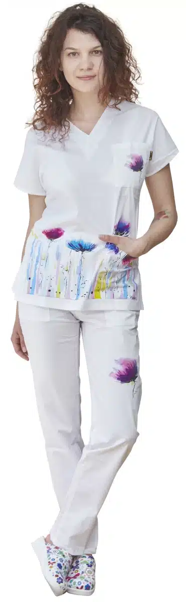 Вталена дамска туника с печат цветя по авторска разработка на художничката Пламена Войнова. Медицинската туника има 3 джоба, един горен и два странични. Изработена от 97% памук и 3% еластан ви гарантира комфорт и удобство през дългия работен ден. Печата на туниката е чрез технология DTG, а мастилата са безвредни на водна основа. Вталената туника с щампа на цветя е изключително подходяща за медицински работници, стоматолози, лаборанти и персонал в детски заведения. Красива и удобна, тази туника ще ви създаде отлично настроение. Ние, от „Тики – работно облекло“, се стремим винаги да предлагаме на нашите клиенти удобни, практични и иновативни работни облекла.