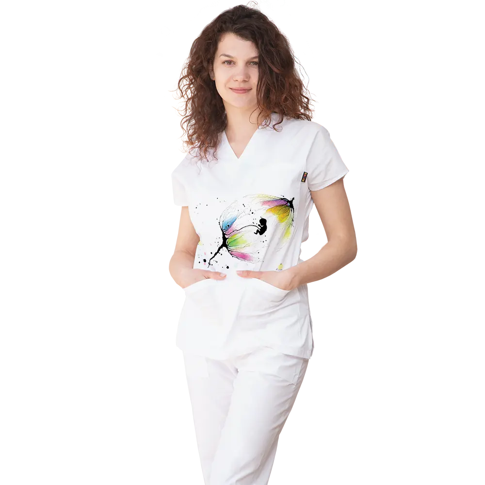 Вталена дамска медицинска туника Пламена с печат на тема New life. Медицинската туника има три джоба, един горен и два странични. Самата туника е изработена от 97% памук и 3% еластан и ви гарантира комфорт и удобство през дългия работен ден. Печатът на туниката е изработен чрез технология DTG, а мастилата са безвредни на водна основа. Тази медицинска туника е изключително подходяща за акушерки, гинеколози, или медицински работници в ин-витро центрове. Красива, нежна и удобна. Дамска медицинска туника Пламена с печат на тема New life може да поръчате и във вариант с права унисекс кройка. За завършена медицинска униформа може да съчетаете този модел с панталон унисекс и подходящ чифт медицинско сабо.