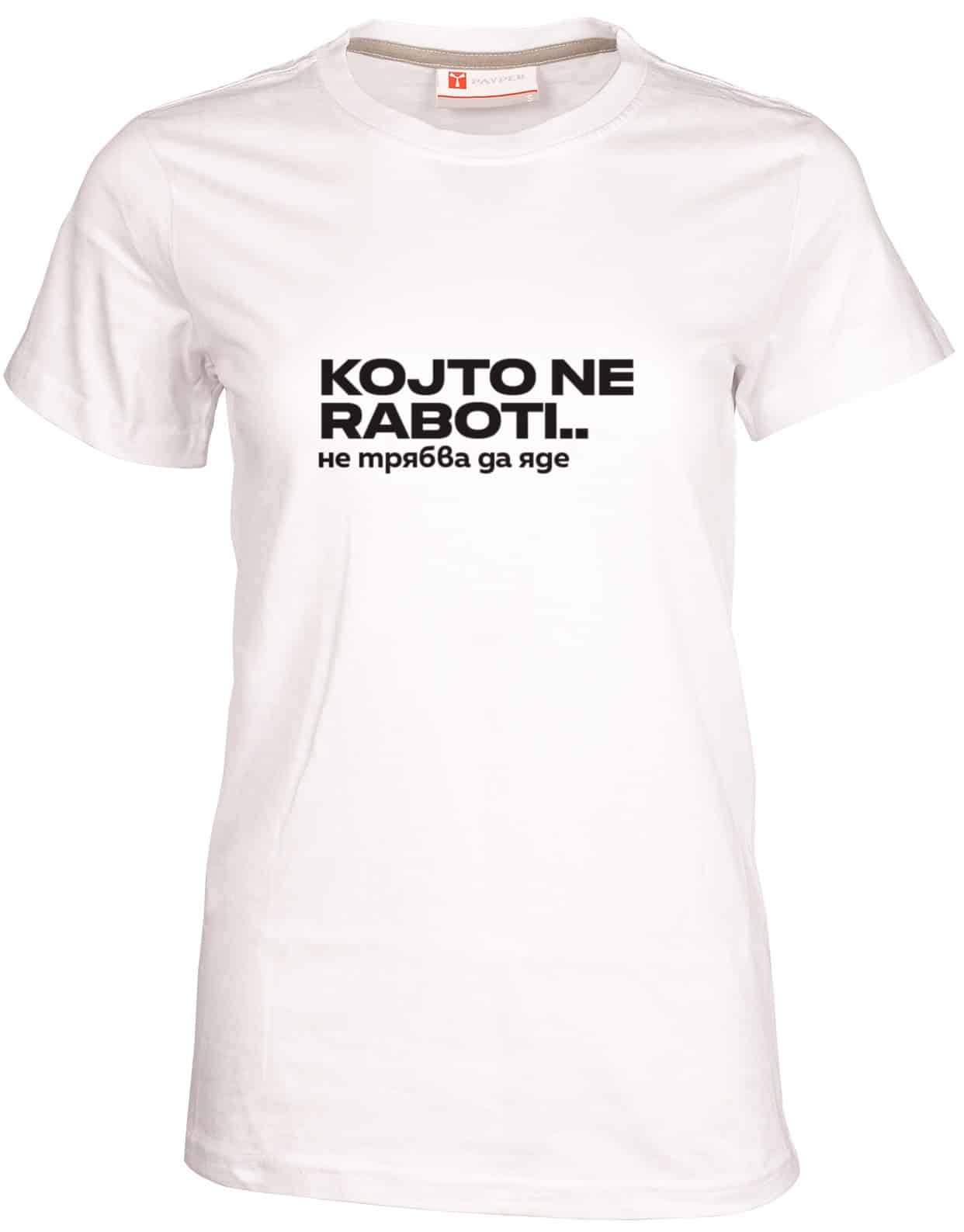 Тениска създадена за жените, които ценят труда и обичат хумора с характер. Изработена от 100% памук – естествена, мека и удобна материя. С вталена кройка и обло деколте. Моделът подчертава силуета и осигурява комфорт. Дамска тениска Който не работи.. се предлага в два класически варианта – бяла с черен надпис и черна с бял надпис. Размерите от XS до 2XL правят тази дамска тениска с печат подходяща за различни фигури и предпочитания. Надписът е отпечатан чрез DTF технология, която гарантира дълготрайност и наситен цвят. Идеална е за ежедневно носене, срещи с приятели или забавни моменти в семеен кръг. Може да комбинирате с Мъжка тениска Който не работи.. , или с друг модел от нашите тениски с печат. Посланието е ясно – трудът се уважава, но и трябва да се носи с усмивка.