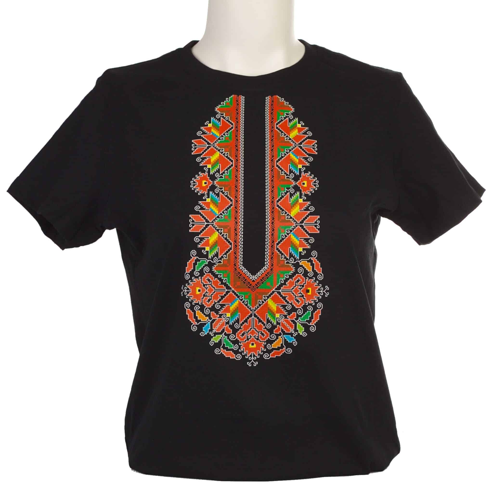 Дамска памучна тениска с дигитален печат шевица -черна, по мотив Лазарки. Тениската с шевица, черна на цвят и е изработена от 100% памучна мека материя. Дизайнът на шевицата е изцяло авторска разработка на Елисавета Йорданова. Цветовете на печата са ярки и наситени. Шевицата е отпечана посредством технологията DTF – Direct To Film. Тази технология осигурява устойчивост при пране и надраскване. Чрез този вид печат се постига много прецизно фотографско качество. Тениската е много подходяща за работна униформа за персонал в заведения за хранене, в магазини или за облекло на фолклорни ансамбли, екскурзоводи. Идеална е също за подарък на ваша близка. Този модел дамска тениска с шевица-черна, се предлага и в бял цвят. Предлагаме също мъжки варианти – бяла и черна тениска с шевица по мотив Дървото на живота. За малчуганите можете да поръчате и детски тениски с шевица Лазарки, или с шевица Дървото на живота.