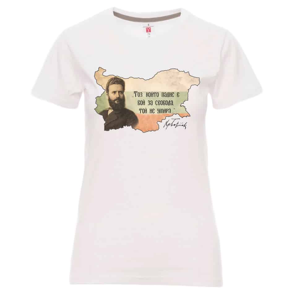 Бяла дамска тениска Христо Ботев с DTG печат Христо Ботев. Тениската е изработена от мека материя от 100% памук и е много приятна на допир. Налична е в размери от XS до 2XL. Дамска тениска Христо Ботев е налична също така и в мъжки вариант.