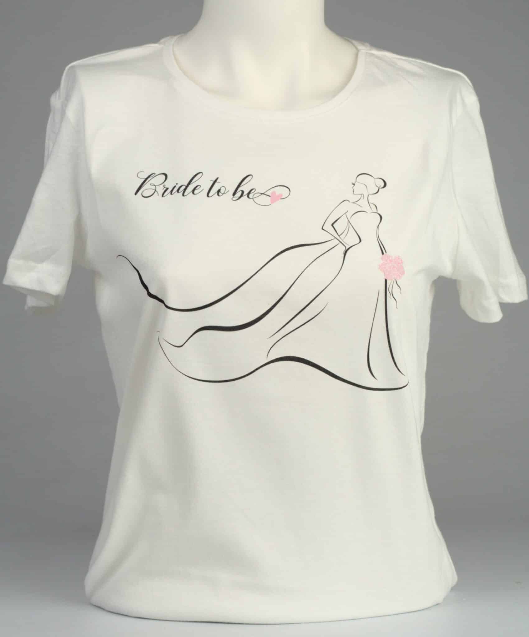 Дамска памучна тениска, бяла на цвят, с дигитален печат Bride to be. Чудесно предложение за подарък на бъдеща булка. Имате възможност да поръчате тениски с печат Team Bride за цялата компания дами, които ще присъстват на моминското парти. Можете също да добавите печат с името на булката, или датата на сватбата срещу доплащане от 5,60 лв. Изображението върху тениската е висококачествен дигитален печат.