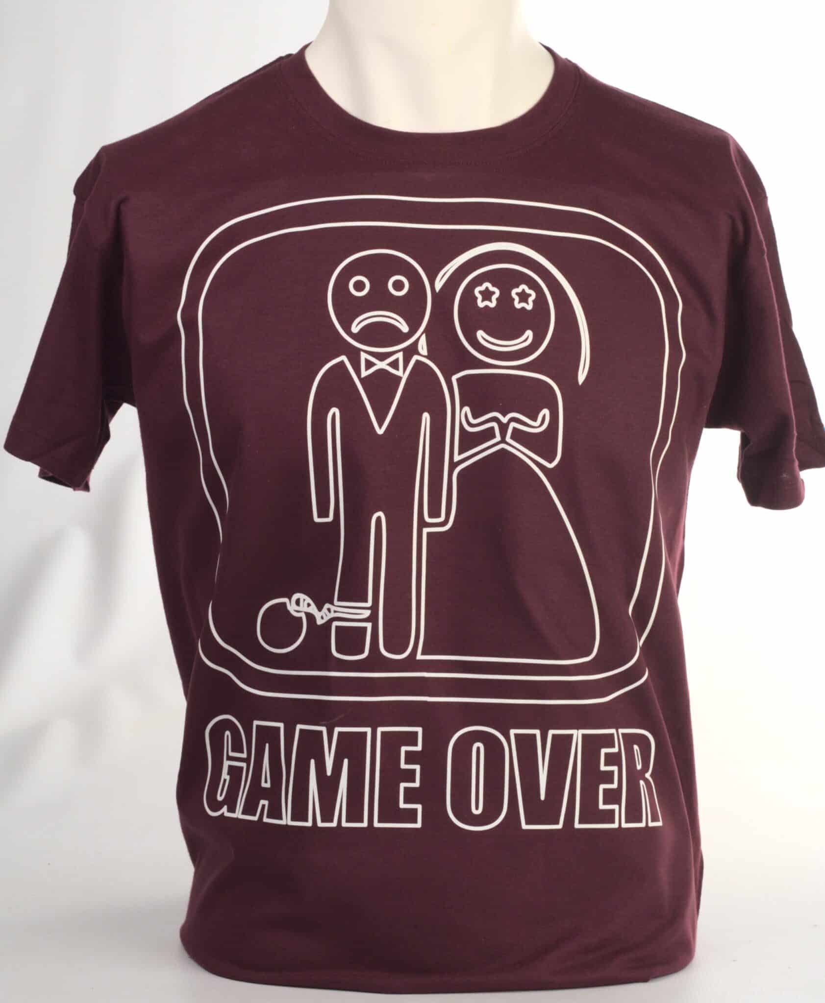 За бъдещия младоженец предлагаме мъжка тениска с печат Game Over, както и възможност за изработка на тениски с печат Team Groom за всички участници в ергенското парти.