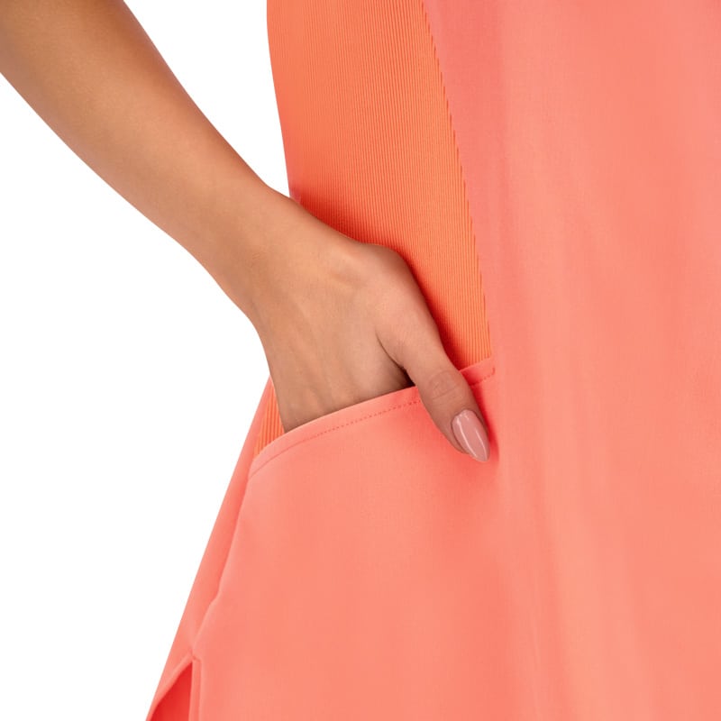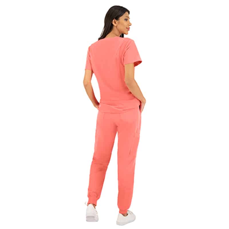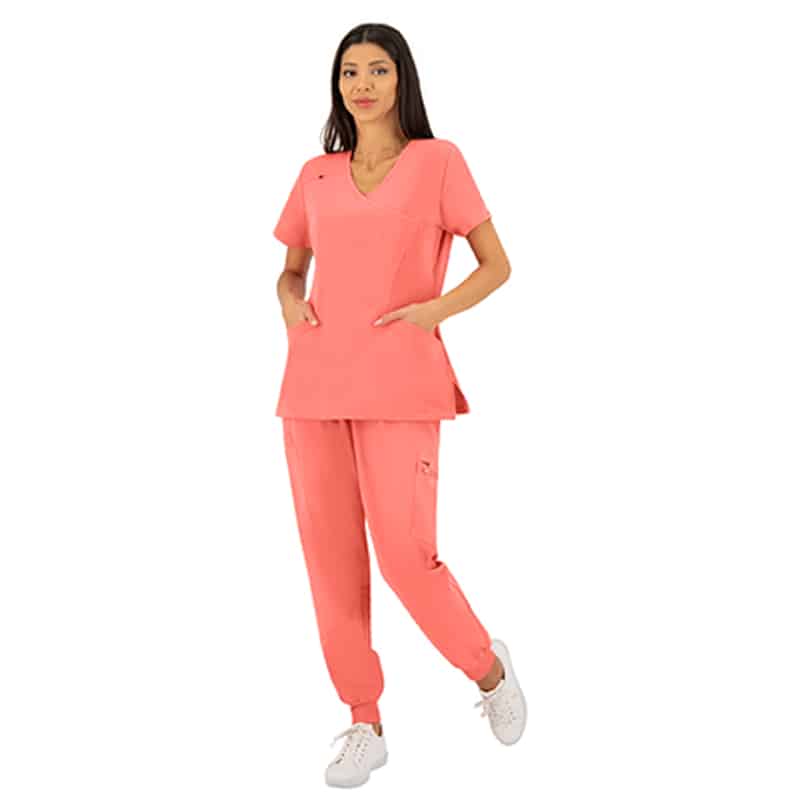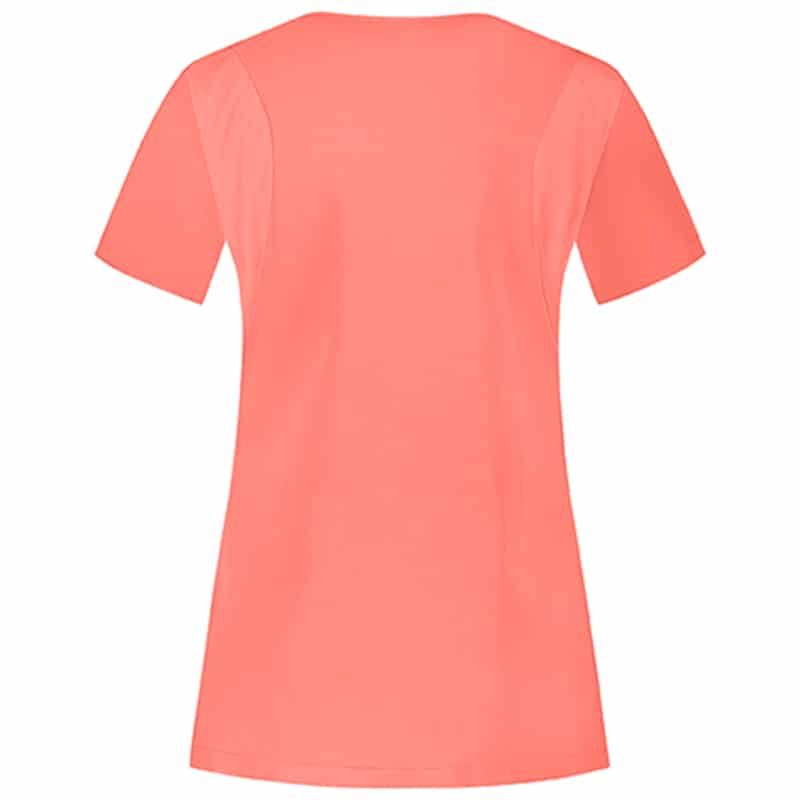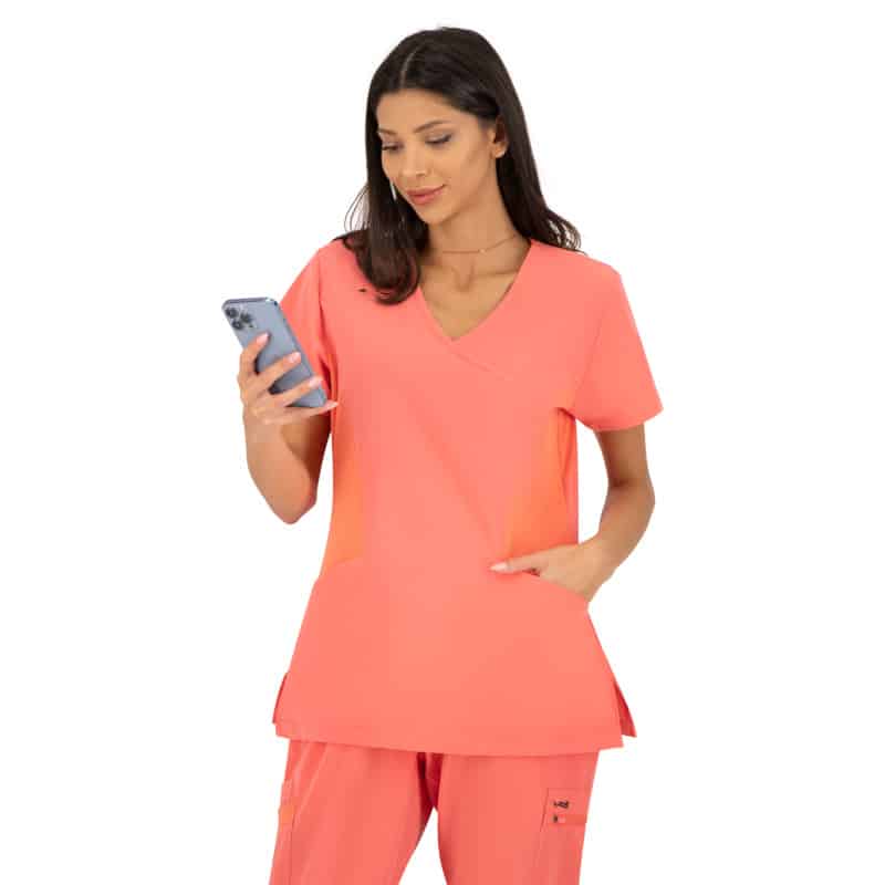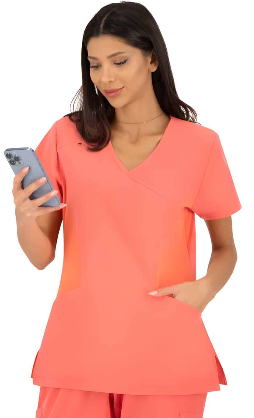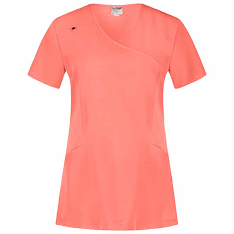 Дамска туника Джустина в ярък цвят корал с къс ръкав. Моделът е с остро деколте и два джоба. Има халка за бадж в горната дясна част. За допълнително удобство и свобода на движенията през целия работен ден, туниката има ластични, полиестерни елементи на гърба и отстрани. Съставът е 72% полиестер, 21% вискоза и 7% еластан. Материята е лека и ефирна и изключително приятна на допир.Дамска туника Джустина в цвят корал е много подходяща за медицинско облекло на лекари , мединцински сестри, фармацевти, както и служителите в естетични центрове.