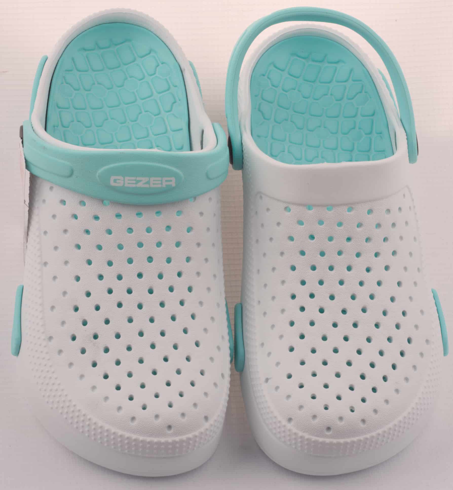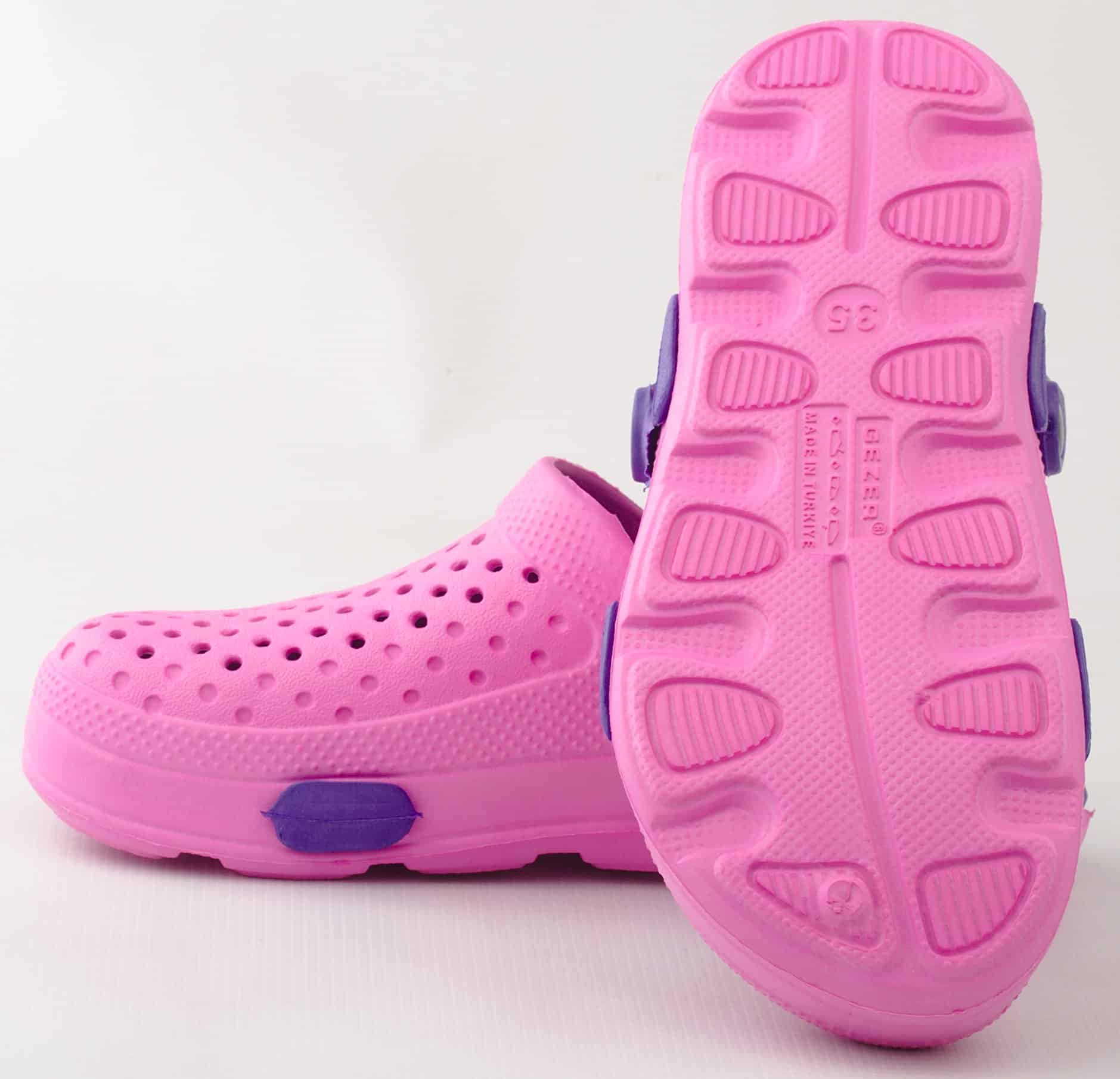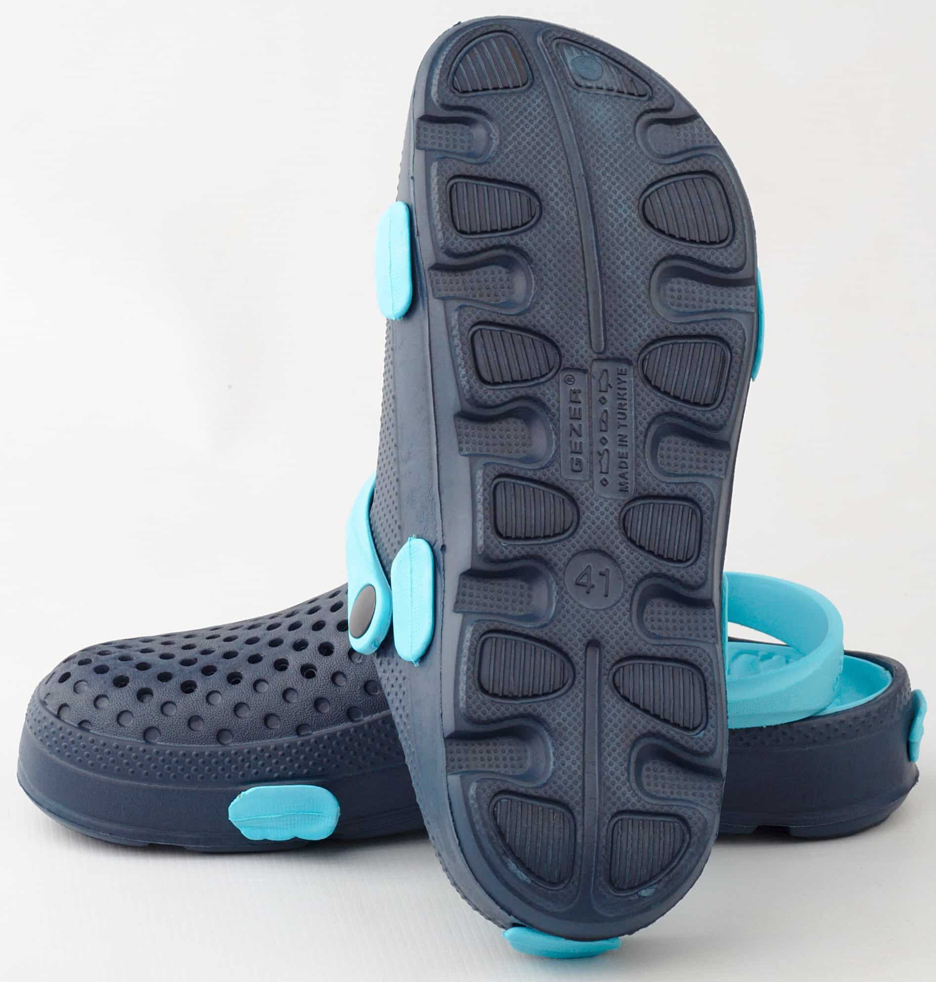 Дамски градински чехли Gezer. Леки и комфортни с дупки в горната част за по-добра вентилация. Моделът се предлага в три цветови варианта: в розов с лилави елементи, зелено с розово, в тъмносин със светлосини елементи и в бежово-сив цвят с кафеви елементи. След употреба чехлите могат да се измият. Изключително леки и удобни са. Подходящи са за ежедневна употреба у дома, при работа в градината, или в работна среда при извършване на санитарни дейности, за помощник-възпитатели в детски заведения и други. Предлагаме и мъжки градински чехли.