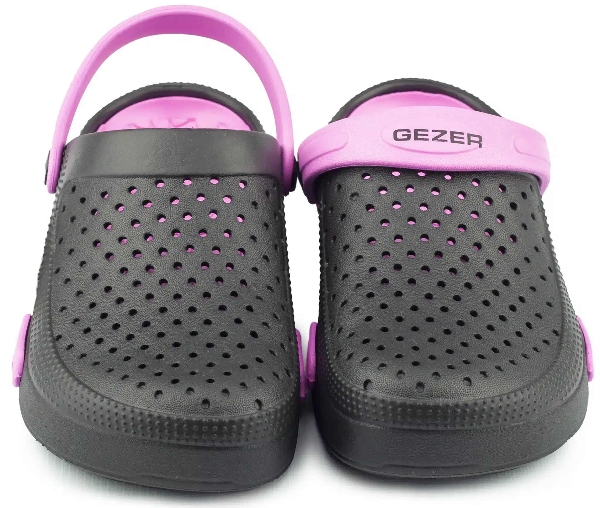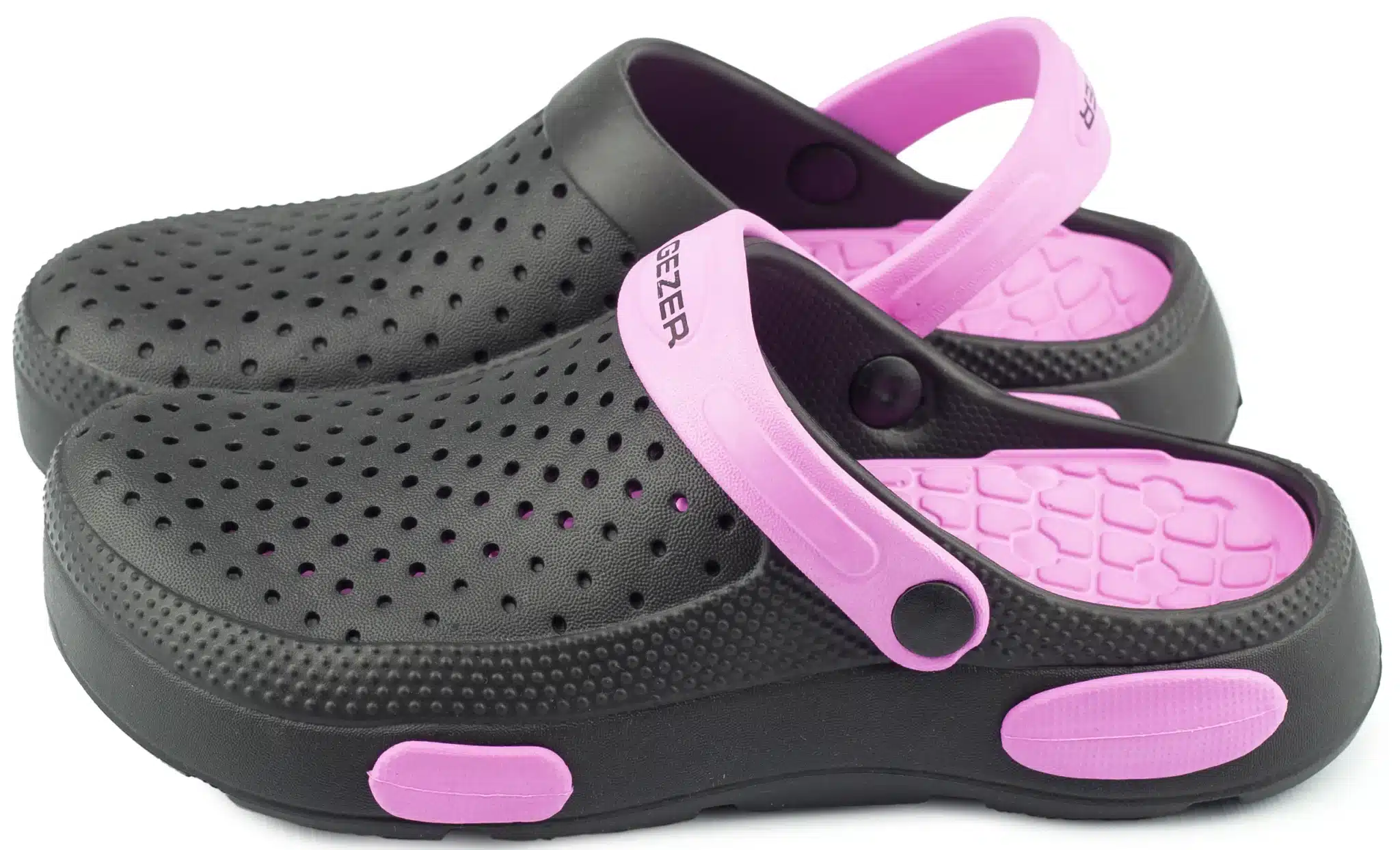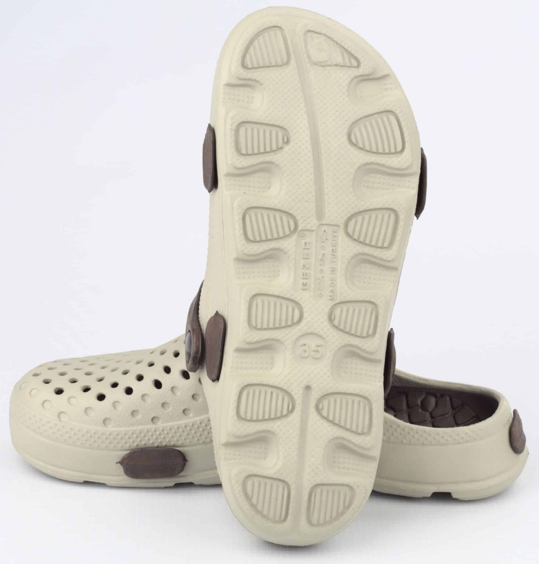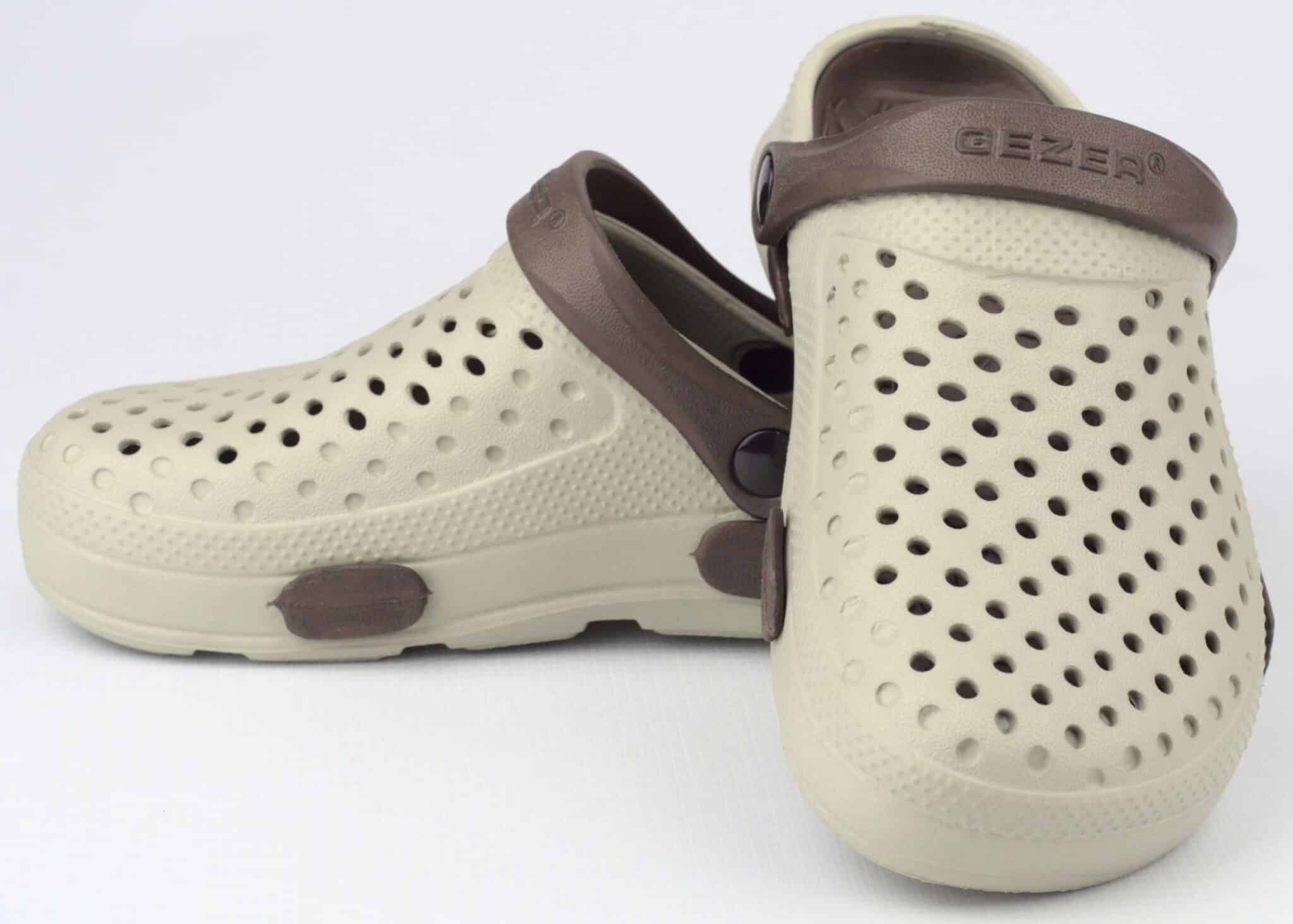 Дамски градински чехли Gezer. Леки и комфортни с дупки в горната част за по-добра вентилация. Моделът се предлага в три цветови варианта: в розов с лилави елементи, зелено с розово, в тъмносин със светлосини елементи и в бежово-сив цвят с кафеви елементи. След употреба чехлите могат да се измият. Изключително леки и удобни са. Подходящи са за ежедневна употреба у дома, при работа в градината, или в работна среда при извършване на санитарни дейности, за помощник-възпитатели в детски заведения и други. Предлагаме и мъжки градински чехли.