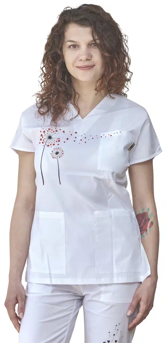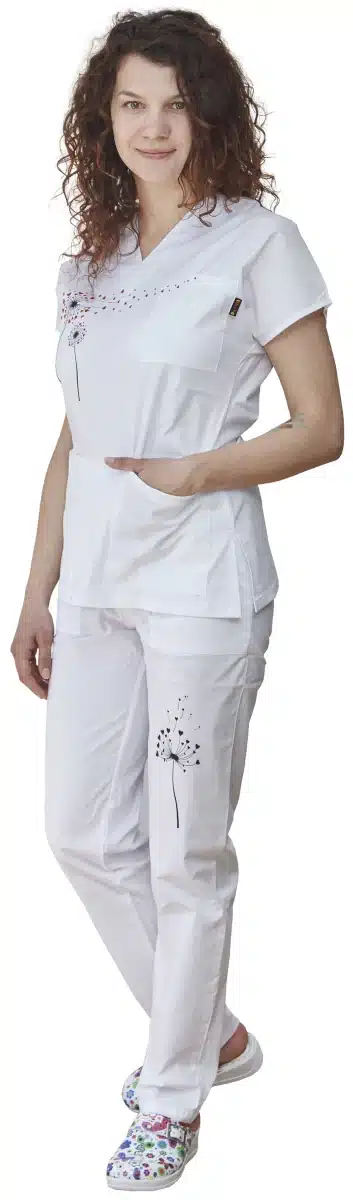 Дамски медицински костюм от туника и панталон с вталена кройка в бял цвят и дигитален печат глухарче. Отличен като работно облекло за персонал в медицински и детски заведения, за фармацевти и други. От нас може да закупите и самостоятелно медицинска вталена туника с печат глухарче. Предлагаме персонализиране на работното облекло, като добвим имената, длъжността или лични инициали върху джоба на туниката срещу доплащане от € 2,86 / 5,60 лв. При нас имате и възможност да брандирате медицинската си униформа с логото на медицинското заведение.