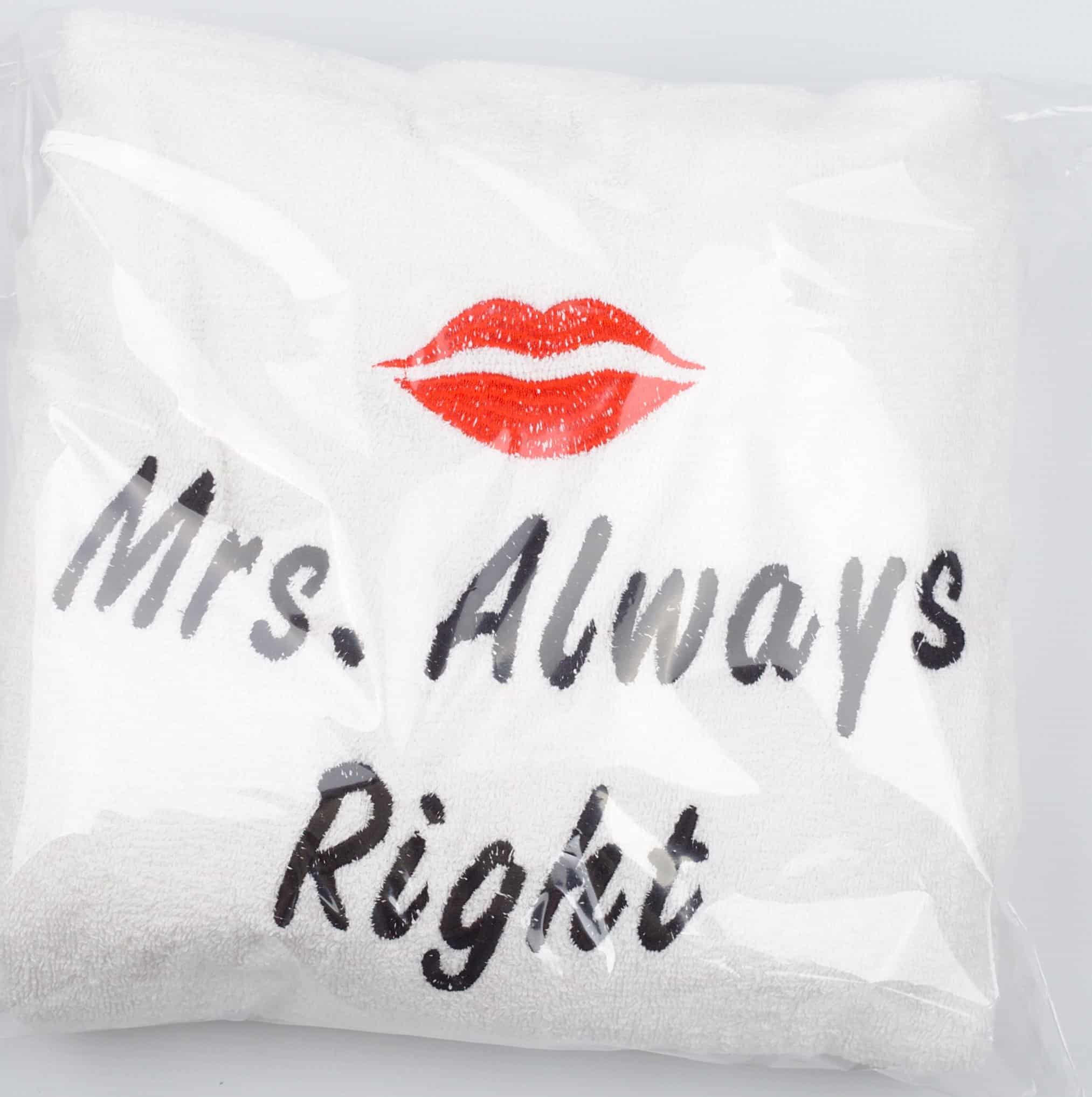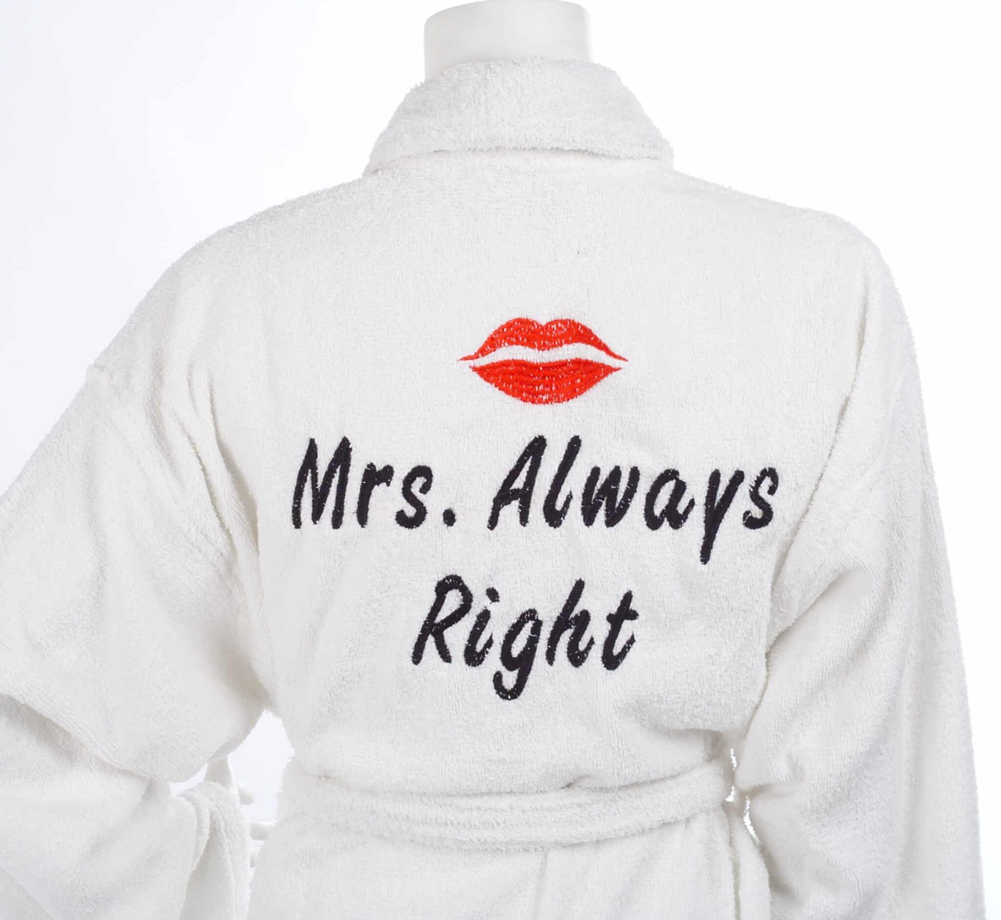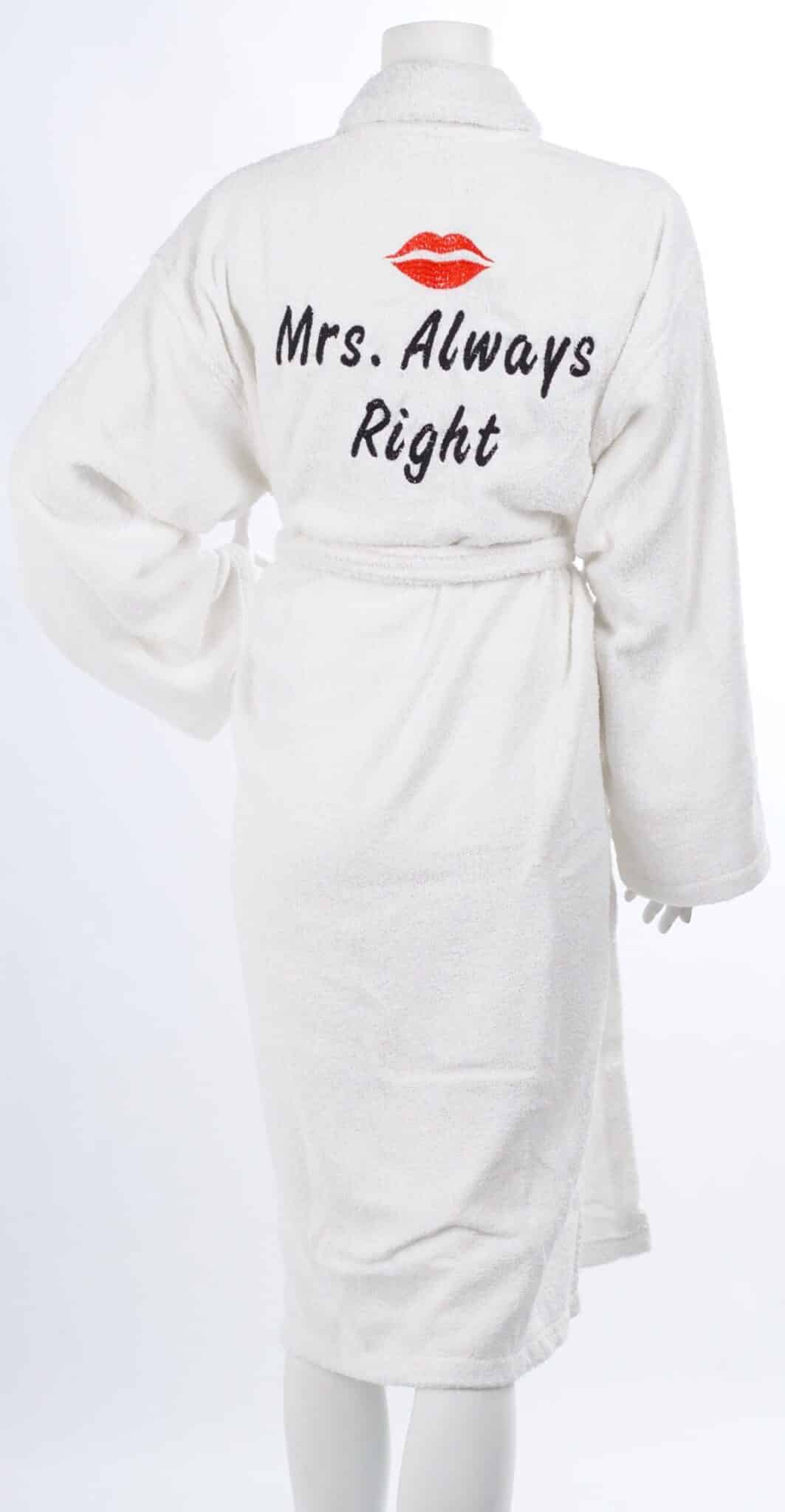 Търсите оригинален подарък за нея? Този халат е отличен избор за любимата жена, добрата ви приятелка, или за булка. Бял халат от 100% памук с бродерия Mrs. Always Right се предлага в няколко размера: M, XL и XXL. Може да комбинирате този дамски халат с мъжки халат с бродерия Mr. Right и ще получите перфектен сватбен подарък. Търсите други цветове дамски халати, или продукти с бродерия за подарък? Пишете ни.