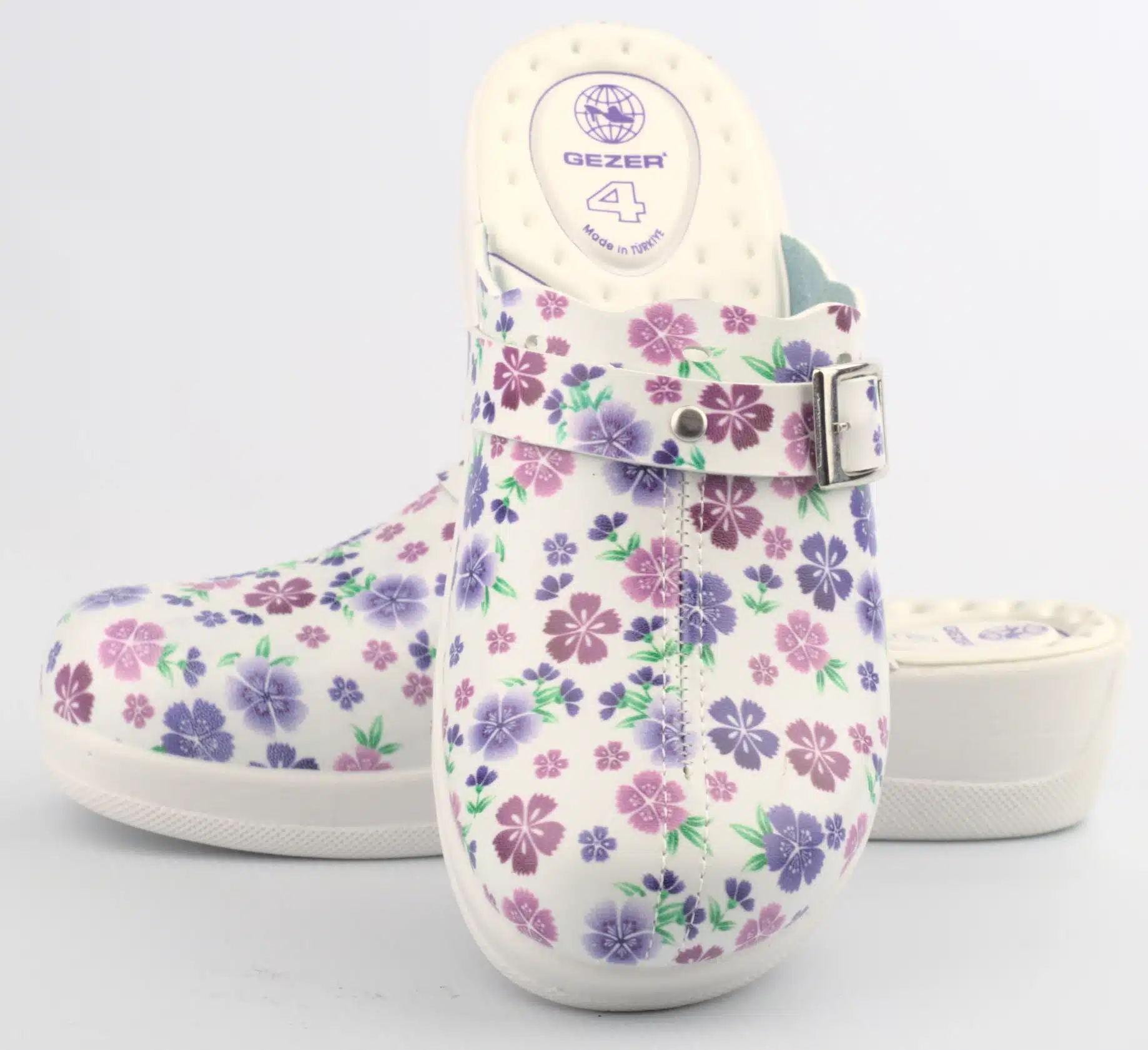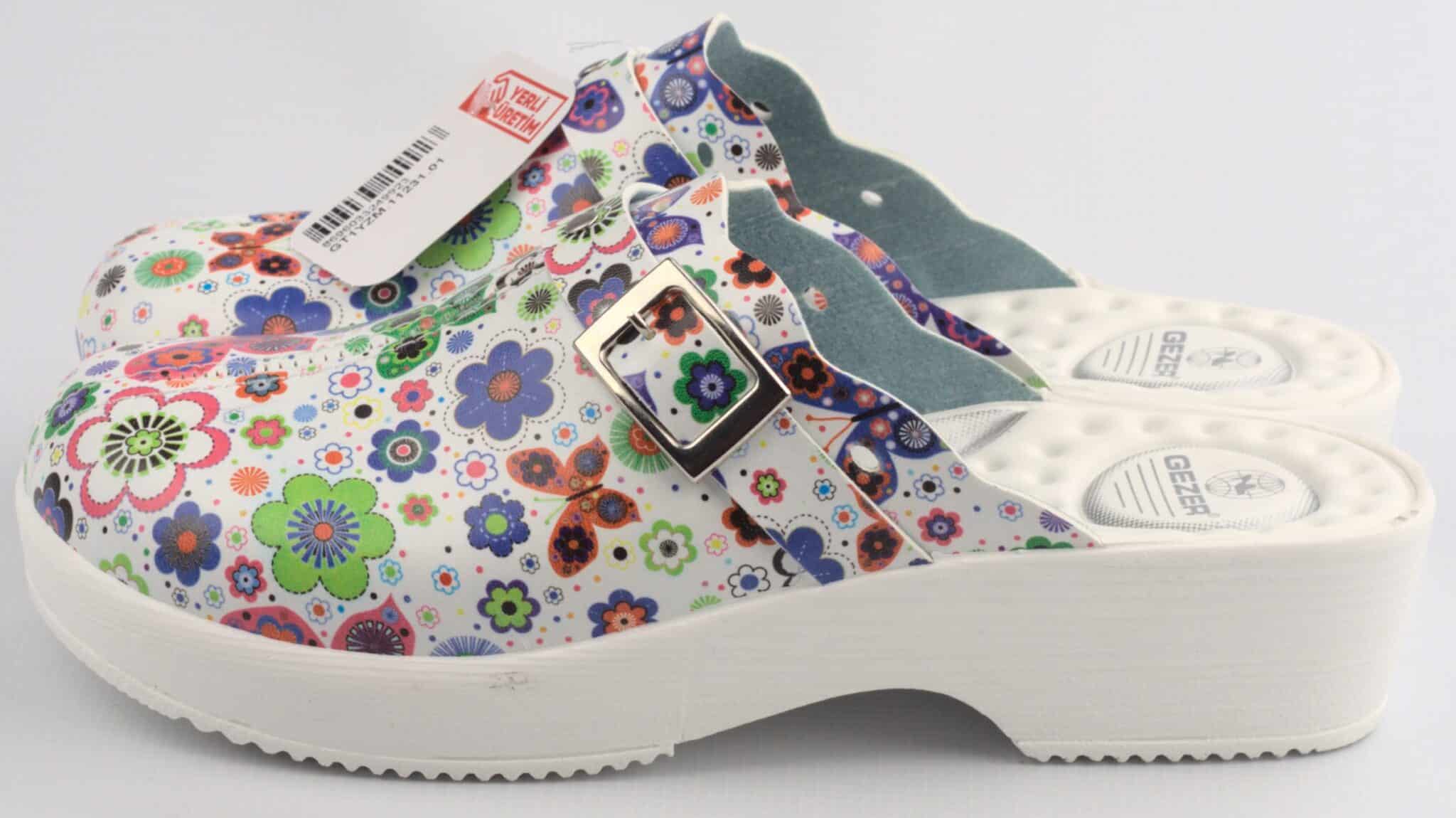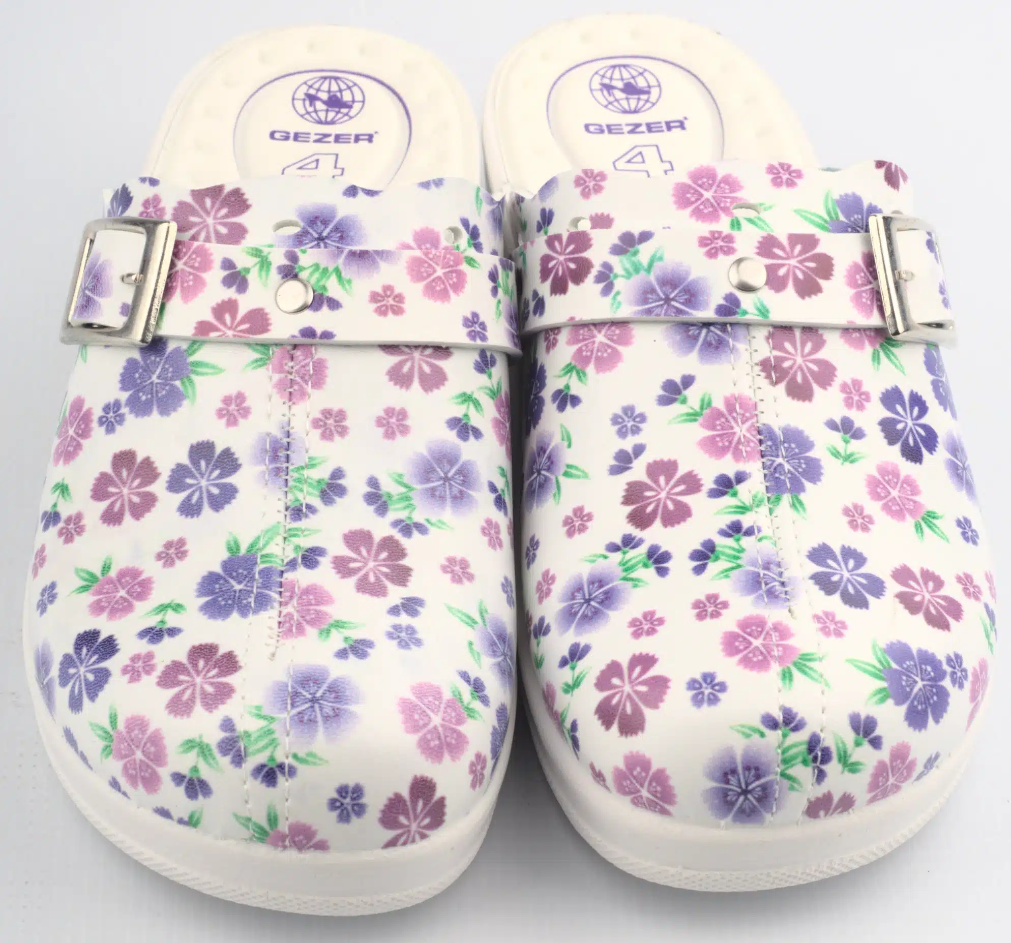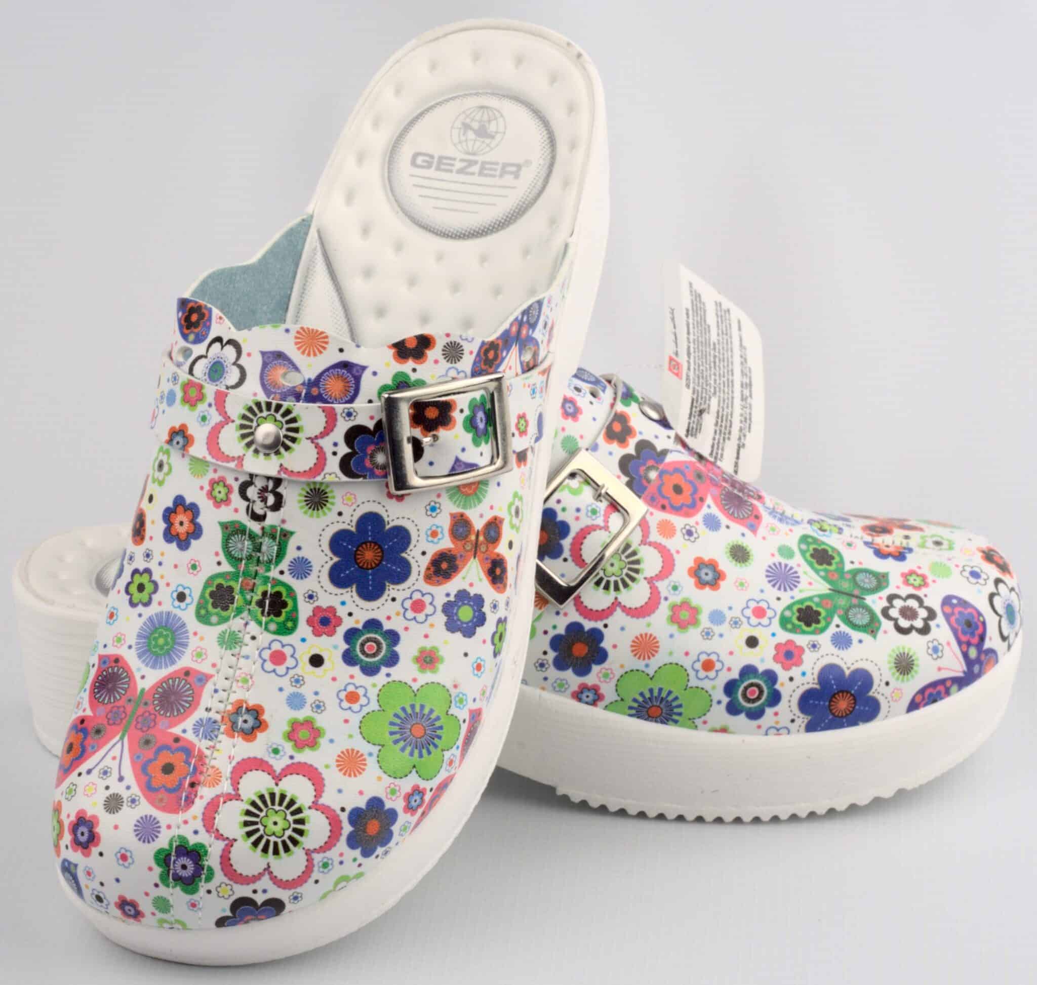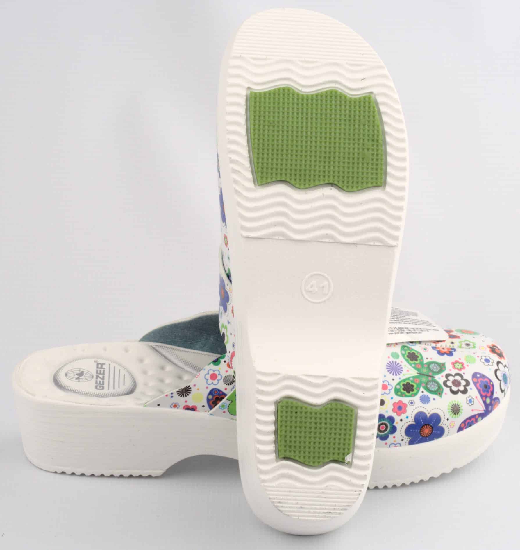Дамско сабо Gezer с цветен принт на пеперуди и цветя и с декоративна каишка отпред. Моделът има анатомична противохлъзгаща подметка с височина на тока 4,5 см. Сабо Gezer с цветен принт е много подходящо допълнение към работната униформа на медицински и санитарни работници, на фризьори, козметици и рехабилитатори. Чудесно е и за ежедневна персонална употреба. Сабата на турската компания Gezer са проектирани за максимален комфорт при натоварен работен ден. Принтът на този модел може да бъде в различни нюанси.
