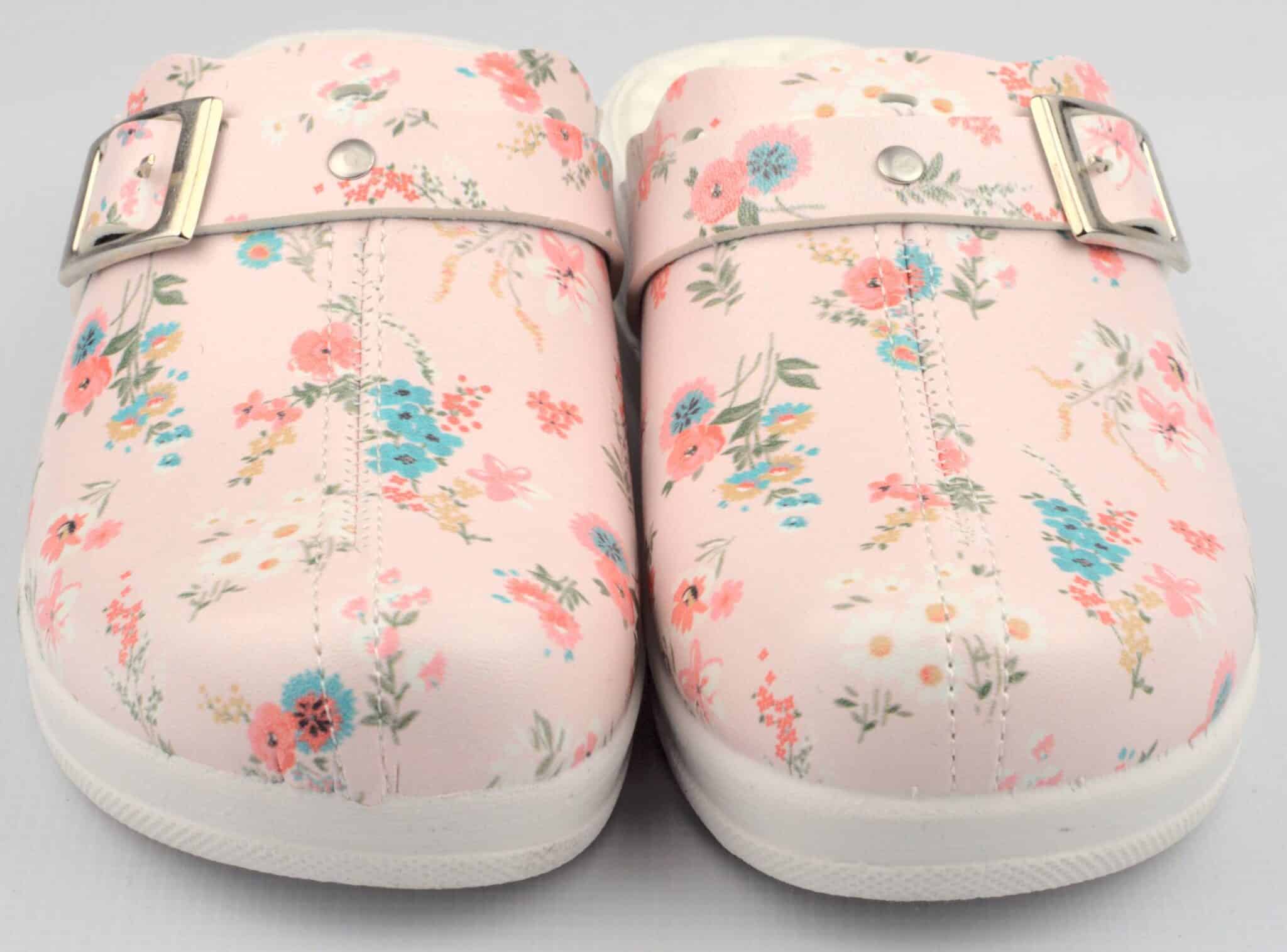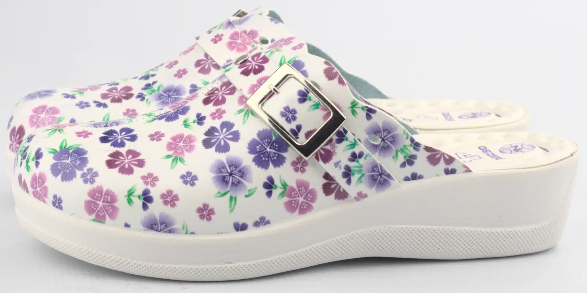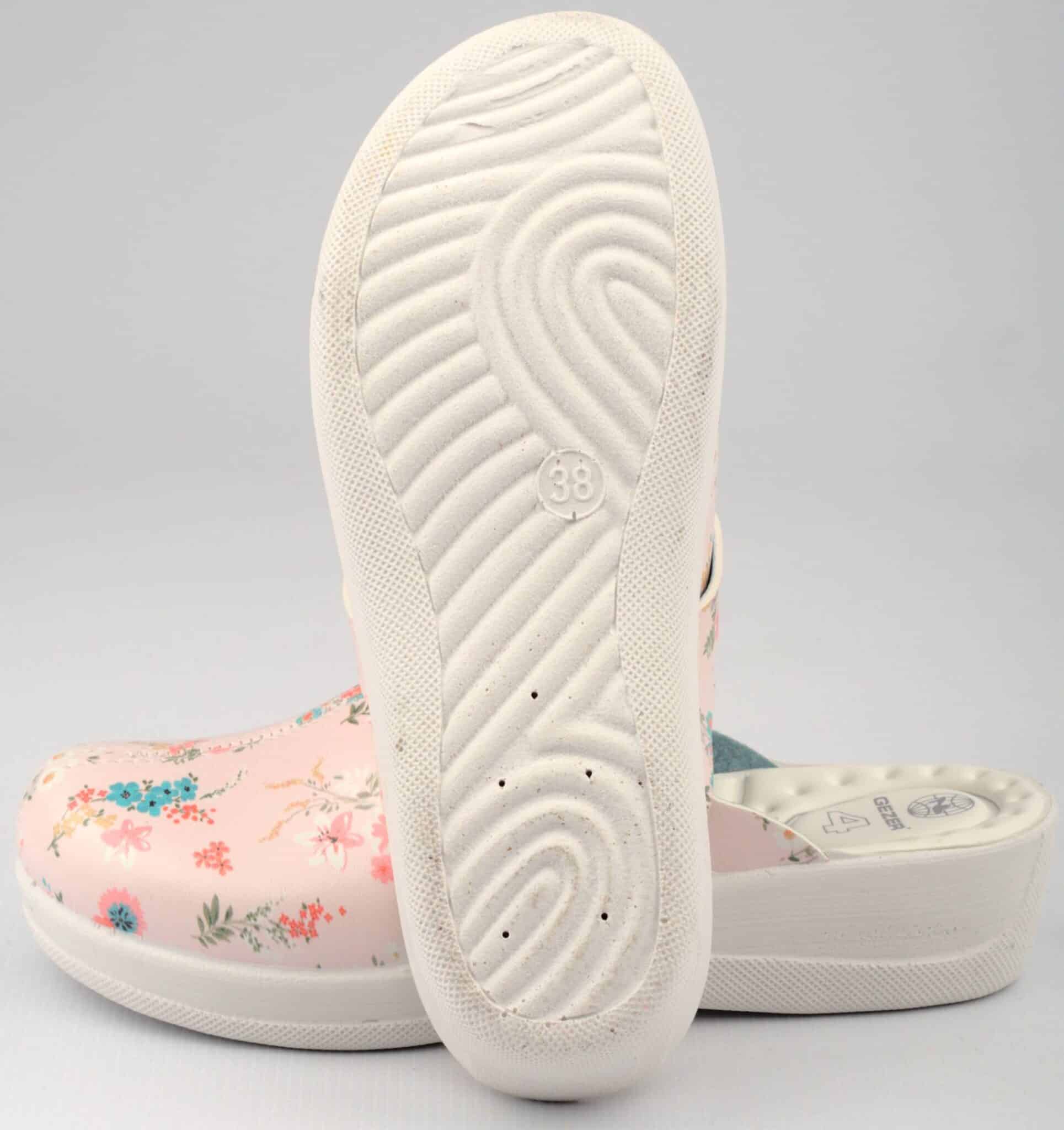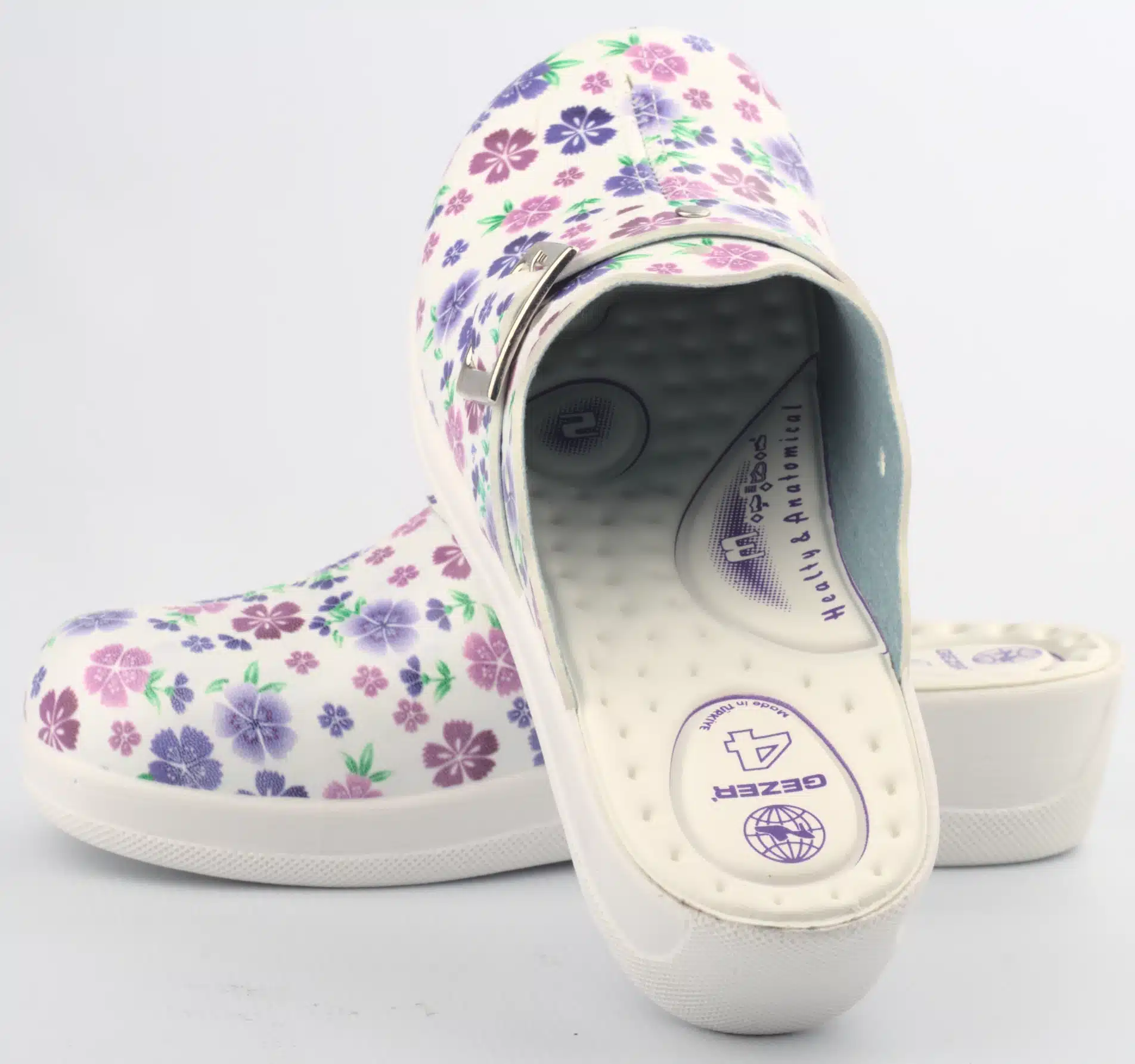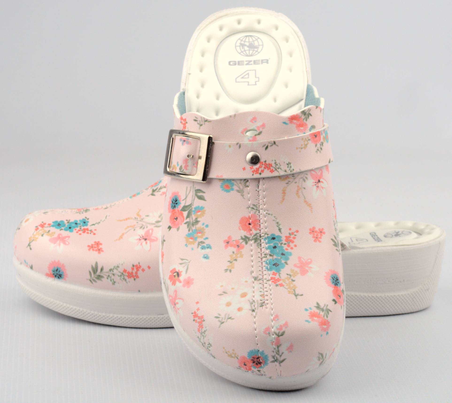 Дамско сабо Gezer с цветен принт на пеперуди и цветя и с декоративна каишка отпред. Моделът има анатомична противохлъзгаща подметка с височина на тока 4,5 см. Сабо Gezer с цветен принт е много подходящо допълнение към работната униформа на медицински и санитарни работници, на фризьори, козметици и рехабилитатори. Чудесно е и за ежедневна персонална употреба. Сабата на турската компания Gezer са проектирани за максимален комфорт при натоварен работен ден. Принтът на този модел може да бъде в различни нюанси.