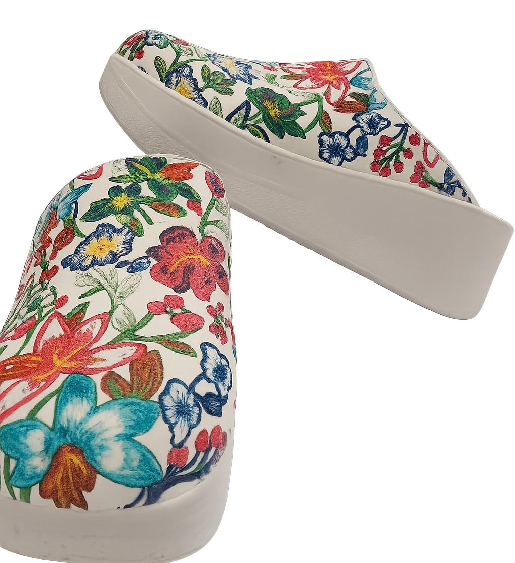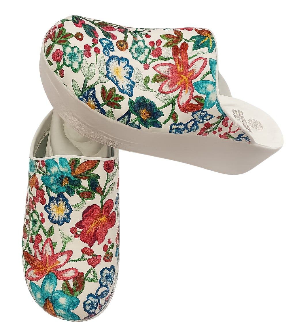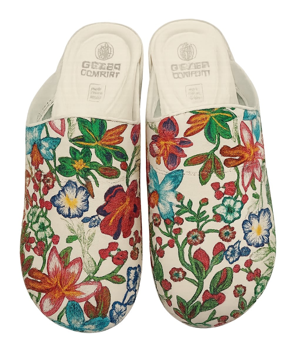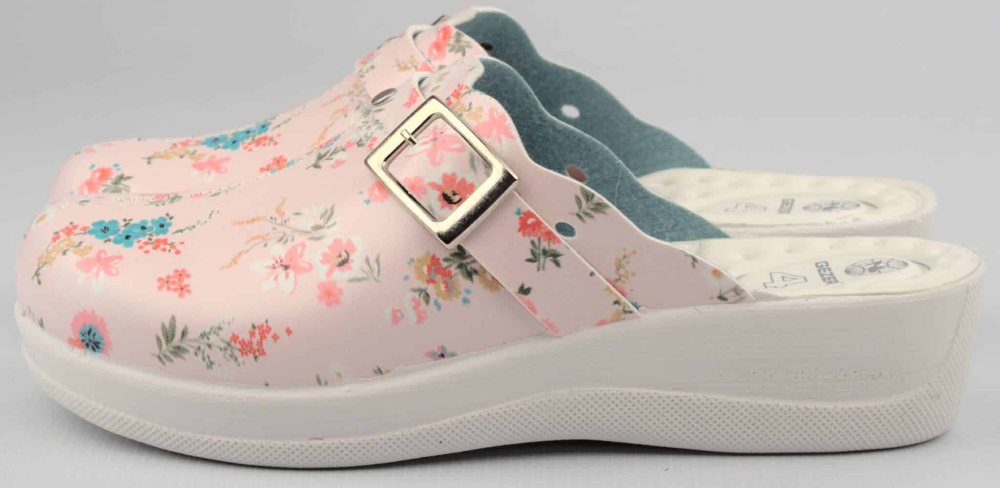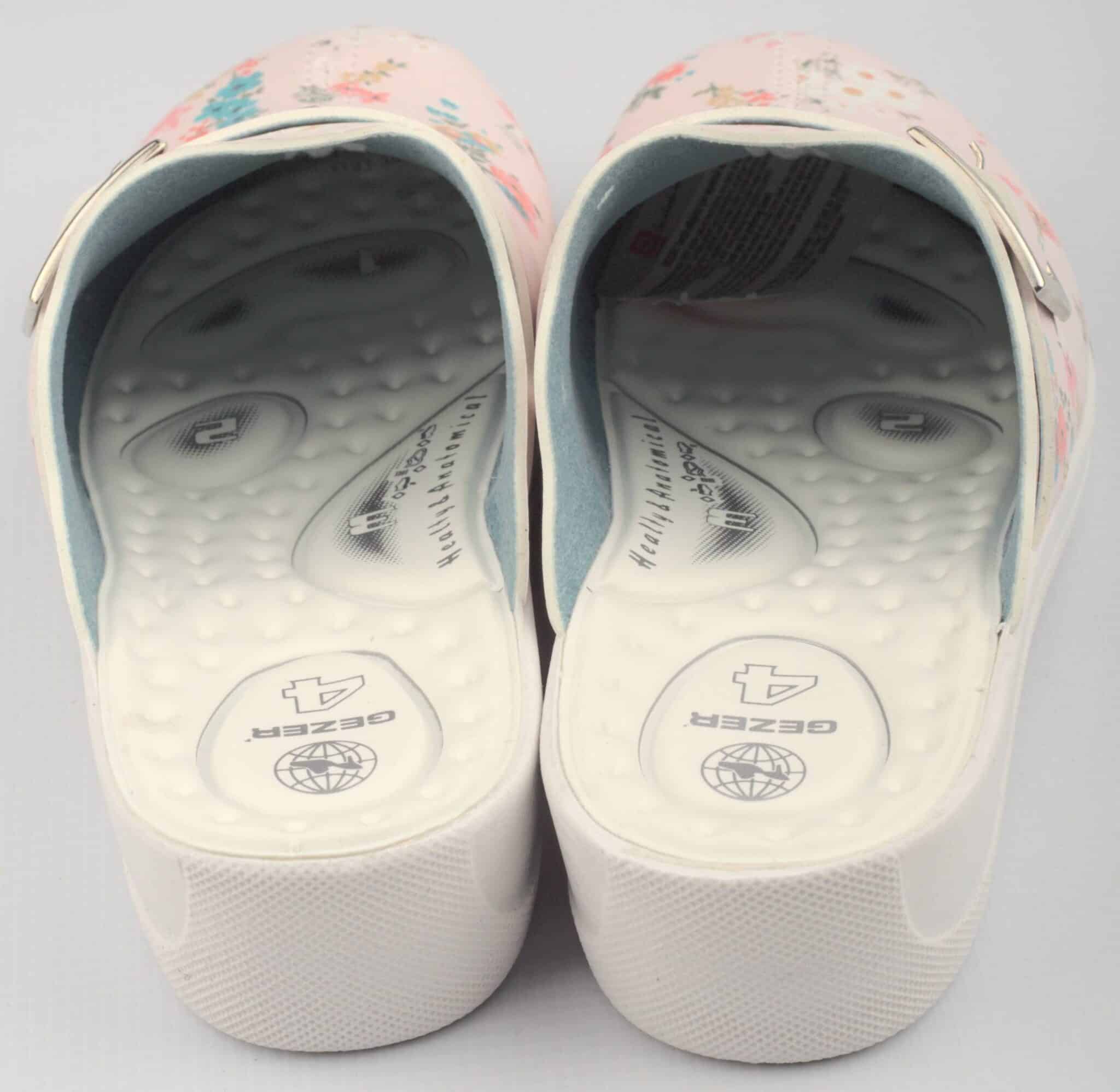 Дамско сабо Gezer с цветен принт на пеперуди и цветя и с декоративна каишка отпред. Моделът има анатомична противохлъзгаща подметка с височина на тока 4,5 см. Сабо Gezer с цветен принт е много подходящо допълнение към работната униформа на медицински и санитарни работници, на фризьори, козметици и рехабилитатори. Чудесно е и за ежедневна персонална употреба. Сабата на турската компания Gezer са проектирани за максимален комфорт при натоварен работен ден. Принтът на този модел може да бъде в различни нюанси.