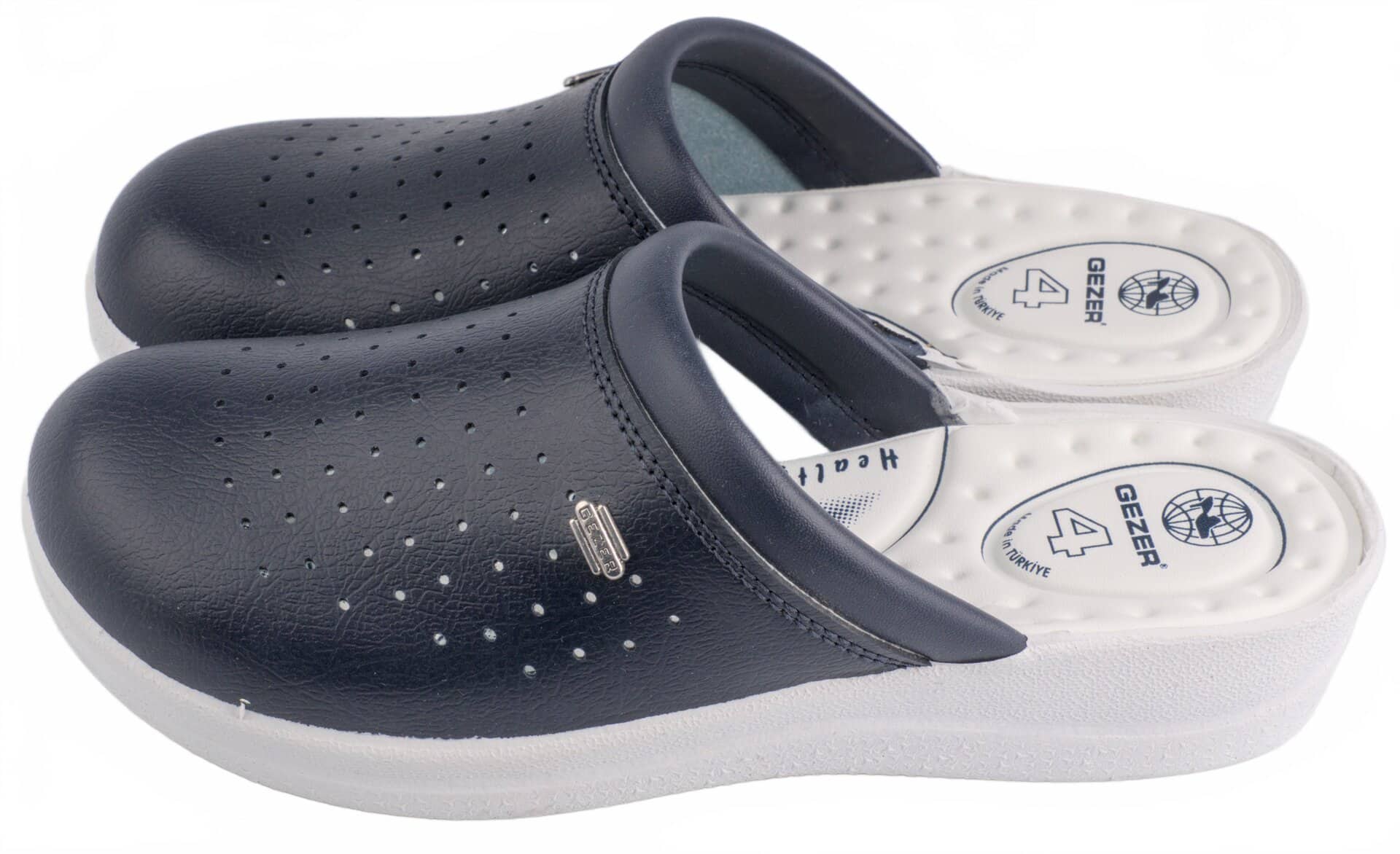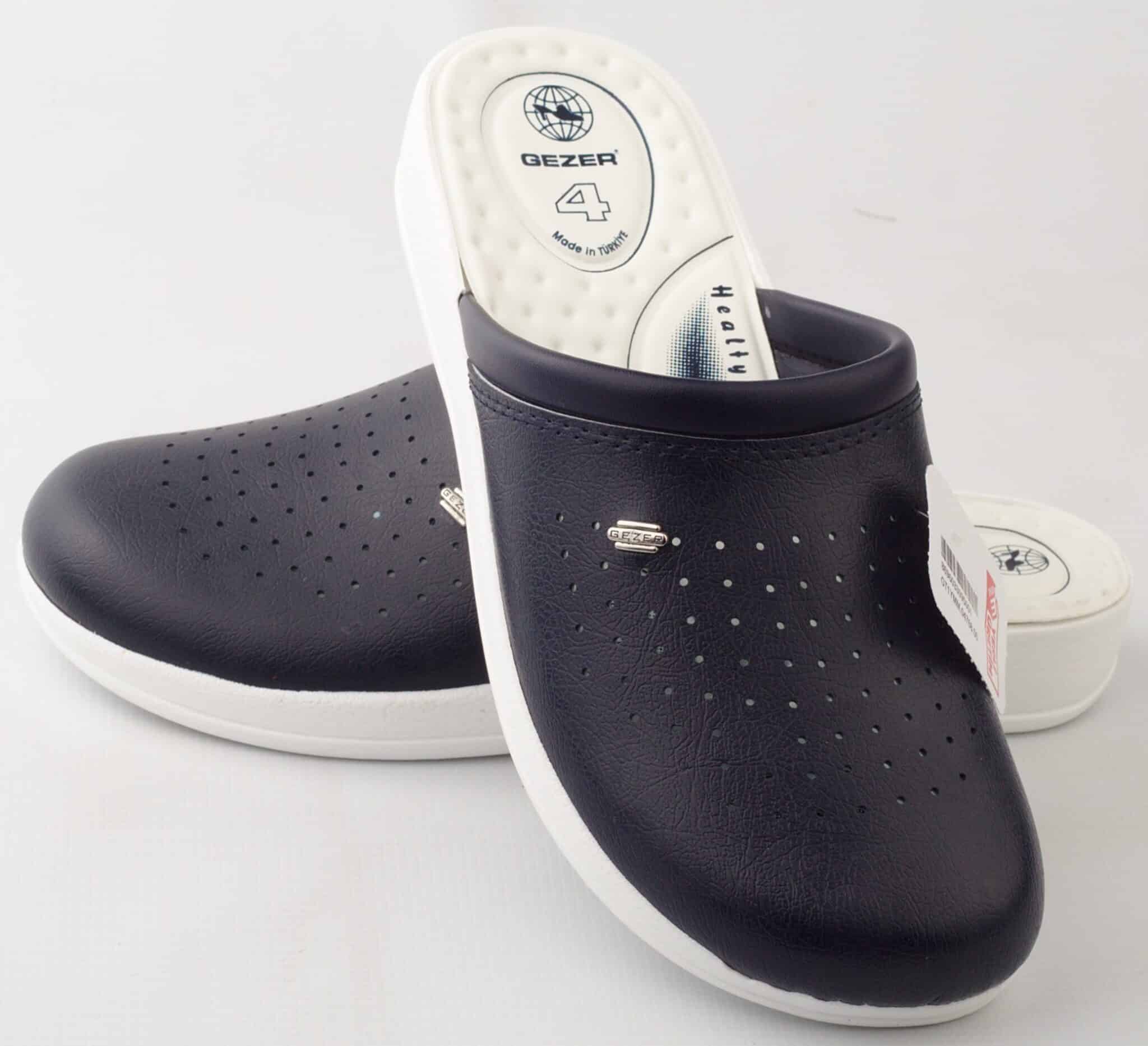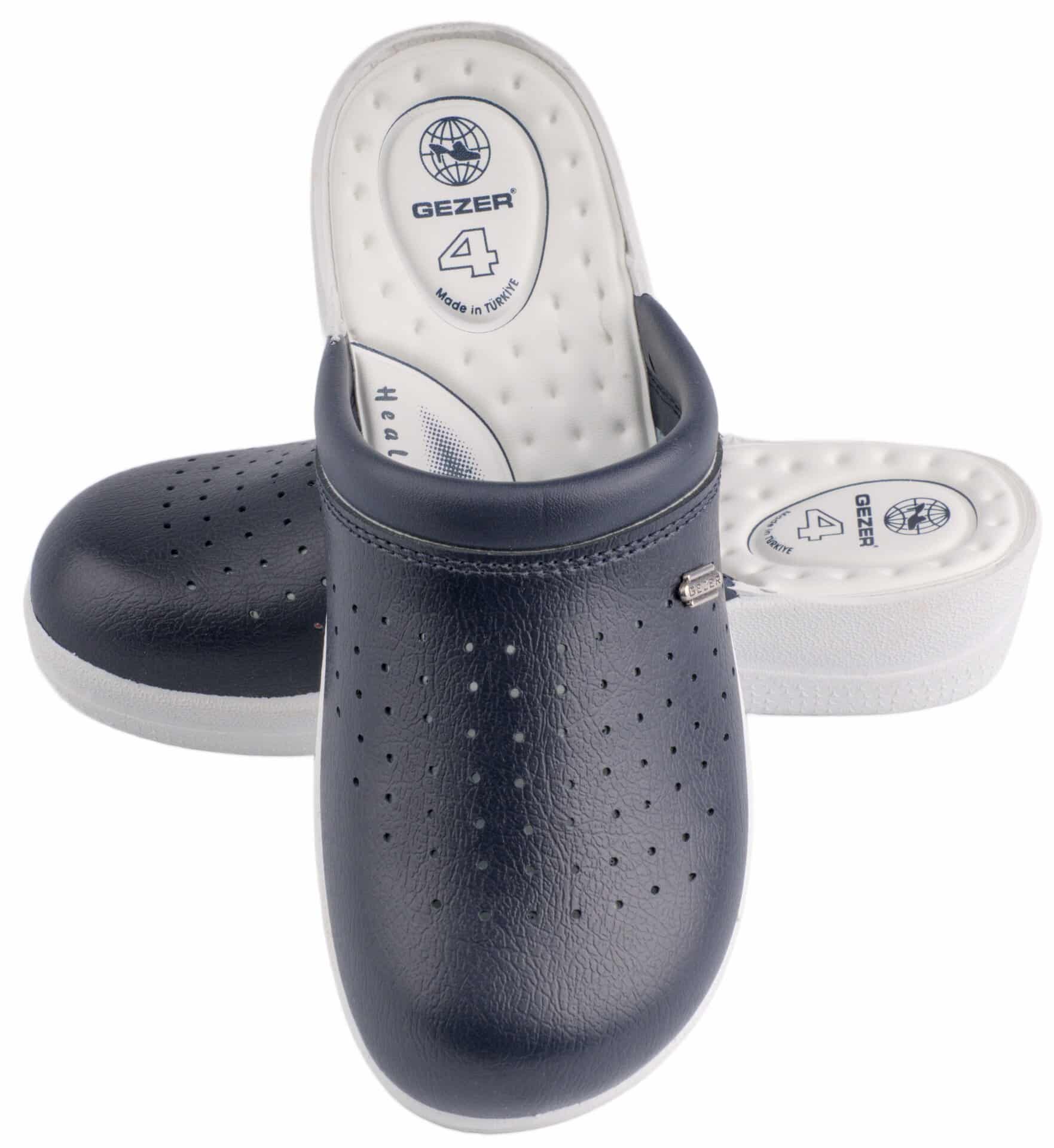 Тъмносиньо дамско сабо Gezer с анатомична, противохлъзгаща подметка с височина 4 см. Саята на сабото Gezer е изработена от перфорирана еко кожа за по-добра вентилация. Сабото е удобно и меко, което гарантира комфорт при дълъг работен ден. Стелката има 4 зони на комфорт за целодневно използване без умора. При някои от моделите сабото е в черен цвят с черна подметка, а при други – сабото е тъмносиньо с бяла подметка (Консултирайте се с нас преди поръчка, за да уточните наличностите). Сабо Gezer е изключително подходящо за кухненски работници, фризьорски и козметични салони, както и здравни работници. Сабата на турската компания Gezer са проектирани за максимален комфорт при натоварен работен ден. Този модел сабо се предлага и в бял цвят: разгледайте тук.