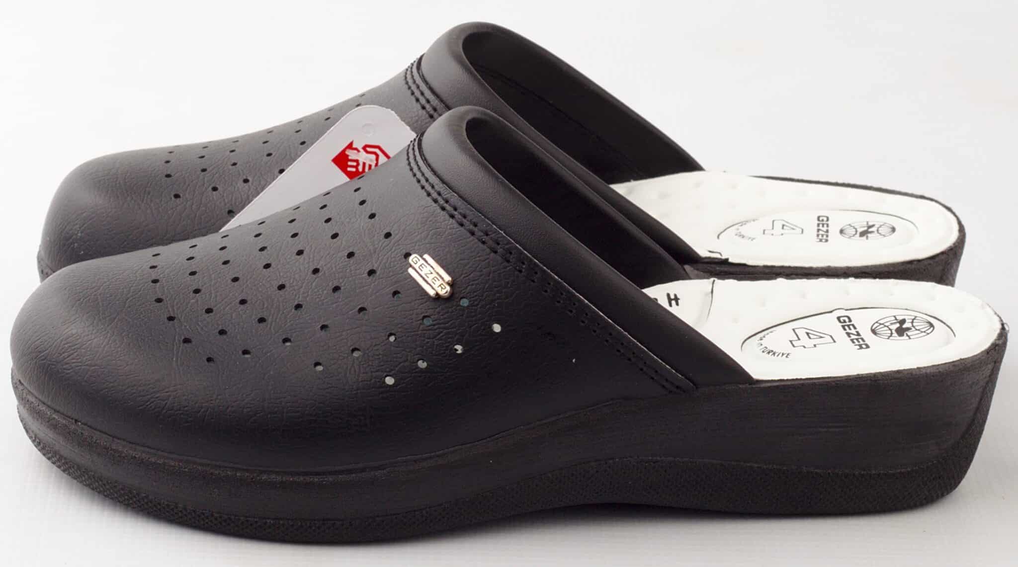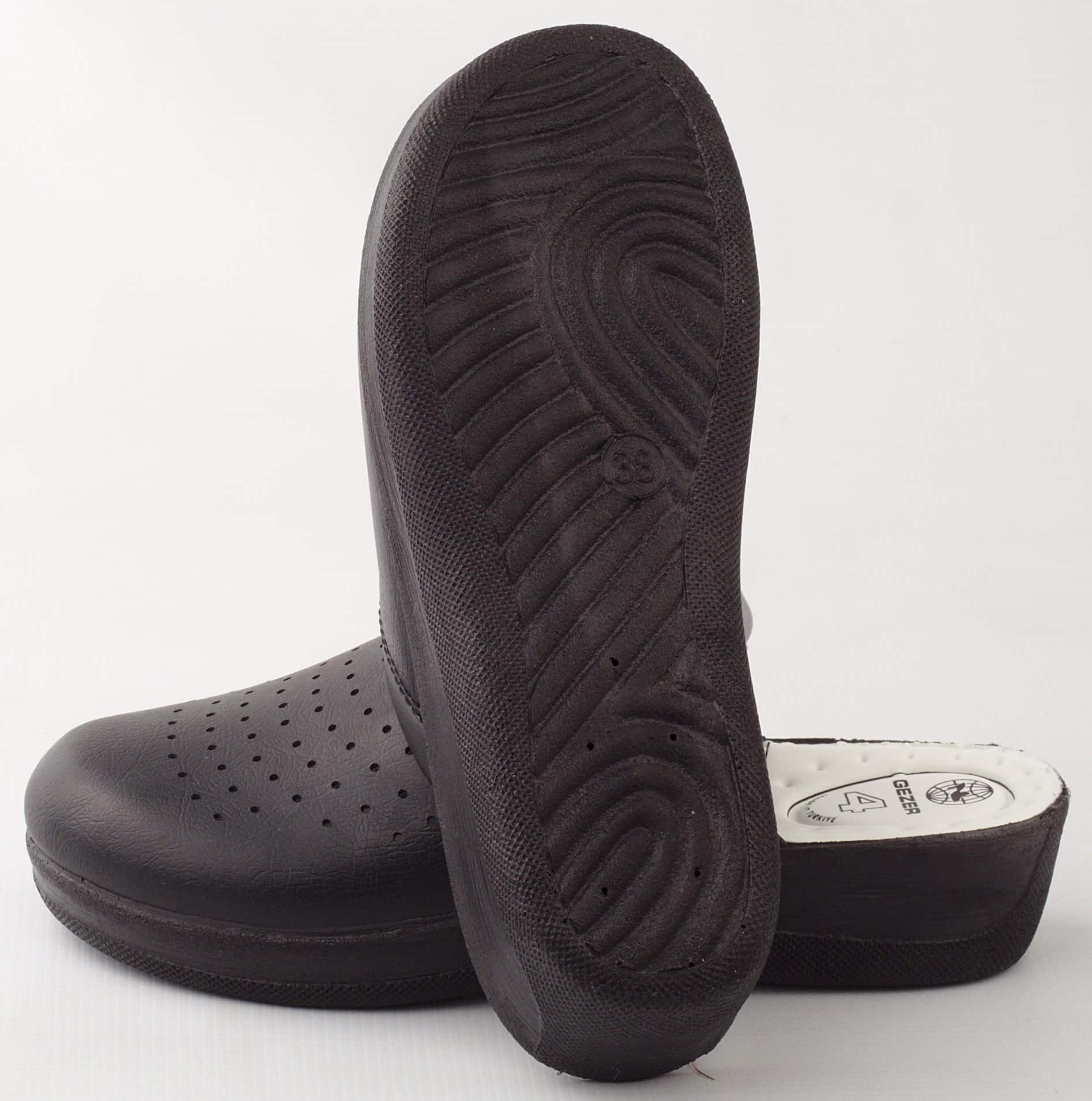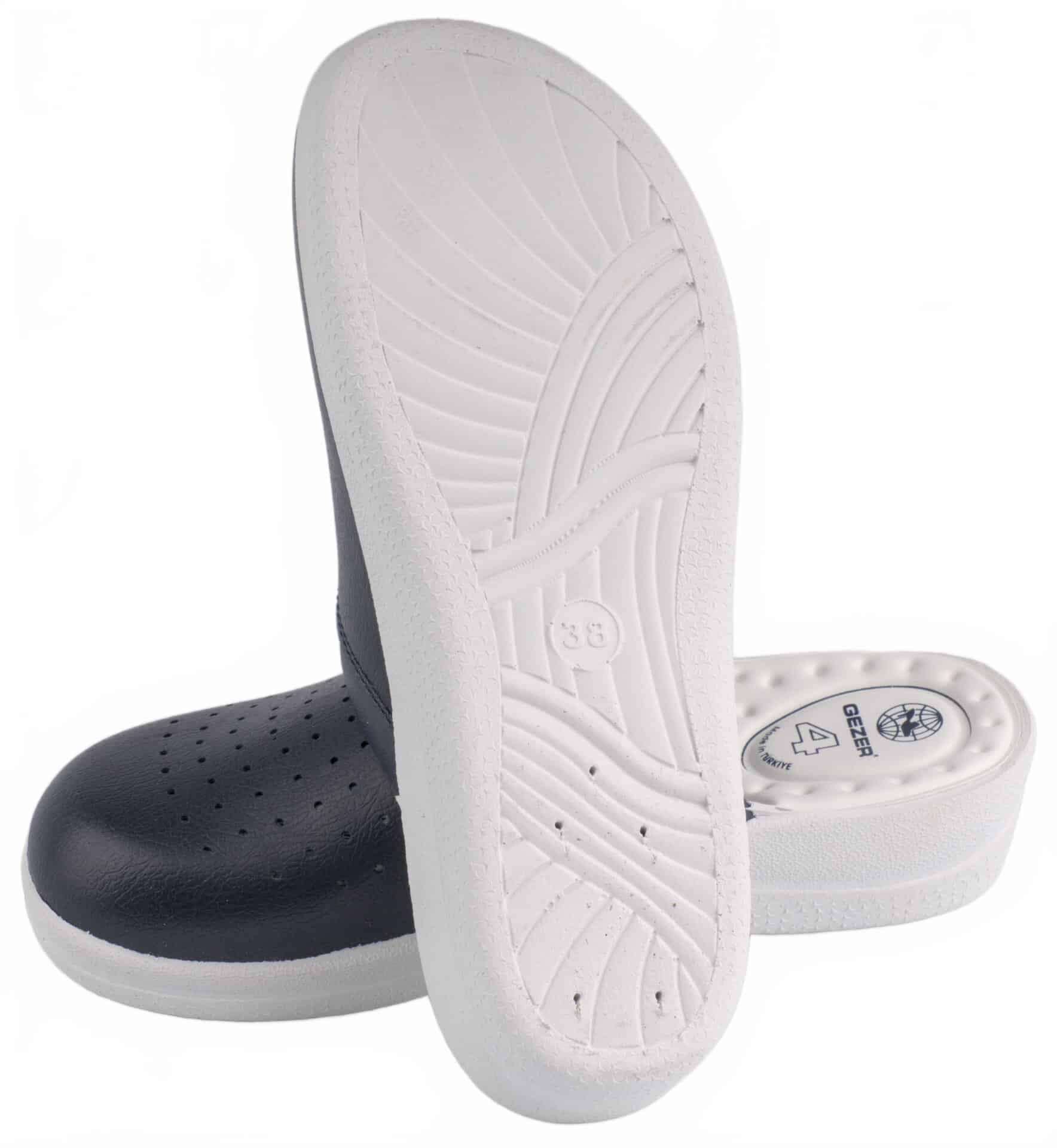 Тъмносиньо дамско сабо Gezer с анатомична, противохлъзгаща подметка с височина 4 см. Саята на сабото Gezer е изработена от перфорирана еко кожа за по-добра вентилация. Сабото е удобно и меко, което гарантира комфорт при дълъг работен ден. Стелката има 4 зони на комфорт за целодневно използване без умора. При някои от моделите сабото е в черен цвят с черна подметка, а при други – сабото е тъмносиньо с бяла подметка (Консултирайте се с нас преди поръчка, за да уточните наличностите). Сабо Gezer е изключително подходящо за кухненски работници, фризьорски и козметични салони, както и здравни работници. Сабата на турската компания Gezer са проектирани за максимален комфорт при натоварен работен ден. Този модел сабо се предлага и в бял цвят: разгледайте тук.