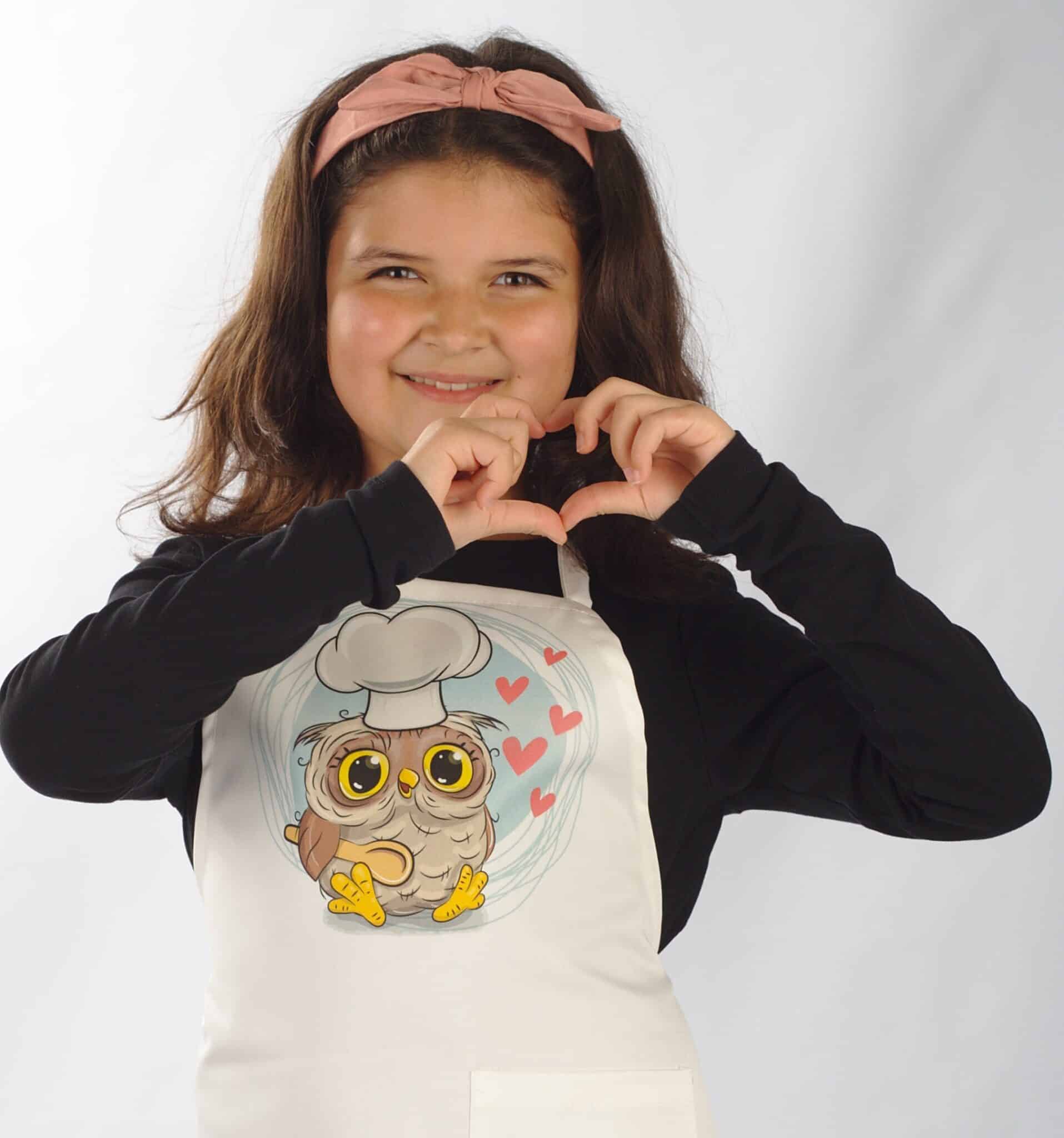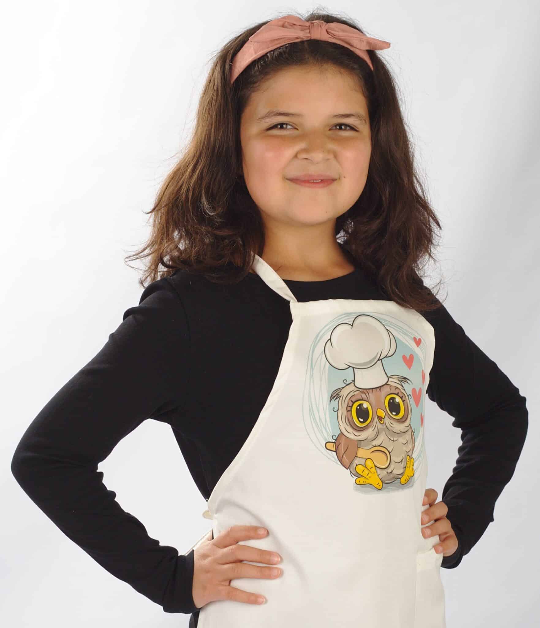 Детска готварска престилка с дигитален печат – Бухалче. Престилката има връзка през врата и връзки на кръста за регулиране на ширината. Моделът е универсален размер и има дълбок страничен джоб. Материята на престилката е 100% памучна и много мека. Размерите на престилката са: дължина – 64 см, широчина в най-широката част – 46 см. Поръчайте детска готварска престилка с печат бухалче с добавка печат с име срещу доплащане от € 2,86 / 5,60 лв.