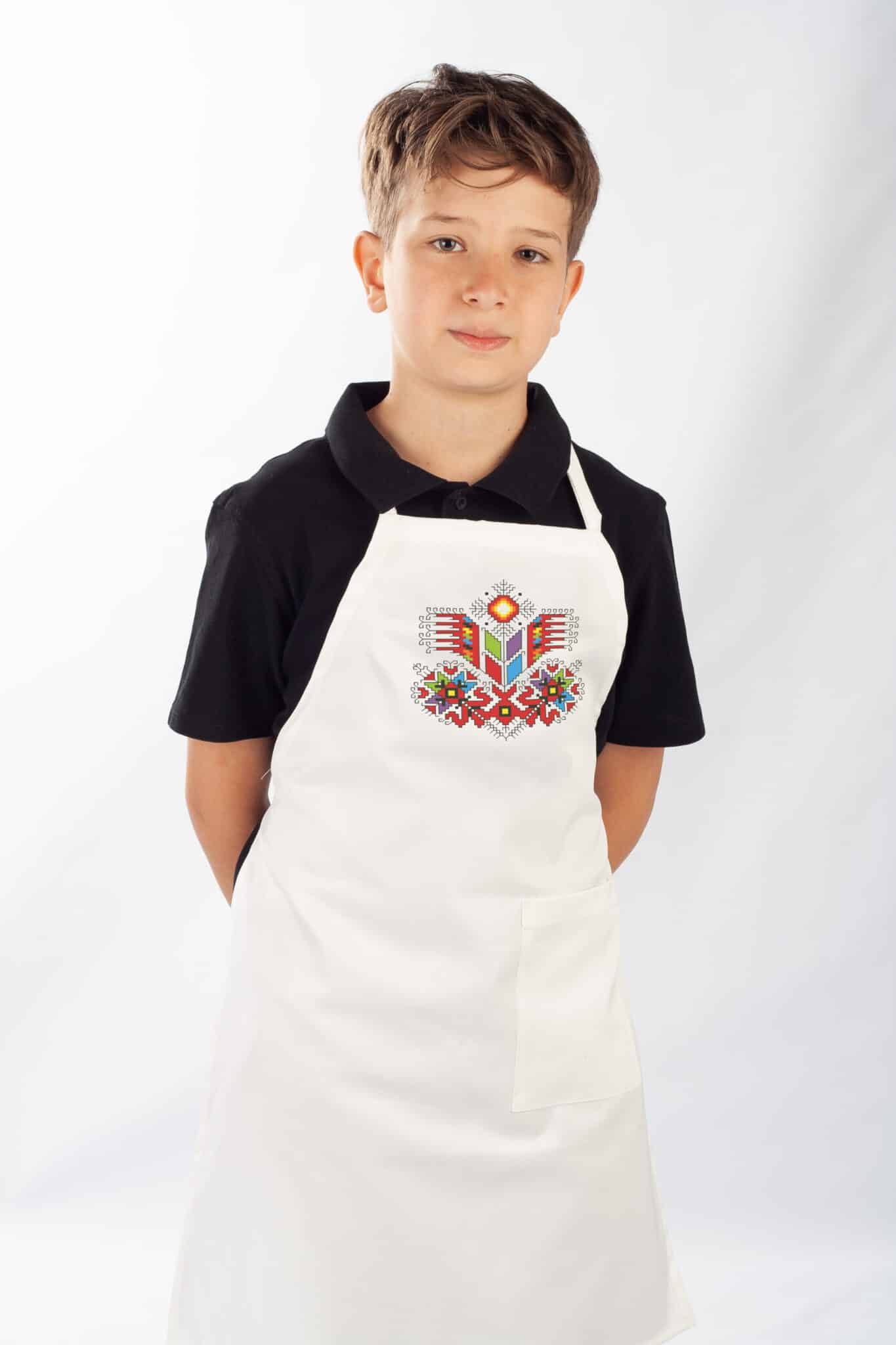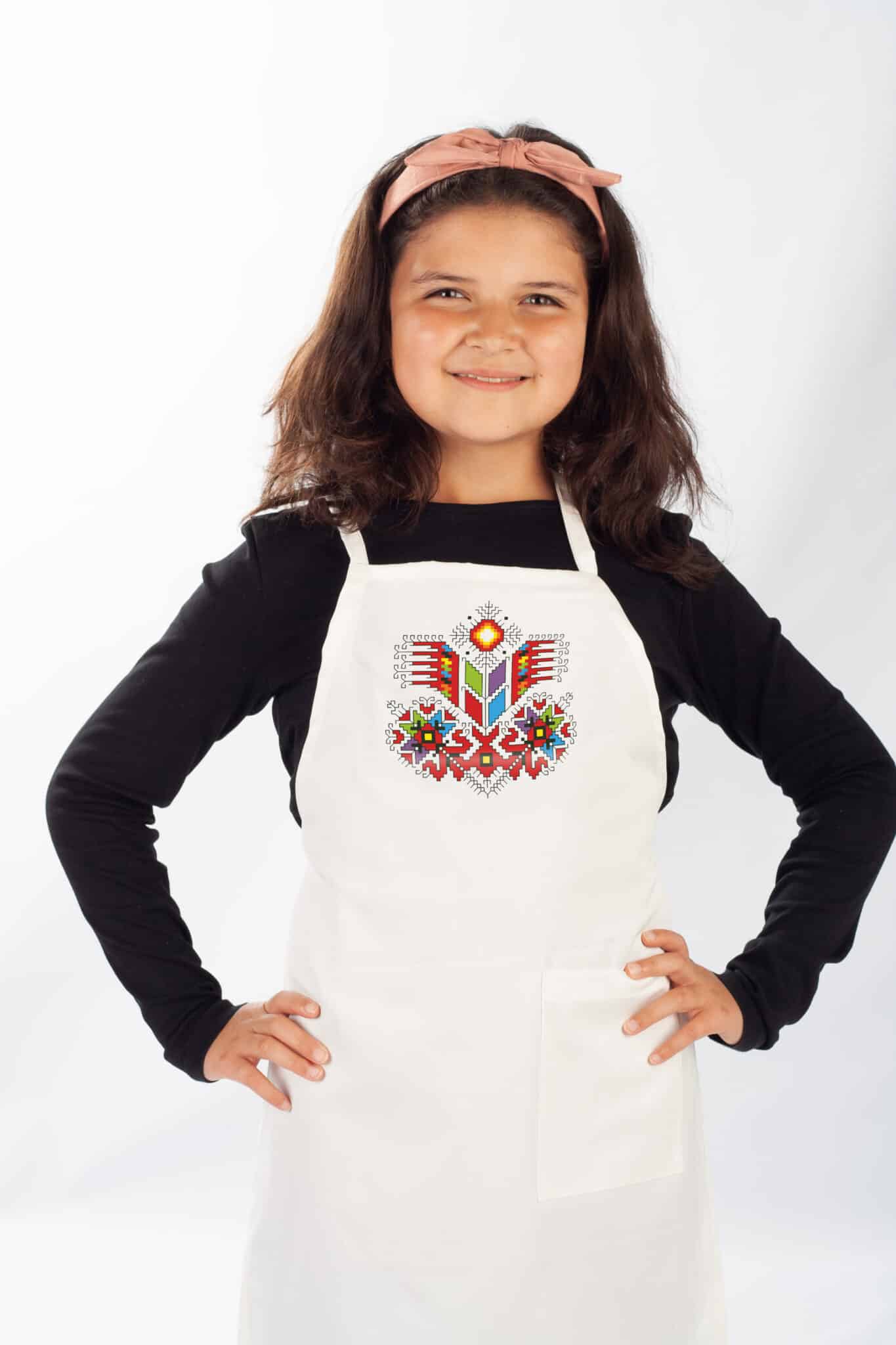 Детска готварска престилка в бял цвят през врат с печат шевица. На престилката е отпечатана шевица – Дървото на живота. Авторска разработка на талантливата Елисавета Йорданова. Изработена е от мек плътен плат със състав 35% памук, 65% ПЕ. Детска престилка с шевица има един дълбок страничен джоб и дълги връзки за регулиране на широчината в кръста. Детската готварска престилка е със следните размери: дължина – 64 см, широчина в най-широката част – 46 см. Може да персонализирате престилката като дабавите името на детето срещу доплащане от € 2,86 / 5,60 лв. Престилката е оригинален подарък, с който да зарадвате малките готвачи. Разгледайте и предложенията ни за детски тениски с печат и възможност за добавяне на име.