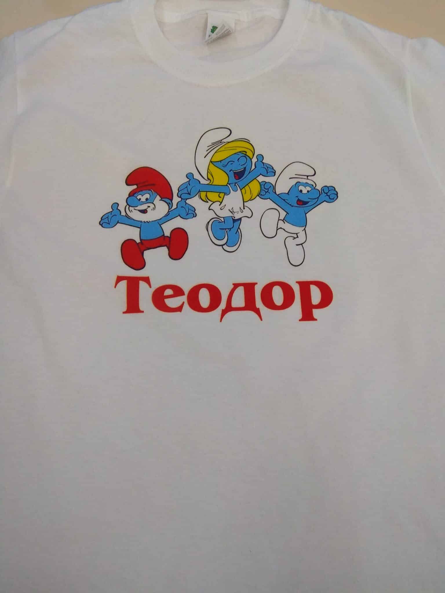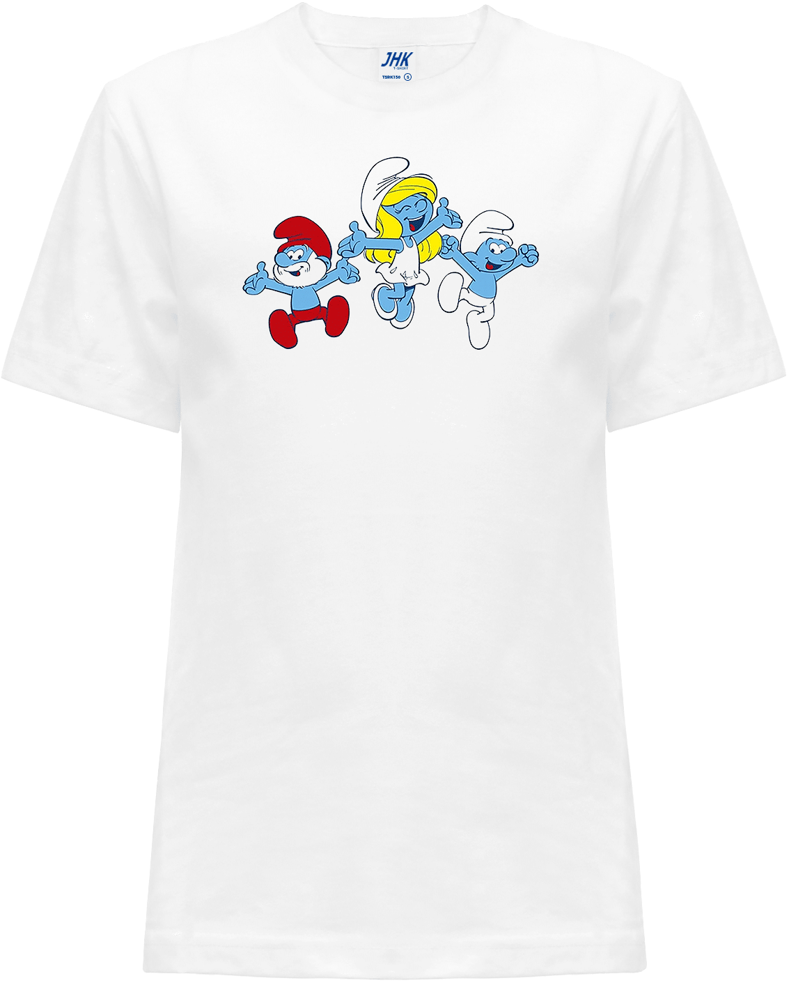 Детска памучна тениска в бял цвят с пълноцветен дигитален печат Смърфове. Материята е мека и приятна на допир. Кройката на тениската е права. Детска тениска Смърфове се предлага в 6 размера: от 2 до 12 години. По желание на клиента можем да добавим името на детето срещу доплащане от € 2,86 / 5,60 лв.