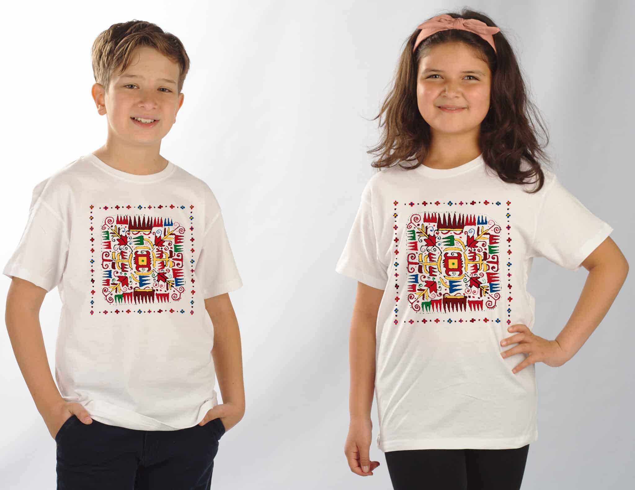 Памучна детска тениска в бял цвят с дигитален печат на шевица Слънце. Изображението е отпечатано чрез висококачествен DTF печат. Тази техника на печат осигурява устойчивост при пране и надраскване, както и фотографска прецизност на отпечатъка. Тениската е изработена от 100% памук и е много мека. Кройката й е права и свободна. Детска тениска с шевица Слънце се предлага в 6 размера: от 2 до 12 години. По ваш избор бихме могли да добавим печат с името на детето ви срещу доплащане от 2,50 лв. Може да поръчате също дамска и мъжка тениска с печат шевица Слънце.