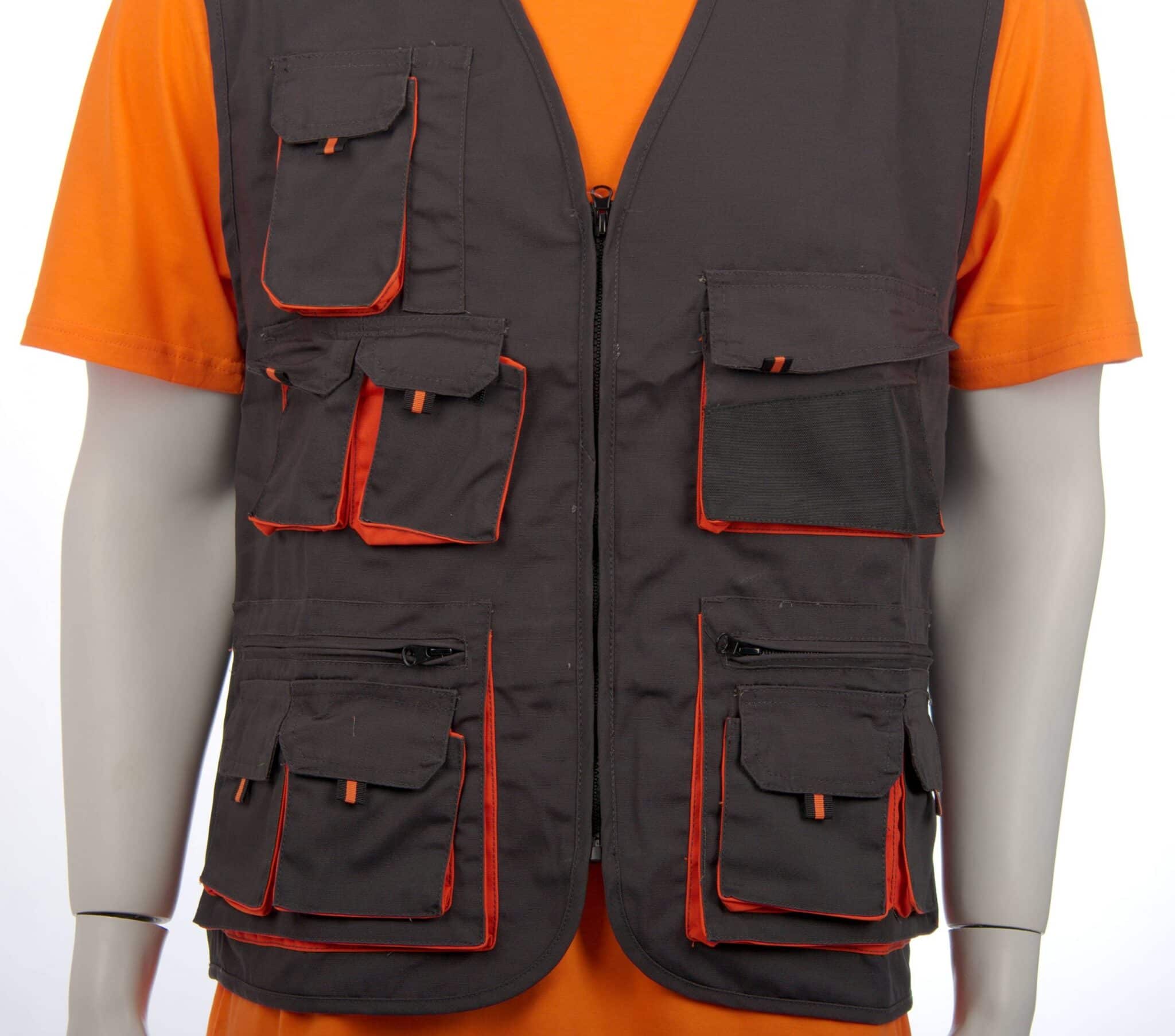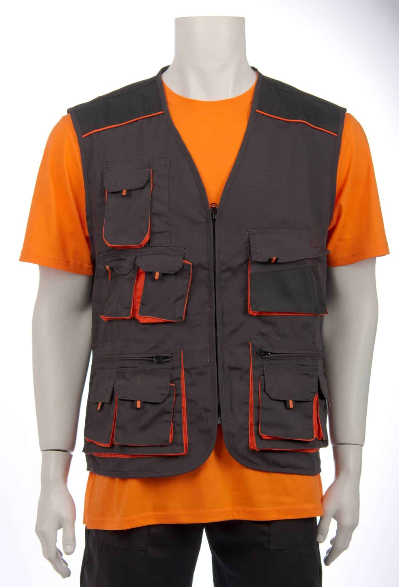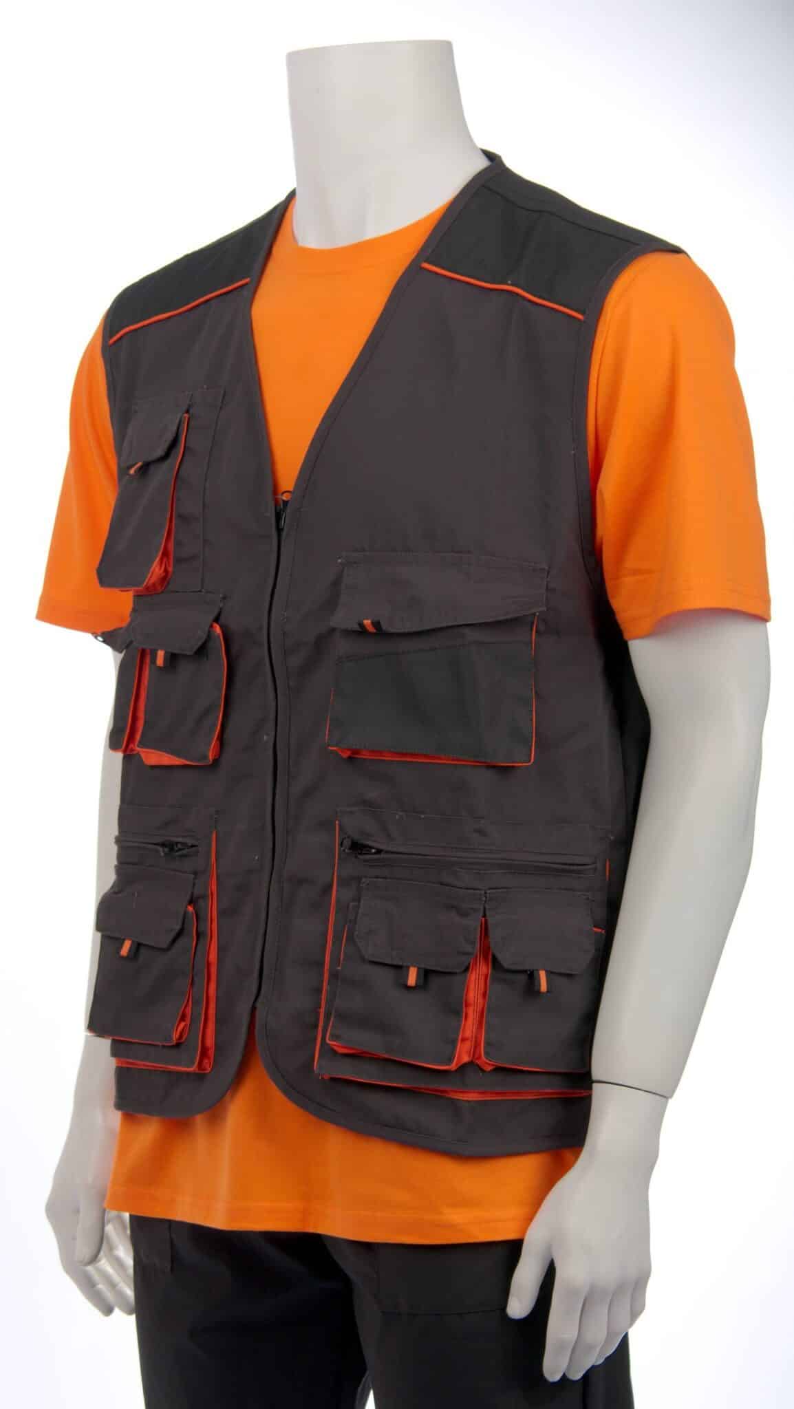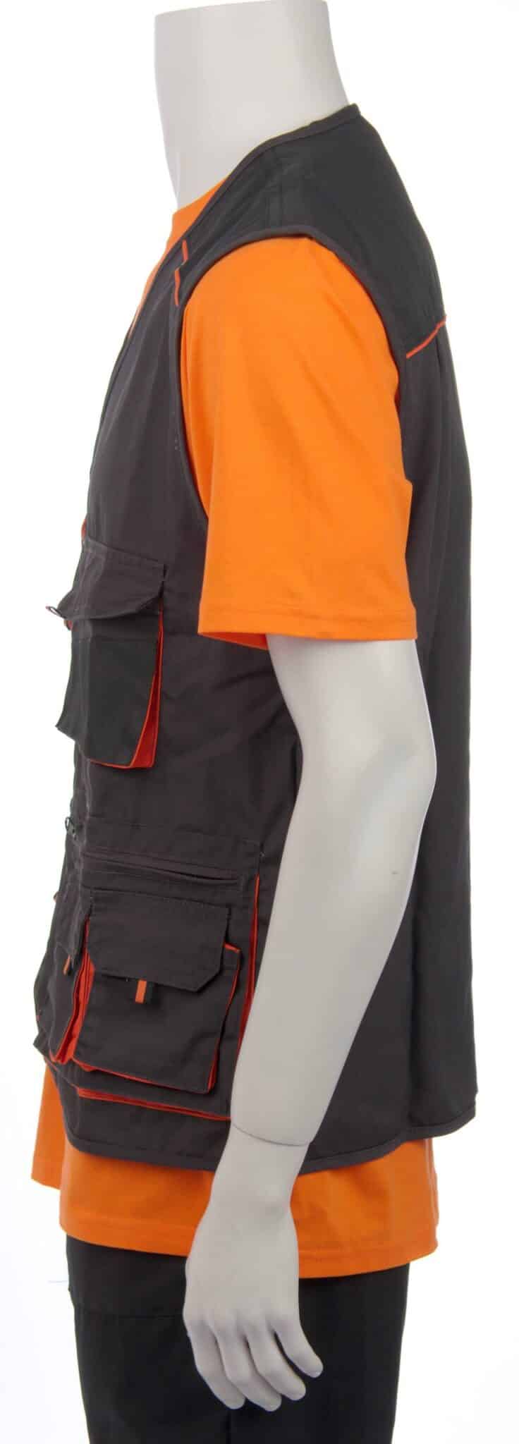 Работен елек модел Емертон тъмно сив с черно и оранжеви елементи. Моделът е снабден с десет джоба отпред и два вътрешни джоба. Подходящ е за служители в сферата на техническата поддръжка в търговски центрове и молове или цехове, за работници в складове и хранилища, автомонтьори и много други. За завършена работна униформа можете да комбинирате елек Емертон с панталон Емертон и Яке Емертон.