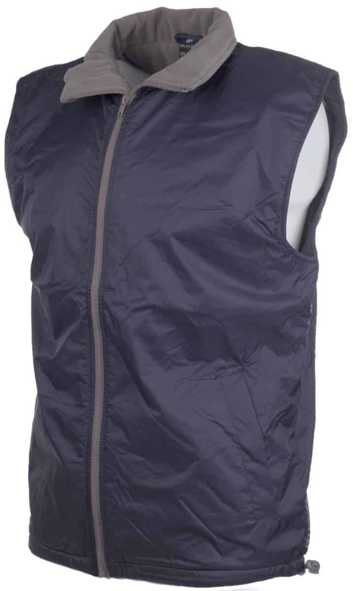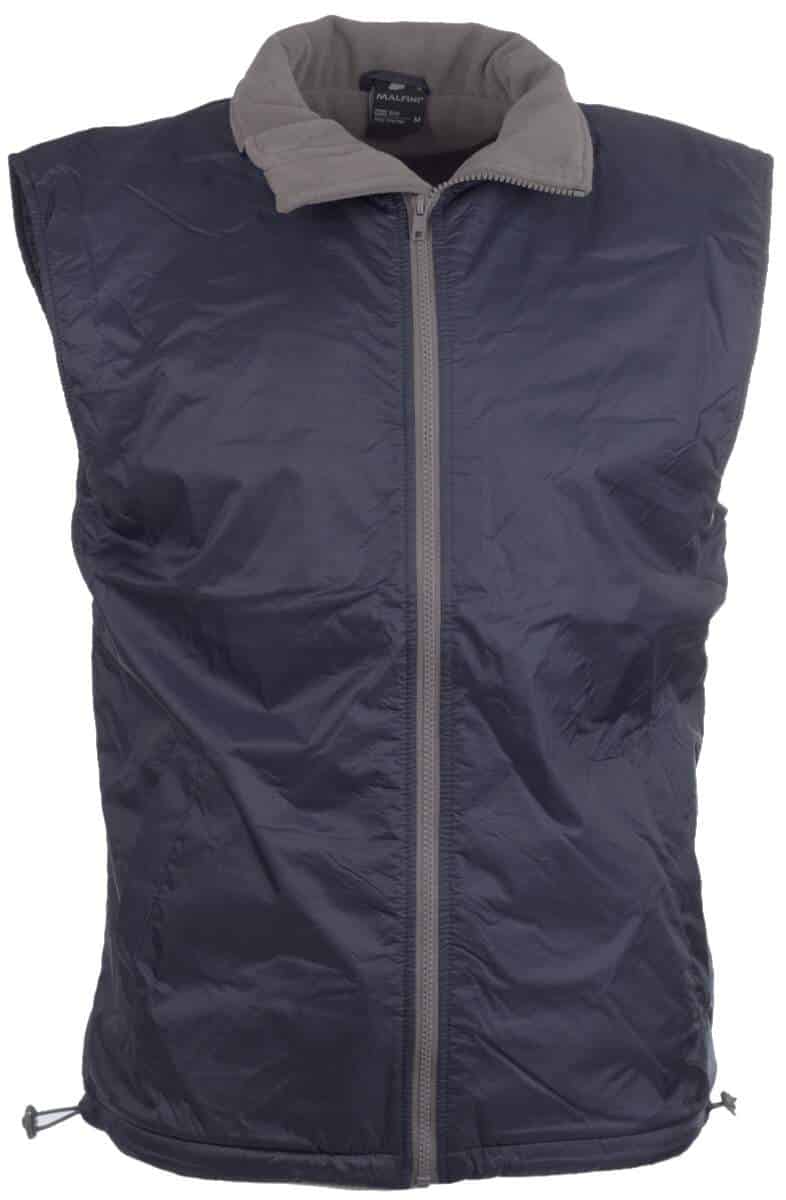 Ватиран елек Малфини наличен в размери от S до 3XL за гарантиран комфорт по време на работа. Моделът е олекотен, но ви осигурява топлина и защита. Външната част на този елек е изработена от промазана релефна материя в тъмносин цвят. Отвътре е подплатен с мек полар в контрастно сиво. Закопчаването е отпред по средата с цип също в сив цвят. Елекът има два външни джоба за ръцете и два вътрешни джоба при гърдите.