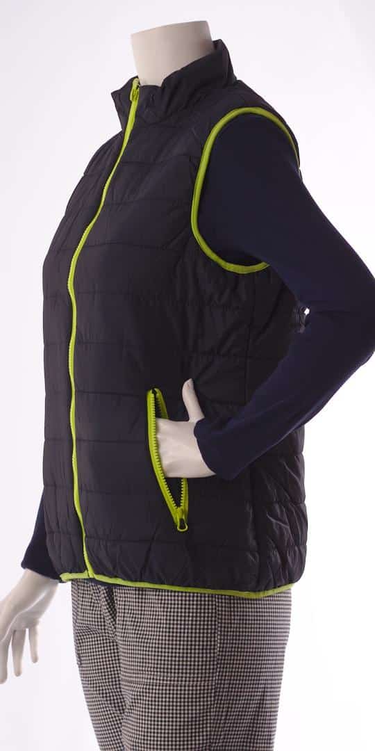 Ватиран елек дамски модел Флаш в тъмносин цвят. Изработен е от шушляков плат. Тъмносиният цвят е много практичен, а сигналните елементи осигуряват много добра видимост на далечни разстояния. Елекът е много лек и има изключително удобна кройка. Изсъхва много бързо след пране. Закопачава се с цип, има и два джоба, които също се закопчават с ципове. Подходящ е както за работа, така и за употреба в ежедневието. Дамски елек Флаш тъмносин, предлагаме още в цвят петрол и в цвят бордо.