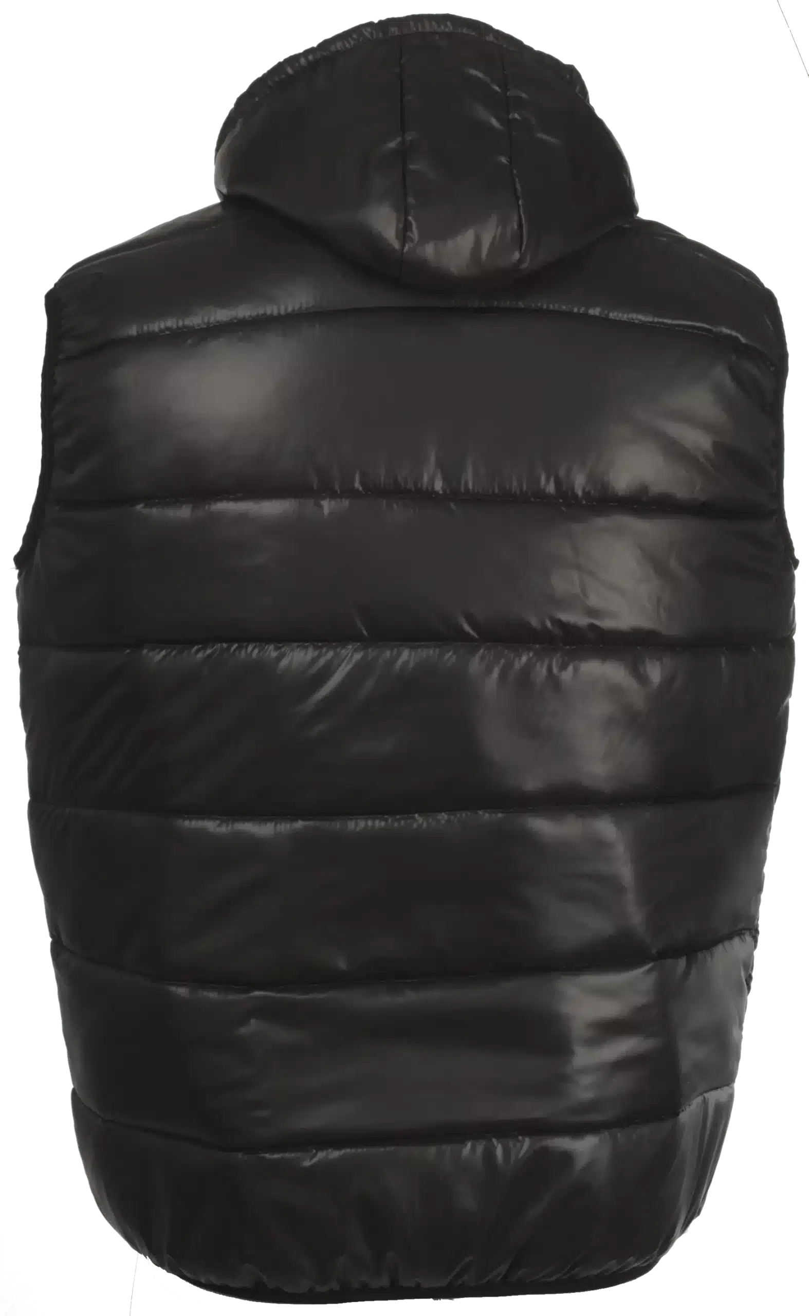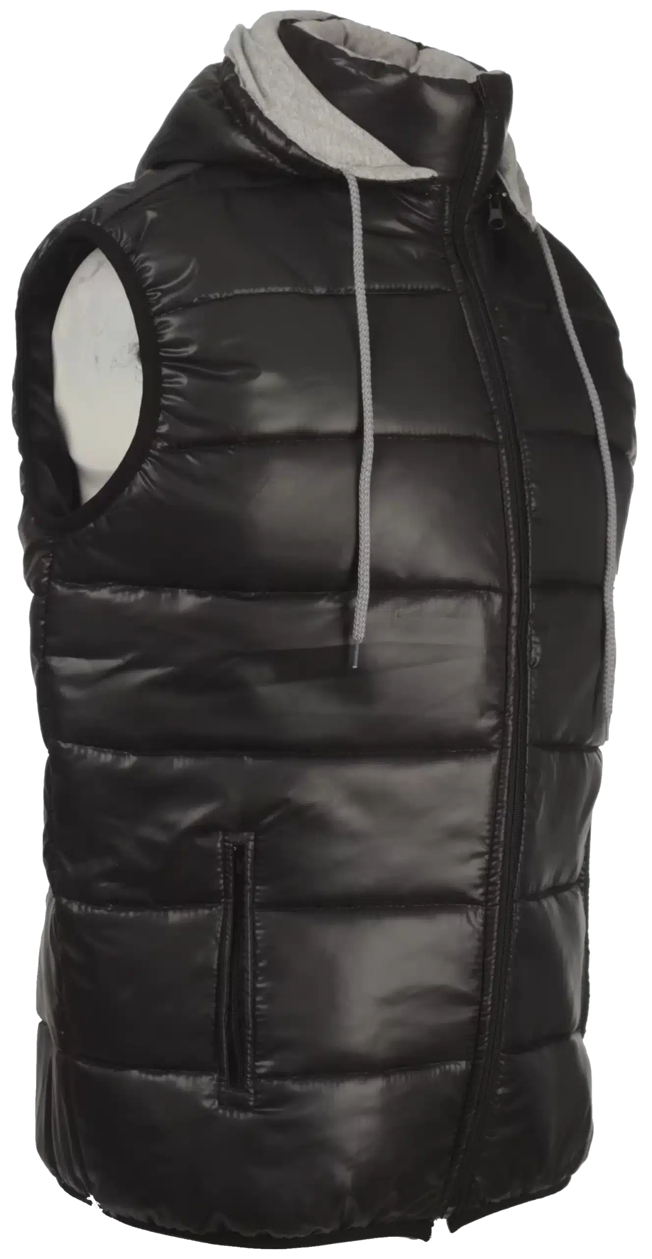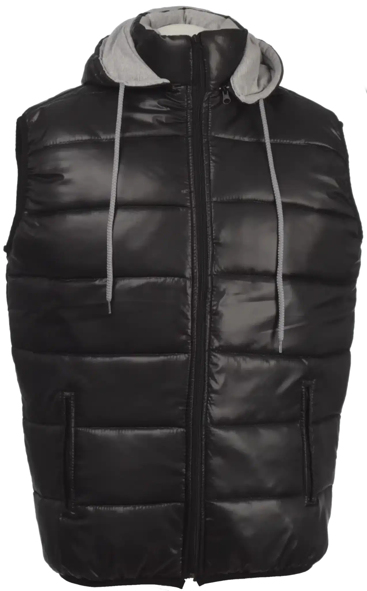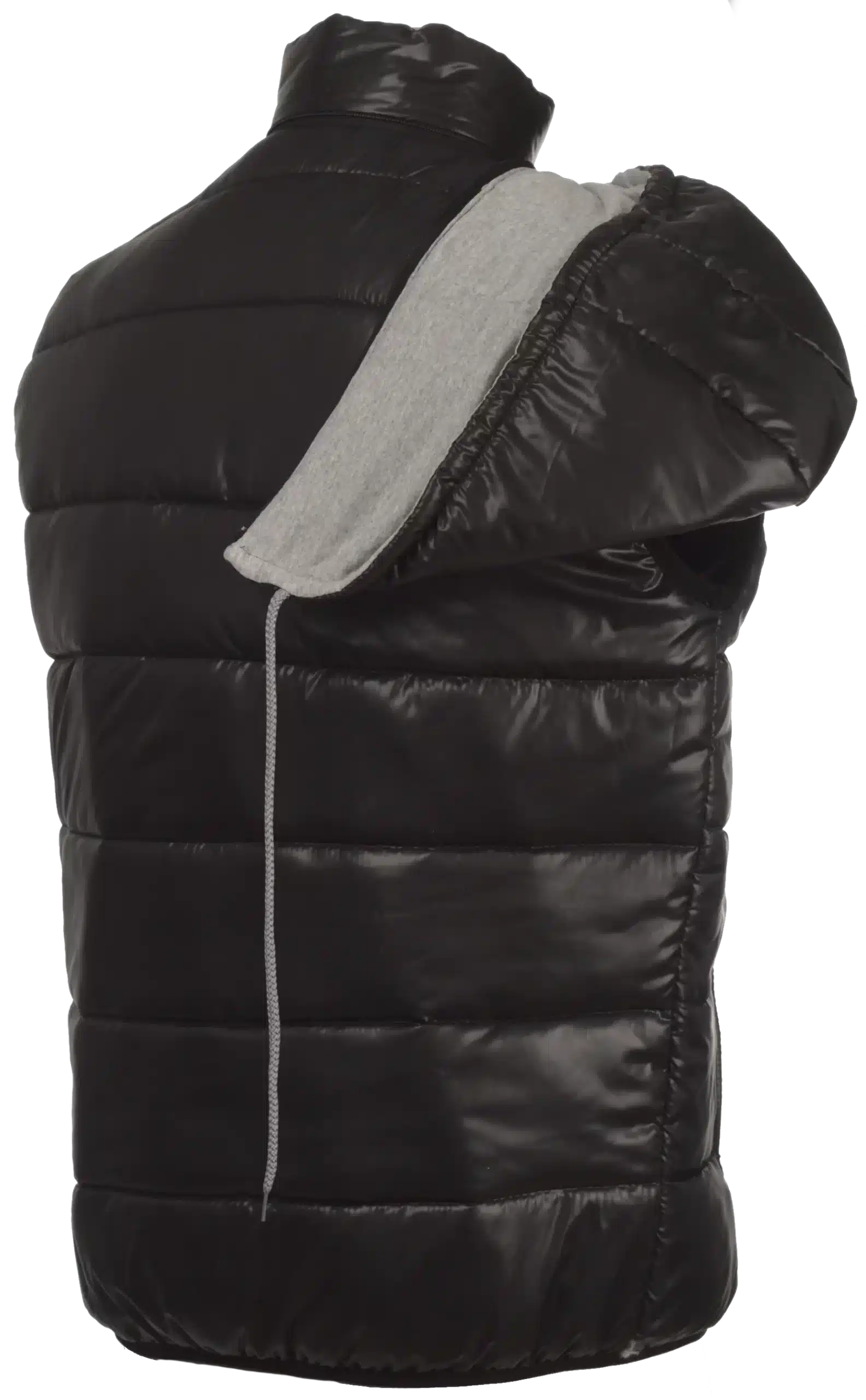Ватиран елек с качулка изработен от шушляк , в черен на цвят. Удобен, лек и практичен. Елек шушляк с качулка е изработен основно в черен цвят, като подплатата на качулката и връзки й са в светлосив меланж. Подплатата на елека е от полиестерна материя, а подплатата на качулката е от меко трико. Калучката може да се сваля с помощта на цип. Елекът се закопчава с цип отпред по средата и има два джоба, които също се закопчават с ципове. При отворите за ръцете и в долната си част е завършен с ластично бие. Моделът е подходящ за част от работната ви униформа през студените месеци от годината. Отличен е също за ежедневна лична употреба.
