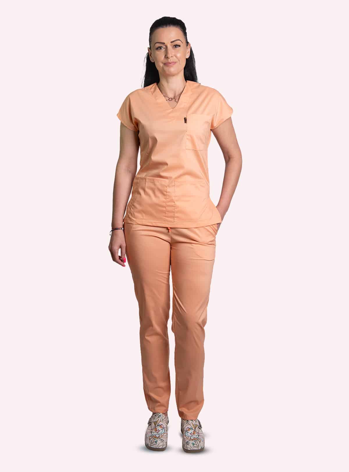 Втален медицински костюм банан от две части – туника и панталон. Туниката има общо 3 джоба, панталонът е с два италиански джоба и ластик с връзки на кръста. Втален костюм в цвят банан може да поръчате в 7 размера от XS до 3XL. Материята на този костюм е много лека и еластична. Не се мачка много и е лесна за поддръжка. Предлагаме опция за брандиране на медицински униформи с рекламно лого чрез бродерия, или печат. Имате възможност да поръчате самостоятелно панталон банан, както и туника с цвят банан.