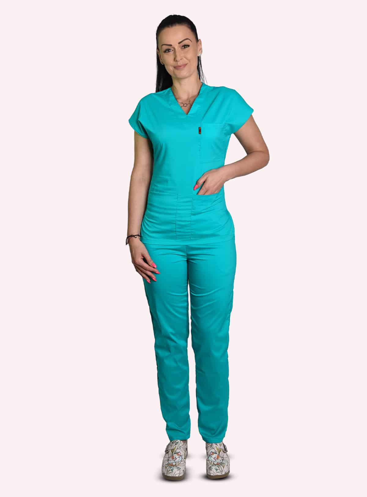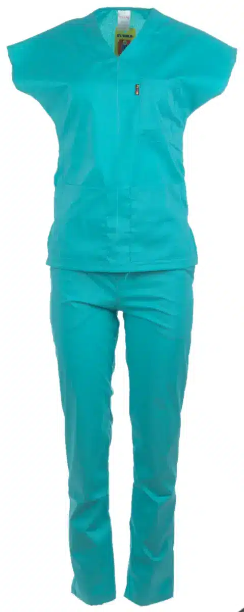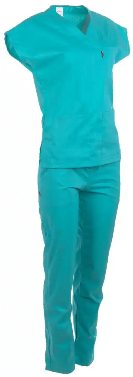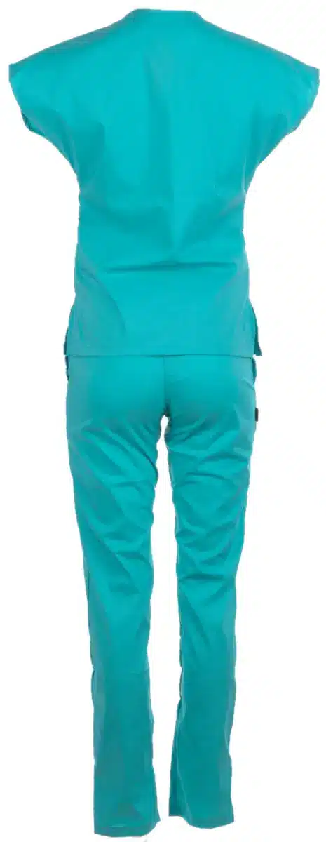 Медицински костюм с втален силует, изработен в цвят мента от мека и лека материя с еластичност. Комплектът се състои от туника с къс ръкав и дълъг панталон. Туниката има остро деколте и три джоба за лесно и удобно съхранение на аксесоари и инструменти от първа необходимост. Панталонът е изработен с ластик и връзки на кръста. Има два италиански джоба за допълнително удобство. Костюм втален в цвят мента е много подходящ за медицински, санитарни работници и рехабилитатори. Подходящо работно облекло е също за персонал в детски заведения, кухни и салони за красота. Можете да поръчате и по отделно медицинска вталена туника, както и унисекс в цвят мента и панталон втален , или унисекс в цвят мента.