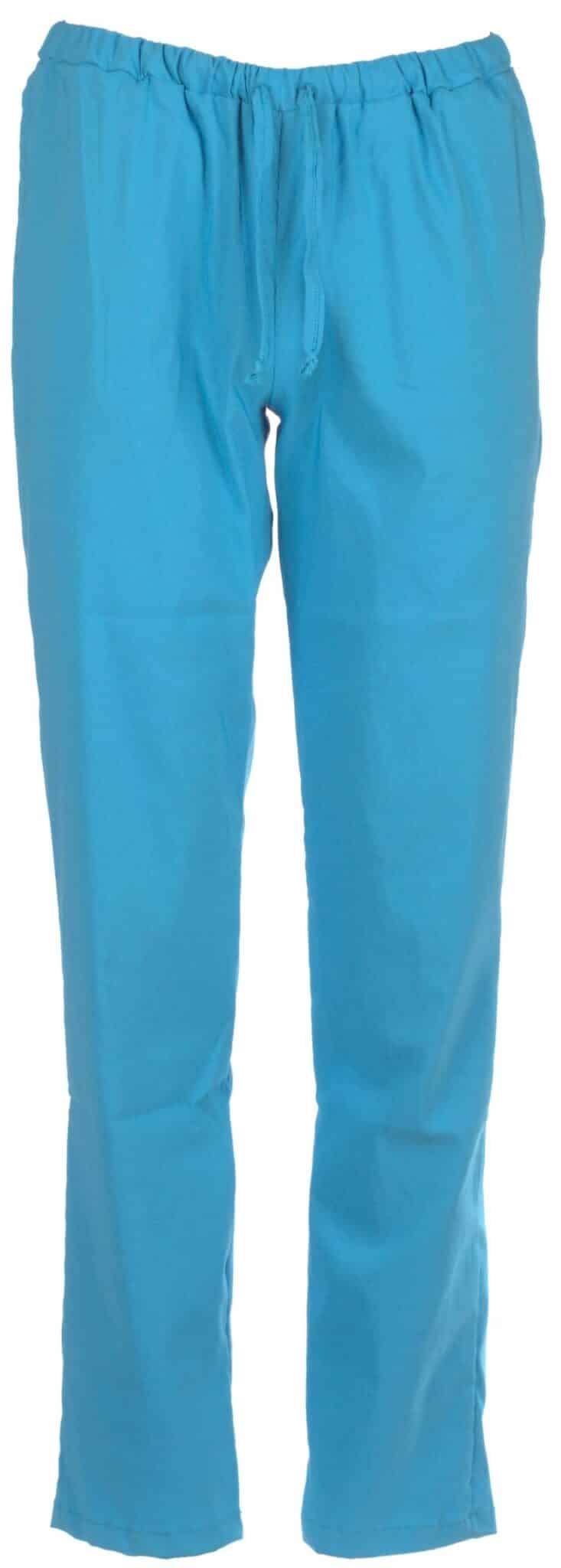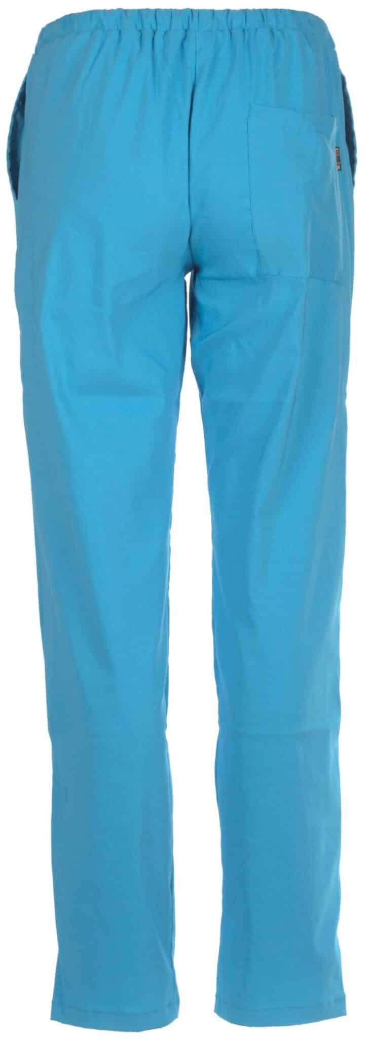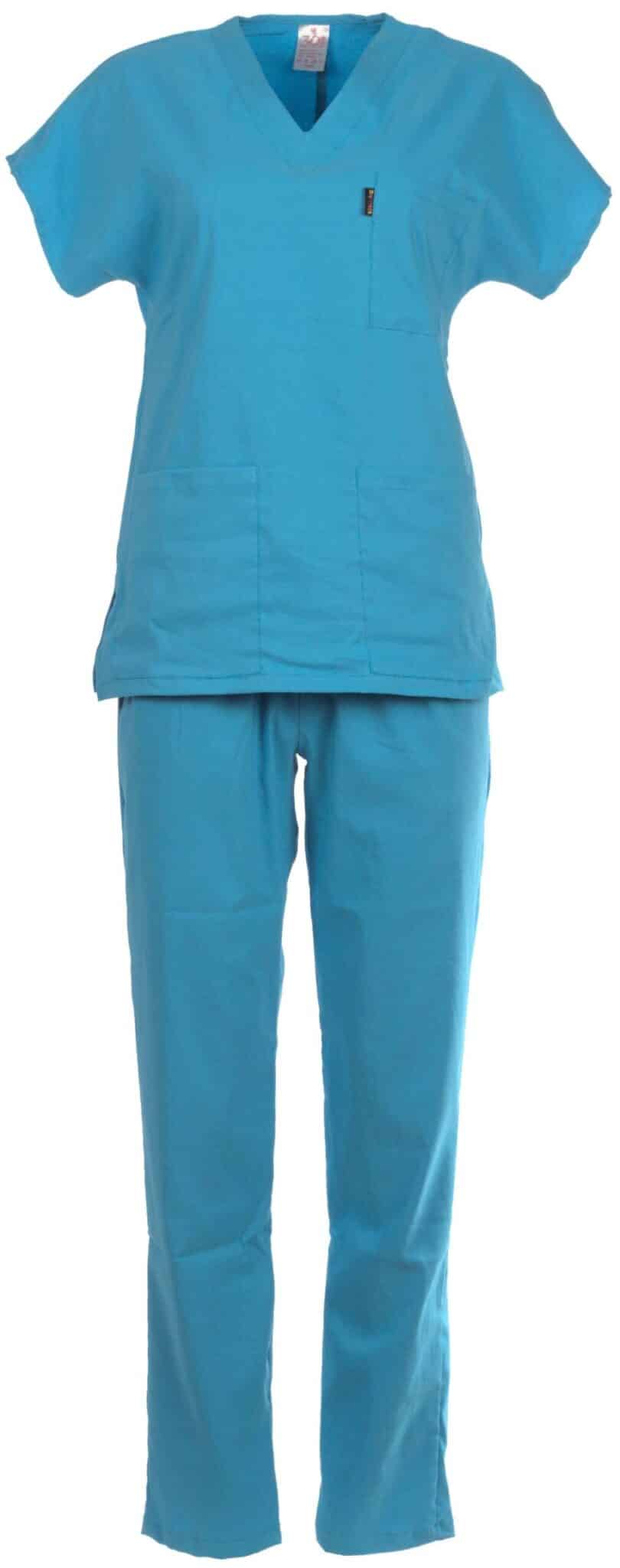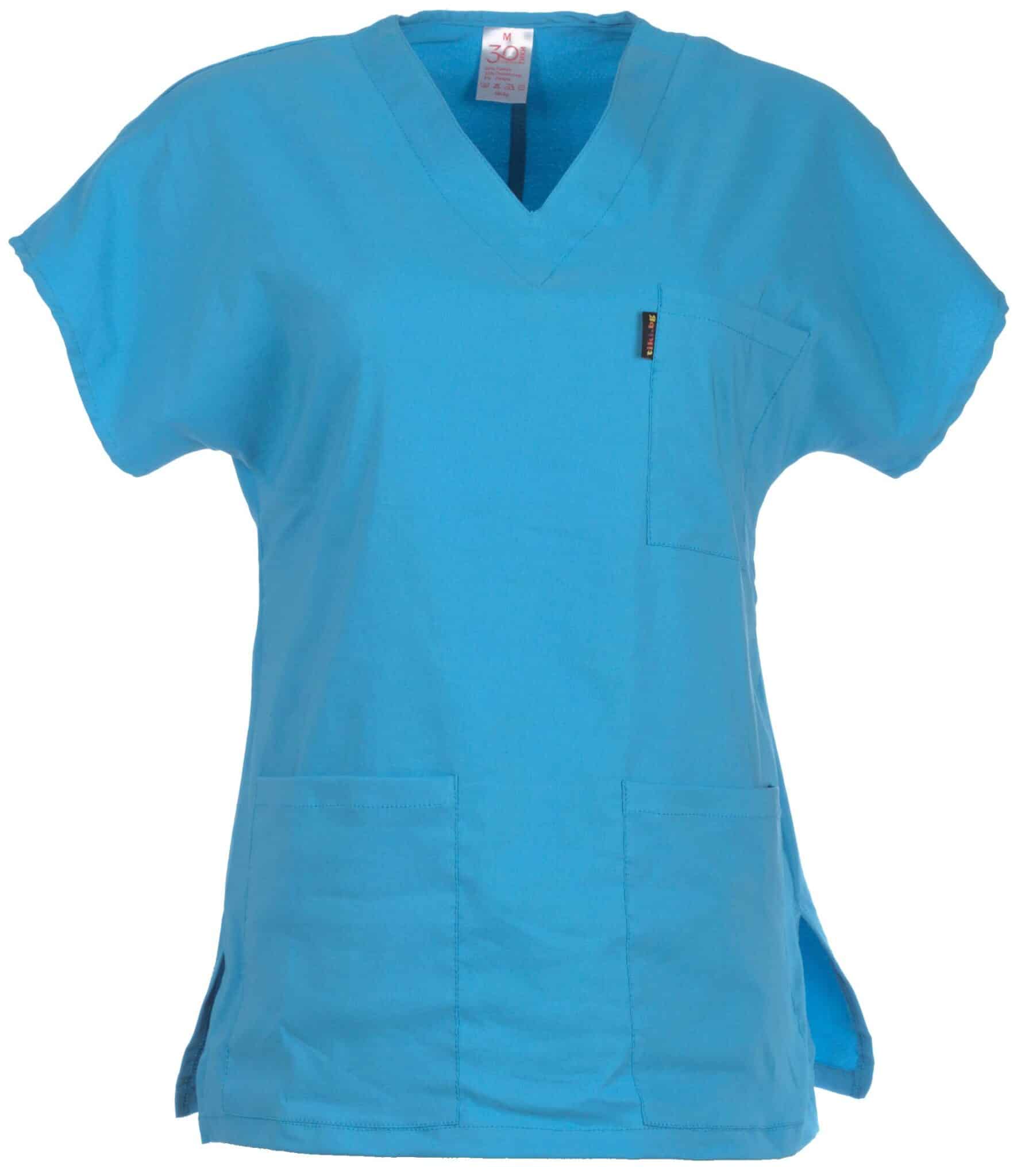Медицински костюм с втален силует, израбтен в цвят тюркоаз от приятна мека материя с еластичност. Състои се от туника с къс ръкав и дълъг панталон. Туниката има остро деколте и три джоба. Панталонът има ластик и връзки на кръста. Снабден е още с два италиански джоба. Костюм втален в цвят тюркоаз е подходящо облекло за медицински и саниратни работници, за персонал в детски заведения, кухни и козметични салони. Можете да поръчате и по отделно вталена медицинска туника в цвят тюркоаз , и панталон втален в цвят тюркоаз. Туника в същия цвят предлагаме и със унисекс свободна кройка. Можете да завършите рабтната си униформа с шапка в цвят тюркоаз.