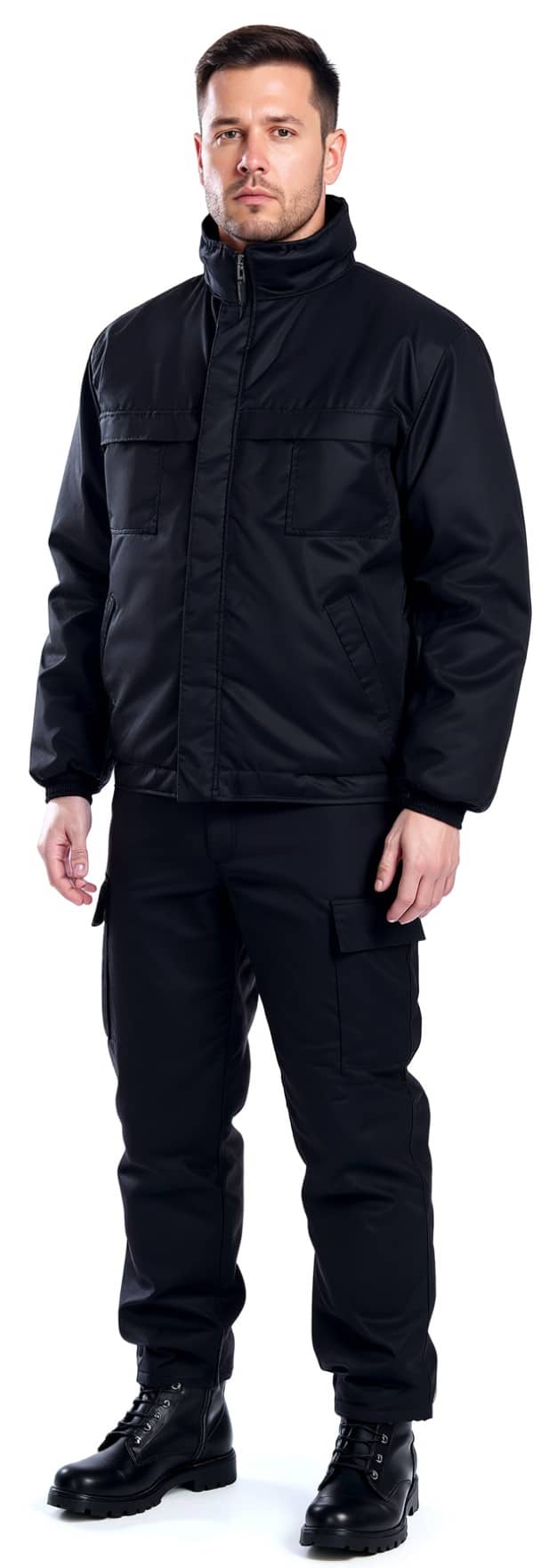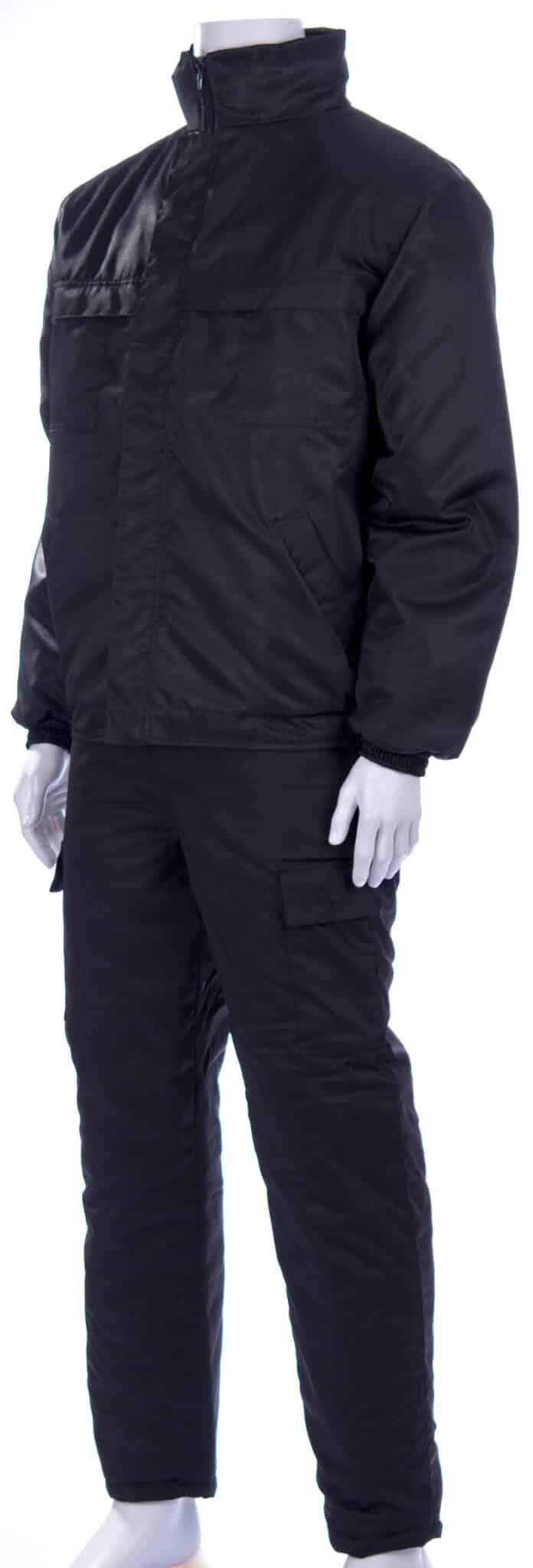 Костюм за охранители ватиран, промазка – съставен от яке и панталон, в черен цвят. Екипът осигурява студо и ветрозащита, изработен е от промазан плат, полиестерен хастар и полиестерна вата с тегло 150 г/м2. Якето има два джоба на гърдите и два странични джоба. Панталонът е с класическа кройка, има два предни италиански джоба, един страничен инструментален и един заден джоб. Богата гама от облекла за охранители с възможност за печат с лого на охранителната фирма. В допълнение към костюма за охранители имаме и плетена шапка за студените зимни дни. Костюм за охранители – ватиран промазка е идеален за печат или компютърна бродерия с надпис Охрана, или лого на клиента.