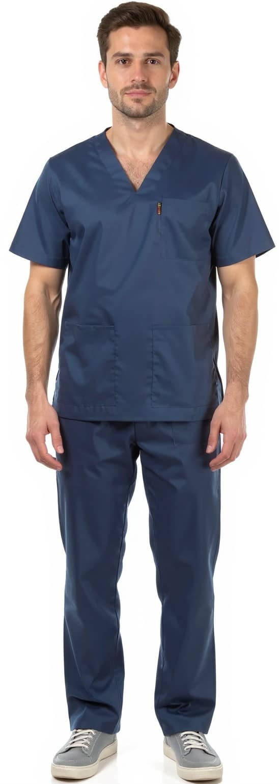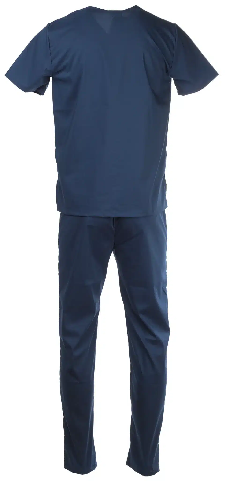 Медицински работен костюм унисекс лукс в цвят нави. Състои се от туника и панталон с права унисекс кройка, която е еднакво подходяща за мъже и за жени. Туниката има остро деколте и три джоба, а панталонът е с ластик в кръста и също има три джоба. Материята е изключително мека, лека и не се мачка. Платът има и разтегливост, което осигурява допълнителен комфорт през многочасовите работни смени. Този модел е отличен избор на работна униформа за всеки медик, за кинезитерапевти, масажисти и много други. Изработваме костюм унисекс лукс освен в цвят нави и в още много други цветове. Може да поръчате от нас и по отделно туника и панталон лукс в цвят нави в различни размери.