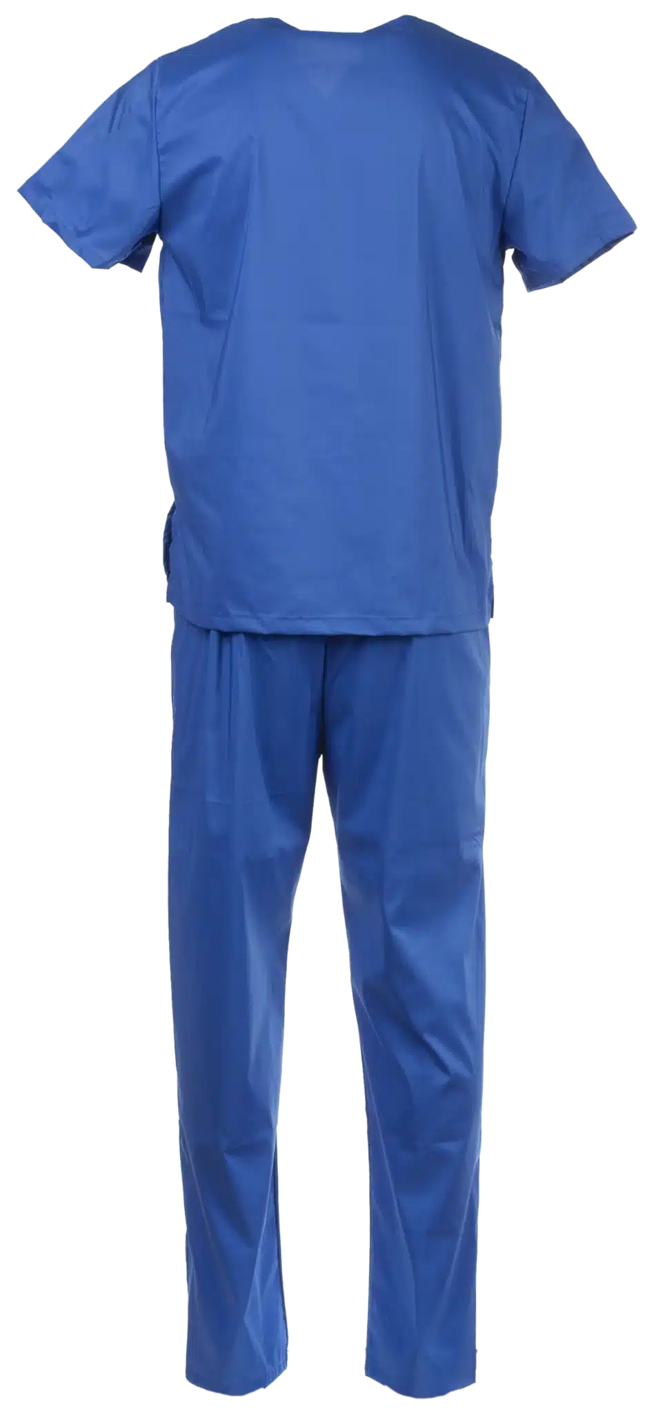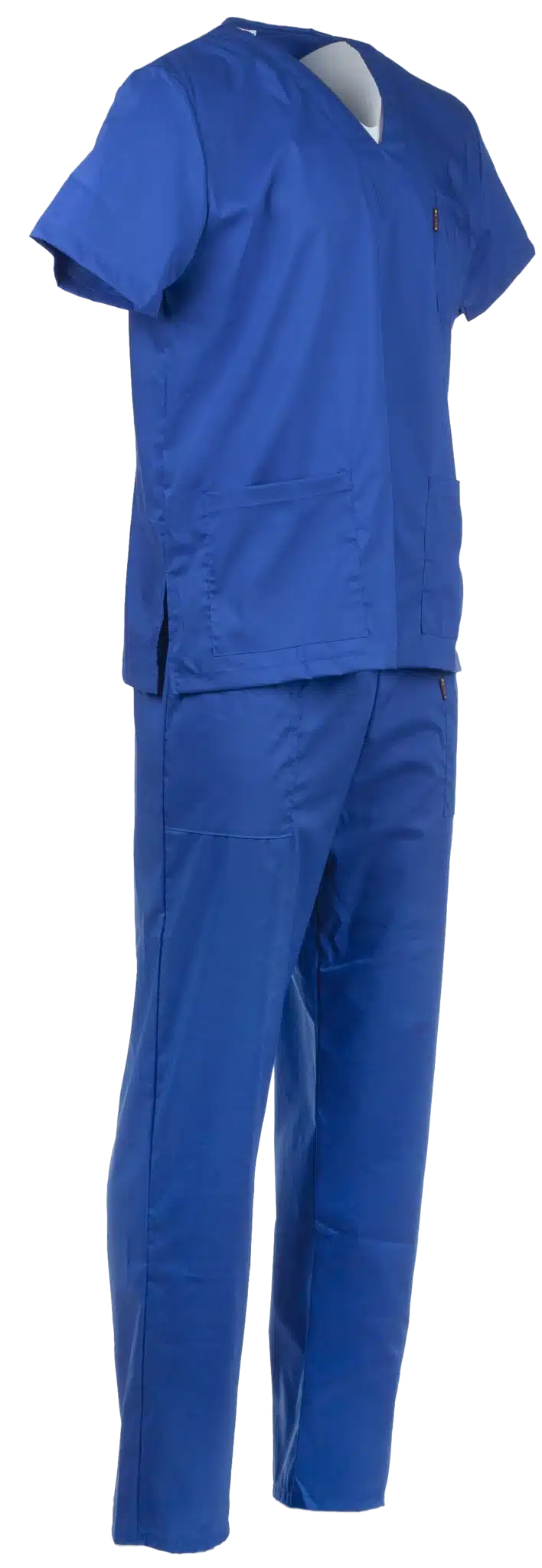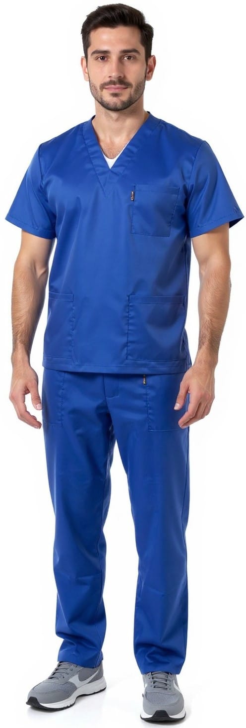 Медицински унисекс лукс костюм в син цвят, състои се от туника и панталон с права кройка. Костюма е изработен от мек плат с еластичност, глади се лесно и не се мачка. Туниката има три джоба, остро деколте и къс ръкав. Панталона е с ластик в кръста, два предни джоба, свободна права кройка. Имате възможност да поръчате медицински унисекс костюм в размери от XS до 4XL. Може да поръчате само туника в син цвят и да комбинирате с медицински панталон от нашата колекция. Както и да поръчате само син панталон, и да комбинирате с едноцветна, или шарена туника.