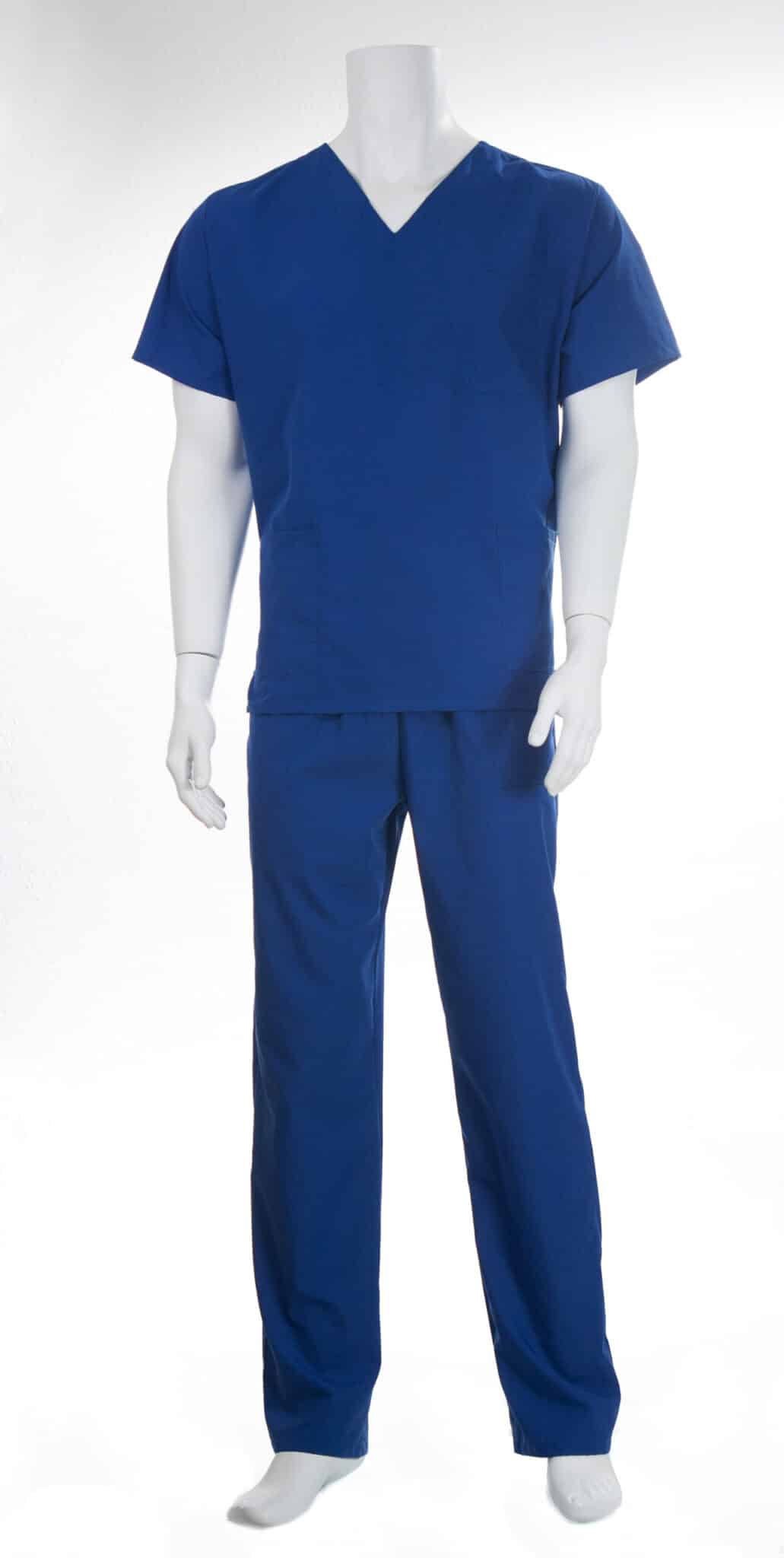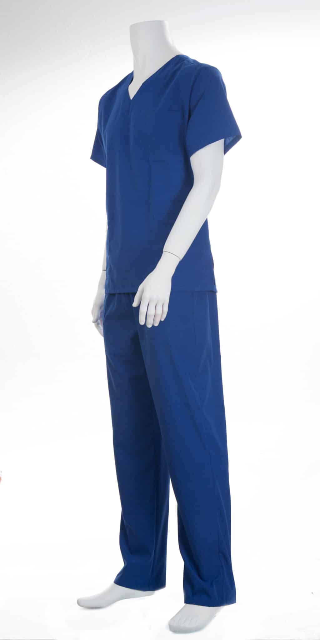 Костюм унисекс в син цвят, състоящ се от туника с къс ръкав и панталон, подходящи за мъже и за жени. Туниката е с остро деколте, два предни джоба и един на гърдите, а панталонът е с ластик в кръста и два предни джоба. Костюмът предлага лекота и удобство при ежедневна и продължителна работа. Съставът на плата позволява многократно изпиране и лесно гладене. Подходящ е за медицински работници, санитарни работници, персонал в детски заведения и др.