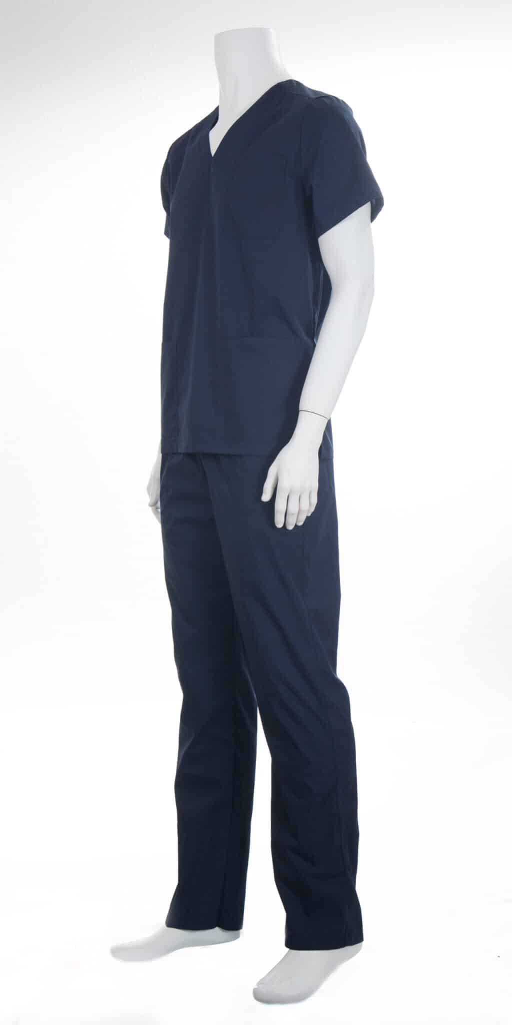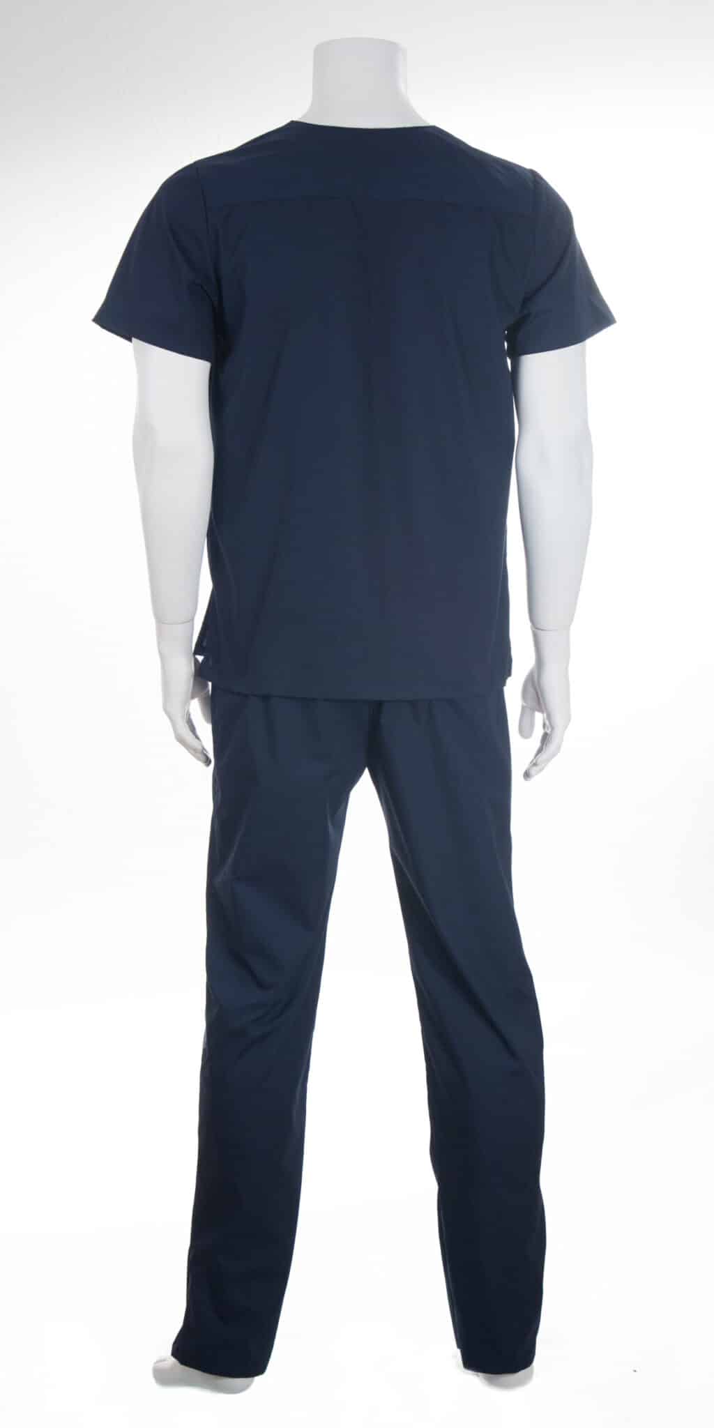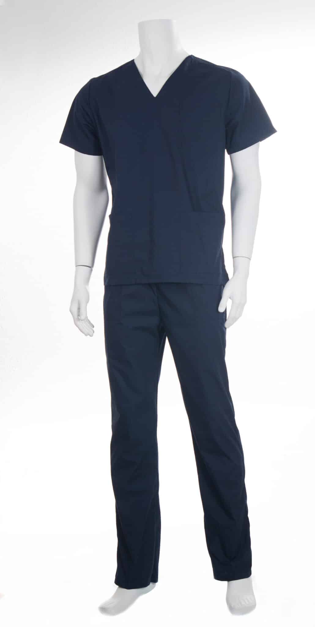 Медицински костюм унисекс – тъмносин, се състои от туника с къс ръкав и панталон с кройка подходяща за мъже и за жени. Туниката е с остро деколте, два предни джоба и един на гърдите, а панталонът е с ластик в кръста и два предни джоба. Костюмът предлага лекота и удобство при ежедневна и продължителна работа. Съставът на плата позволява многократно изпиране и лесно гладене.