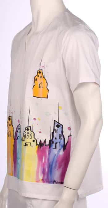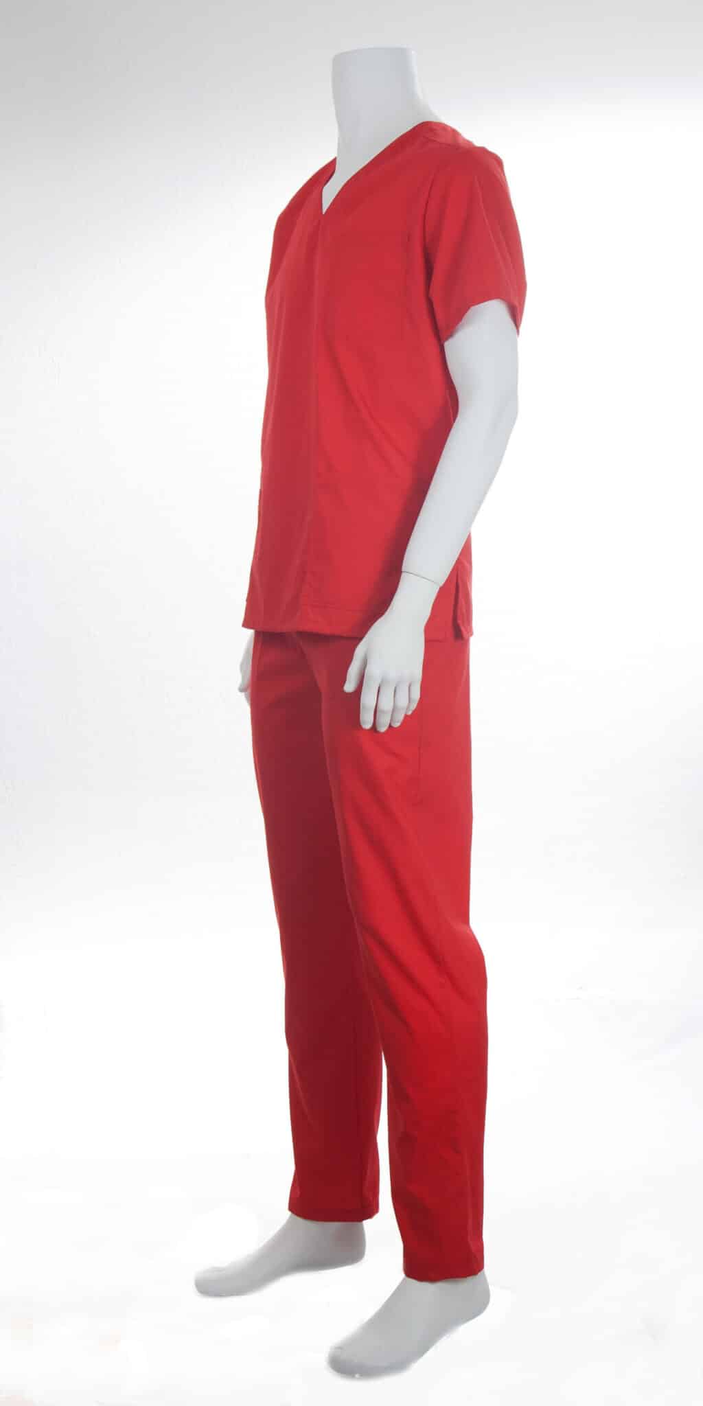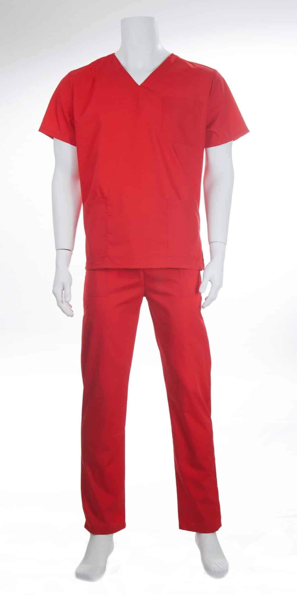 Костюм унисекс – червен. Състои се от туника с къс ръкав и панталон с ластик, подходящи както за мъже, така и за жени. Туниката е с остро деколте, два предни джоба и един на гърдите, а панталонът е с ластик в кръста и два предни джоба. Костюмът предлага лекота и удобство при ежедневна и продължителна работа. Съставът на плата позволява многократно изпиране и лесно гладене. Подходящ е за медицински работници, санитарни работници, персонал в детски заведения, кухни и др.