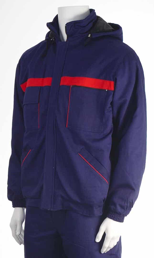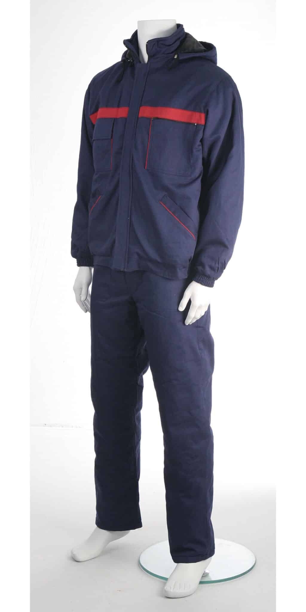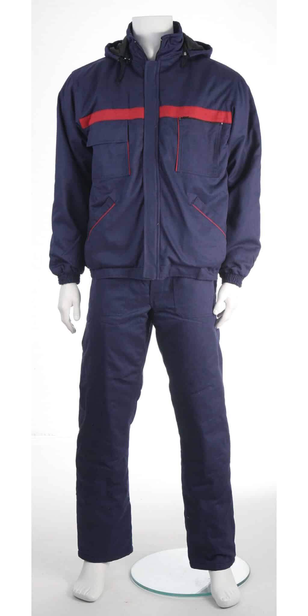 Костюм ватиран Тики от 100% памук в тъмносин цвят с червена гарнитура. Състои се от яке и полугащеризон с полиестерен хастар и полиестерна вата с тегло 150 г/м2.