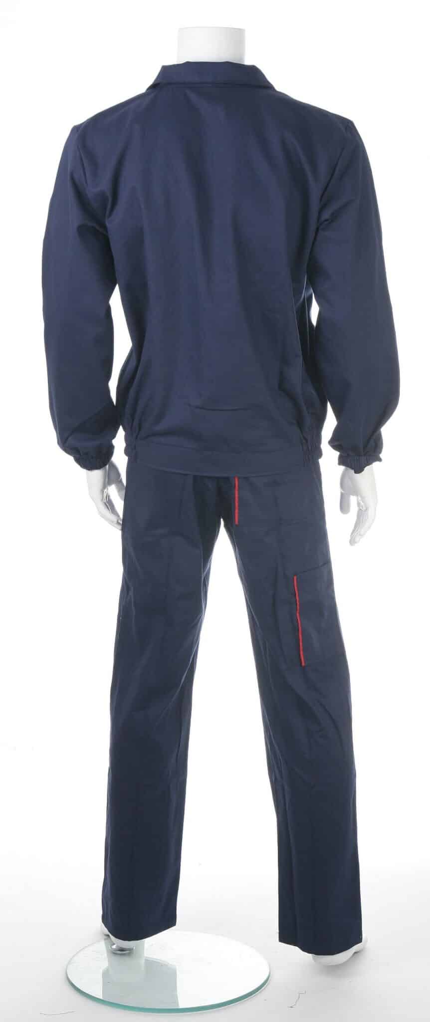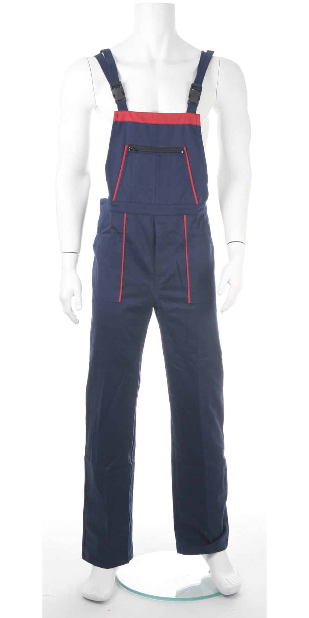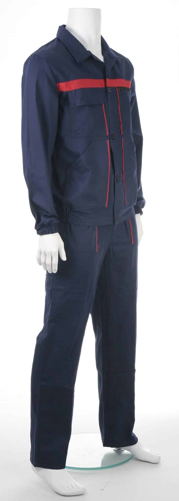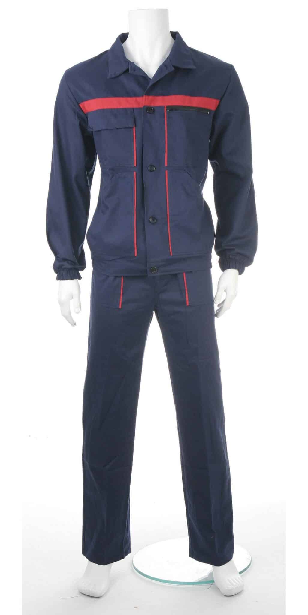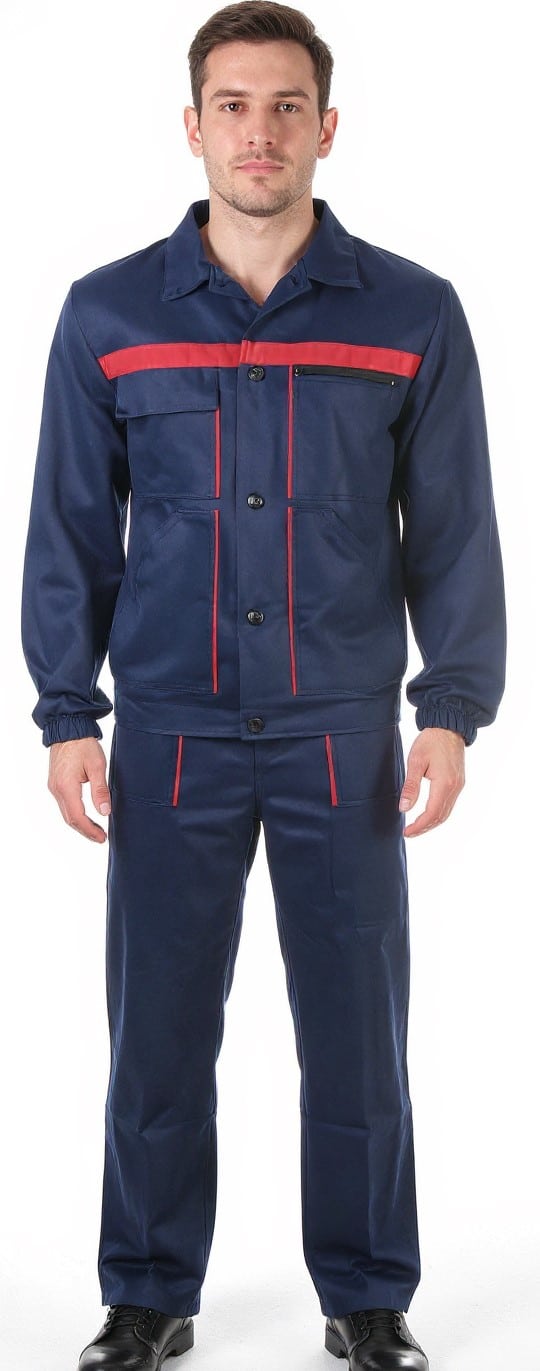 Костюм яке и полугащеризон от 100% памук в тъмносин цвят с червени елементи. Материята е 100% памук с плътност 240 г/м2.