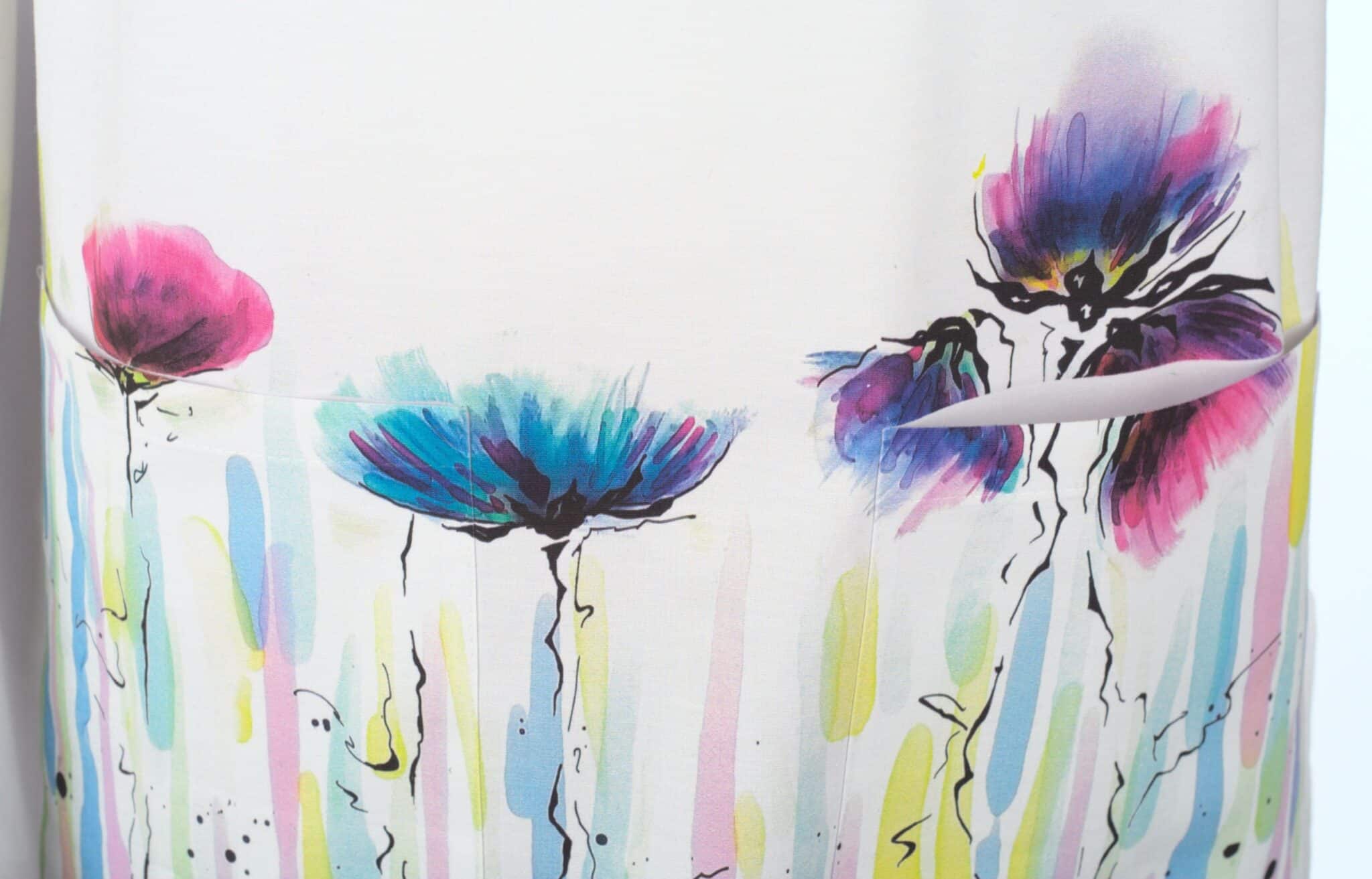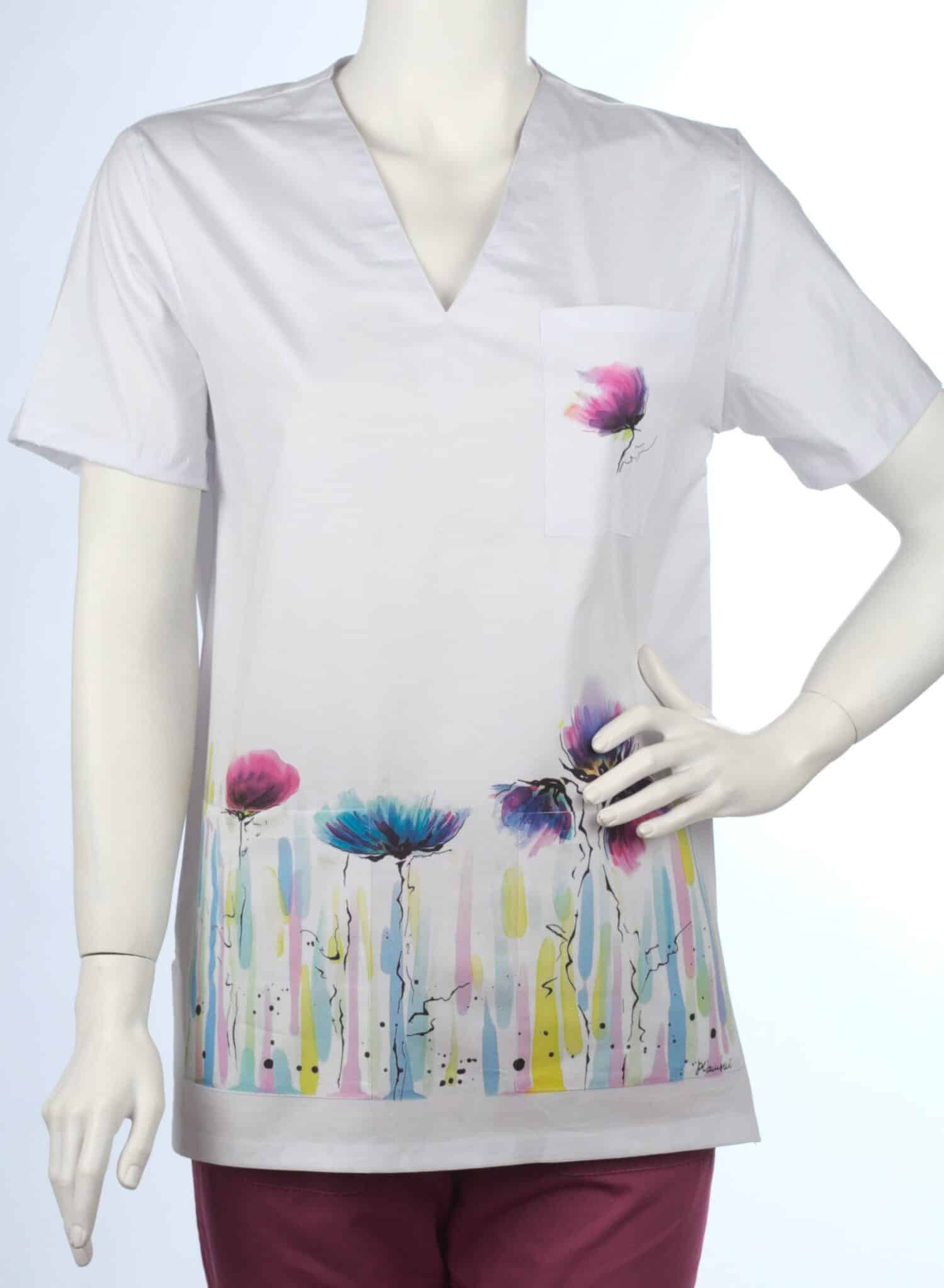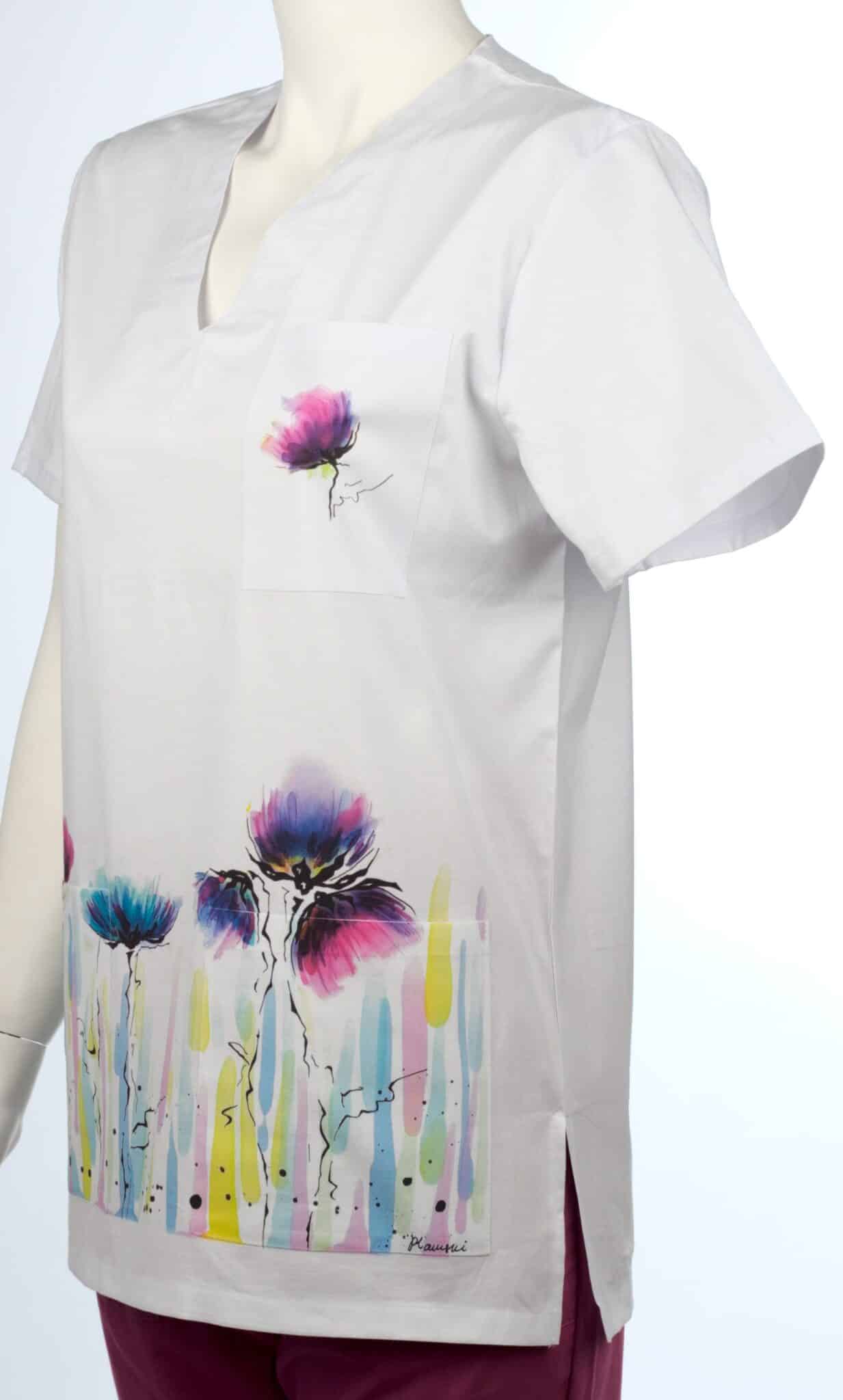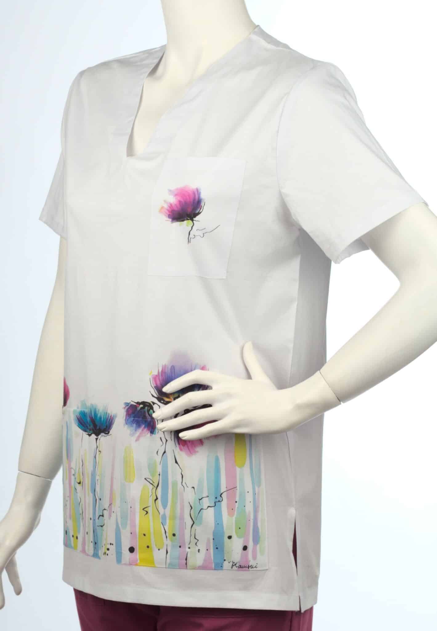 Медицинска туника модел Пламена – Flowers. Изработена е от мек плат в бял цвят със съдържание на памук 97%. Това ви гарантира пълно удобство по време на дългия работен ден. Моделът има универсална кройка. Изображението върху туниката е изработено чрез пълноцветен дигитален печат. Картината на цветя е специална авторска разработка за клиентите на Тики – Работно облеко от художничката Пламена Войнова, позната в интернет пространството под артистичен псевдоним: Art Flambe. На снимката туниката е съчетана с медицински панталон унисекс в цвят малина. Предлагаме персонализиране на туниката чрез добавка на печат с име, поставено на джоба на туниката. Този модел е много подходящ за всеки медик от нежния пол, за фармацевти, за персонал в детски заведения, както и за дами работещи в козметични и фризьорски ателиета. Вижте и други модели с печат на картини от същия автор: туника унисекс Пламена – New Life и туника унисекс Пламена – Buildings