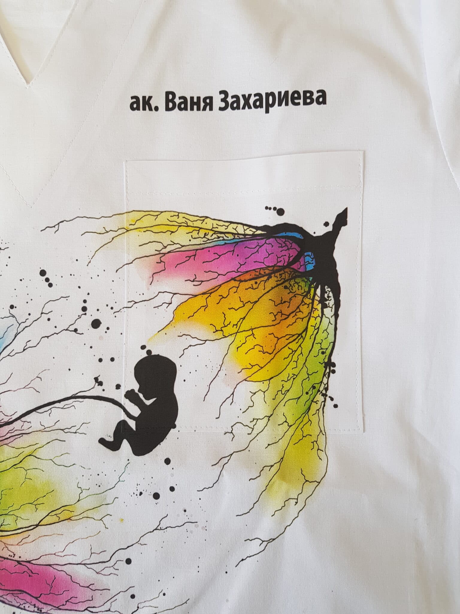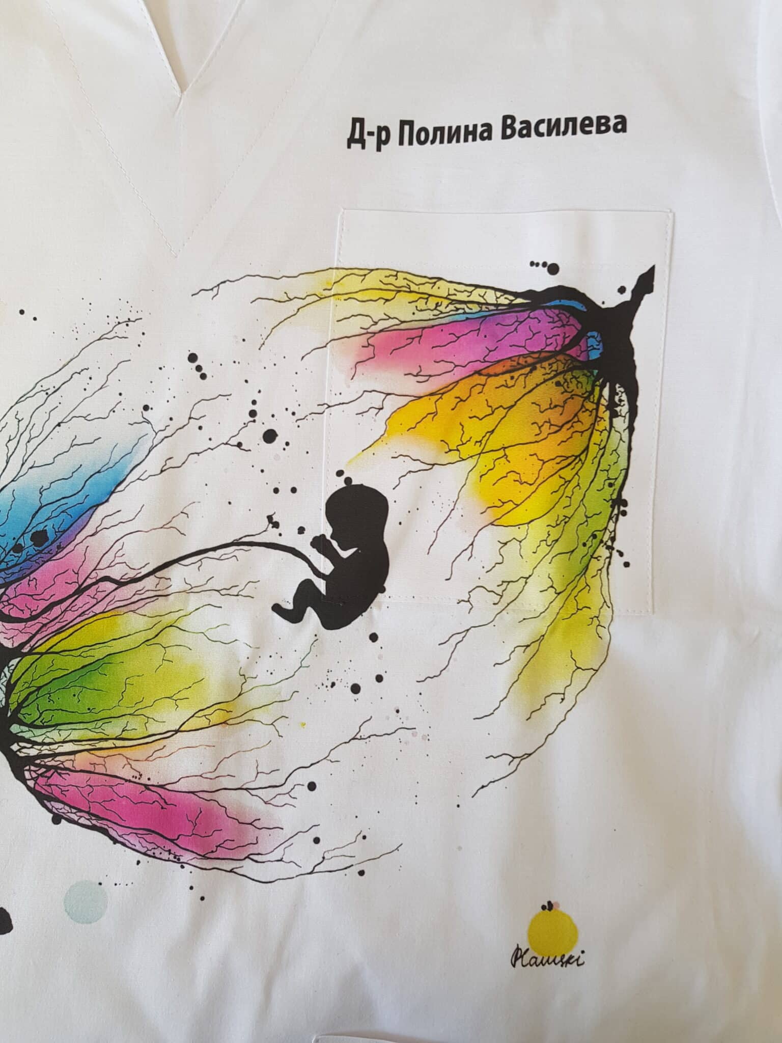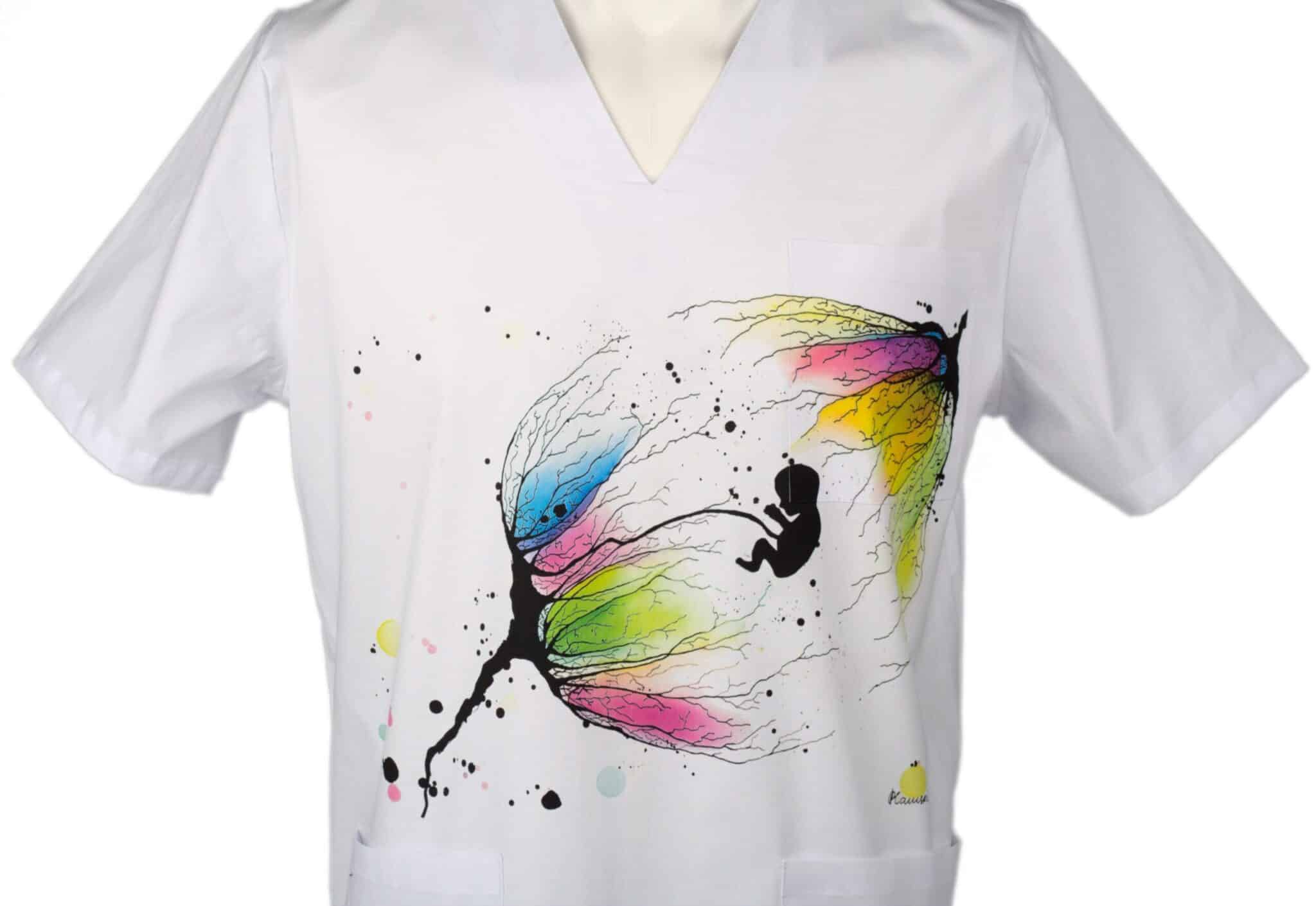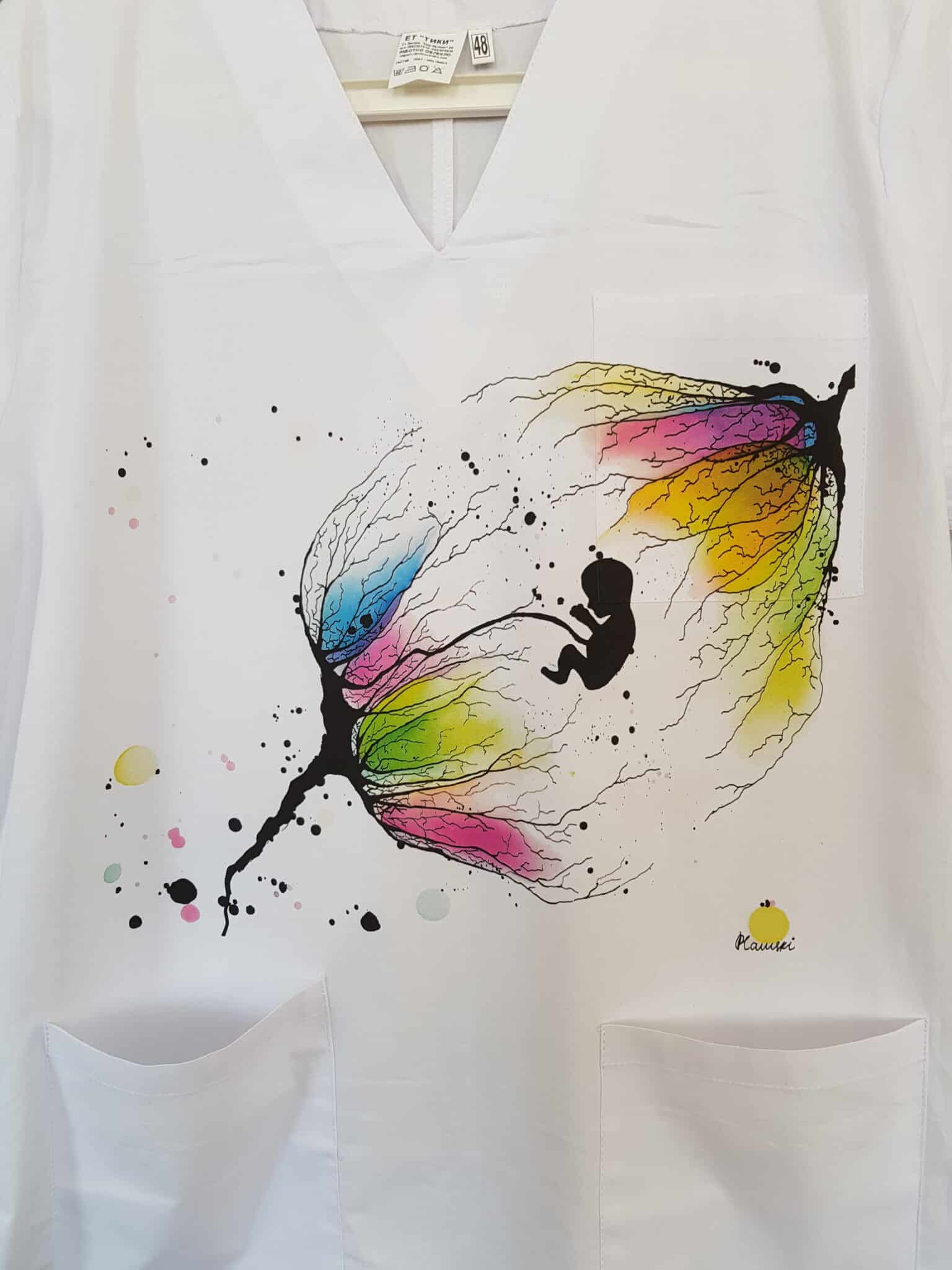 Медицинска туника унисекс модел Пламена – New Life. Изработена е от много мек плат в бял цвят със съдържание на памук 97%, което ви гарантира усещане за комфорт през работния ден. Кройката на модела е универсална и поради това туниката е еднакво подходяща за мъже и за жени. Изображението върху туниката е отпечатано чрез пълноцветен дигитален печат. Картината е специална авторска разработка за клиентите на Тики – Работно облеко от художничката Пламена Войнова, позната в интернет пространството под артистичен псевдоним: Art Flambe. Тъй като печатът е многоцветен, туниката може да бъде съчетана с различни по цвят модели панталон унисекс. Много подходящ избор на облекло е за персонал в ин витро центрове, или в АГ клиники и отделения. Предлагаме персонализиране на туниката чрез добавка на печат с име, поставено над горния джоб. Вижте и други модели с печат на картини от същия автор: Медицинска туника Пламена – Buildings и медицинска туника Пламена – Flowers.