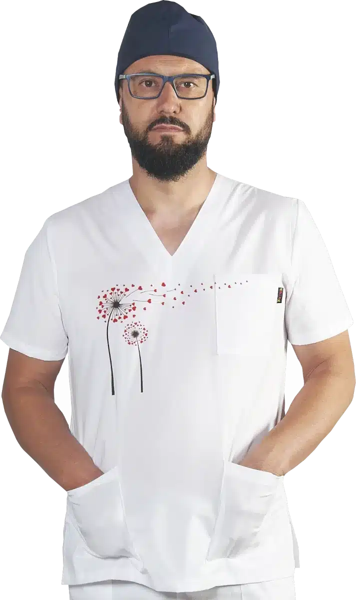 Работна медицинска туника унисекс в бял цвят с печат глухарче. Изработена е с права универсална кройка и е еднакво подходяща за мъже и за дами. Има остро деколте и три джоба. Материята е с високо съдържание на памук, мека на допир и осигуряваща комфорт по време на работа. Може да поръчате туниката и в съчетание с панталон унисекс с печат глухарче. Предлагаме освен туника унисекс с печат глухарче, също и дамска вталена туника с печат глухарче. Моделите ни са подходящи още за персонал в детски заведения, в спа центрове, в салони за красота и други.