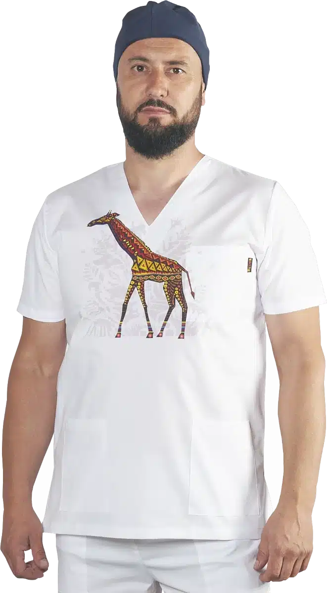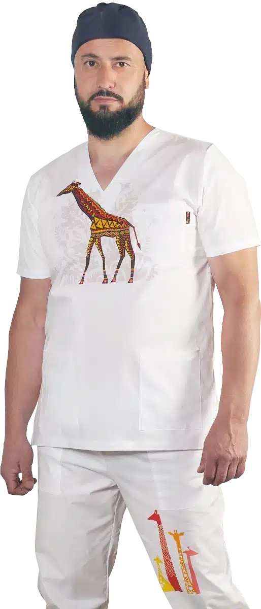 Медицински костюм унисекс с дигитален печат картинка жираф отпред на туниката и на крачола на панталона. Свежо и оригинално предложение за работна униформа на всеки ветеринар или педиатър. Медицински костюм с печат жираф е еднакво подходящ както за мъже, така и за дами. Кройката е права и универсална. Туниката има остро деколте и три джоба, а панталонът има ластик в кръста и два джоба отпред. Материята е с високо съдържание на памук, поради което не запарва и осигурява комфорт през многочасовите работни смени.
