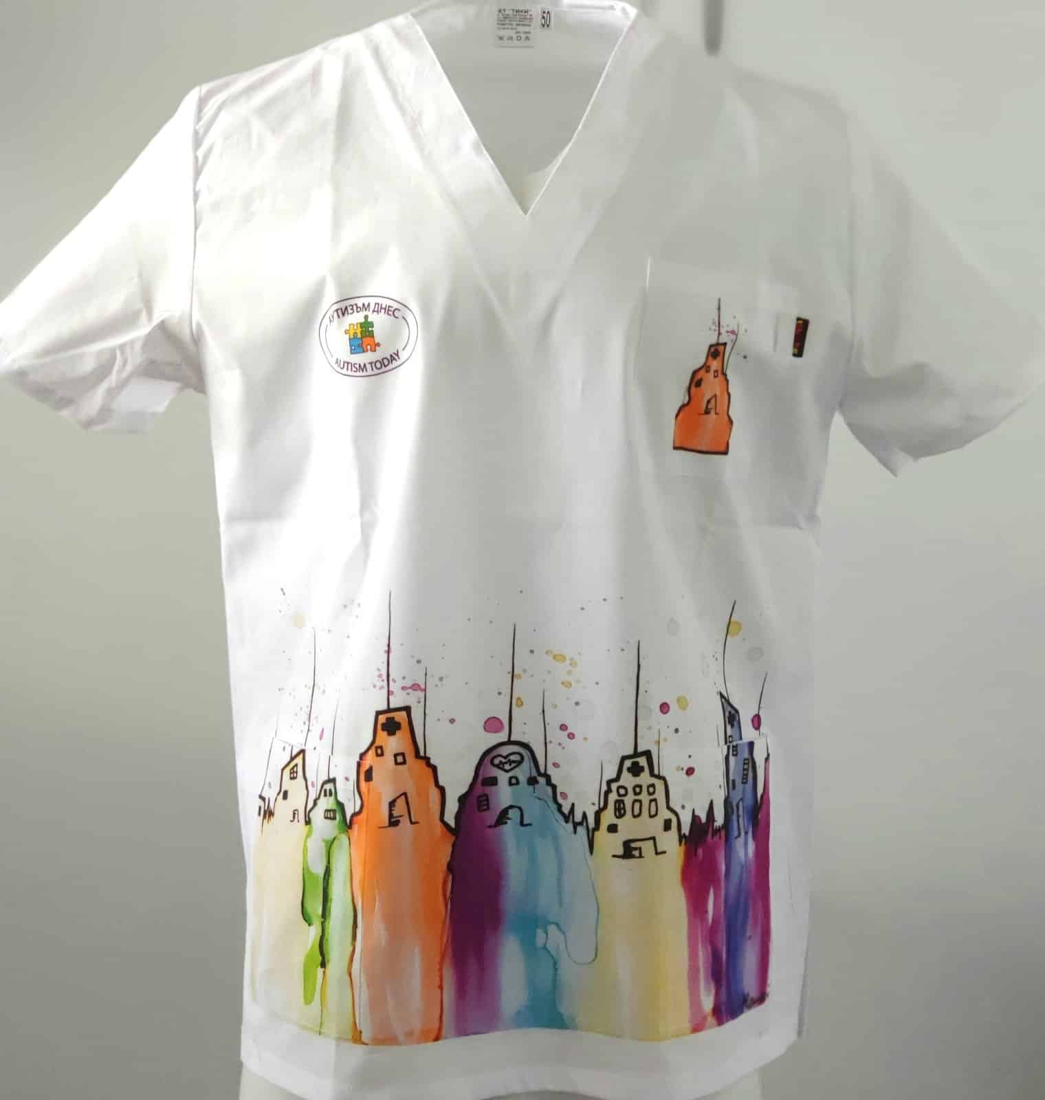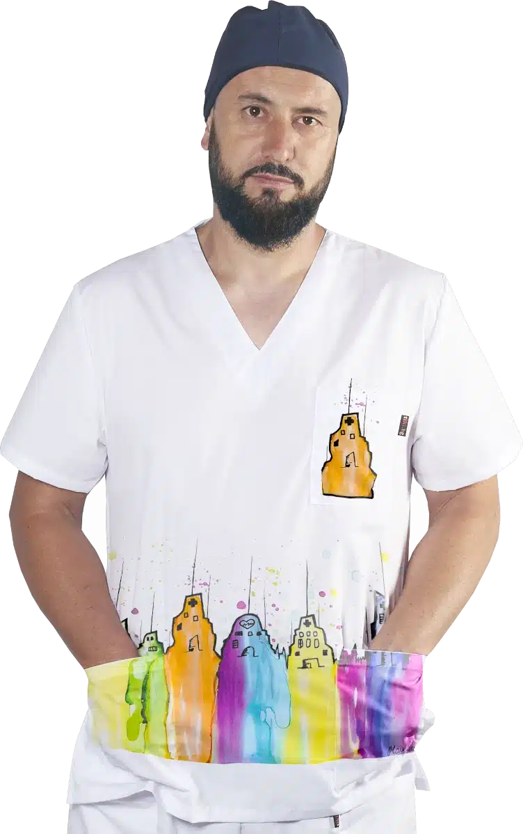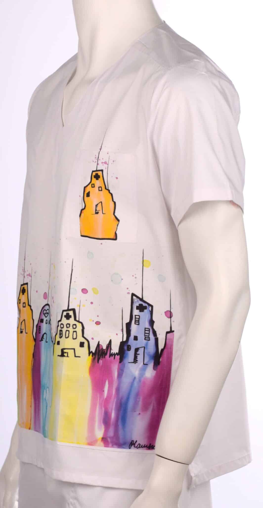 Медицинска туника модел Пламена – Buildings. Изработена е в бял цвят от много мек плат със съдържание на памук 97%, което ви гарантира усещане за комфорт през целия работен ден. Моделът има унисекс кройка и поради това е еднакво подходящ за мъже и за жени. Изображението върху туниката е отпечатано чрез пълноцветен дигитален печат. Картината на сгради е специална авторска разработка за клиентите на Тики – Работно облеко от художничката Пламена Войнова, позната в интернет пространството под артистичен псевдоним: Art Flambe. На снимката туниката е съчетана с медицински панталон унисекс в бял цвят. Предлагаме персонализиране на туниката чрез добавка на печат с име, поставено над горния джоб. Този модел е подходящо облекло за всеки медицински работник, за персонал в детски заведения, в козметични и фризьорски ателиета, в спа центрове и други. Вижте и други модели с картини от същия автор: Медицинска туника Пламена – New Life и медицинска туника Пламена – Flowers.